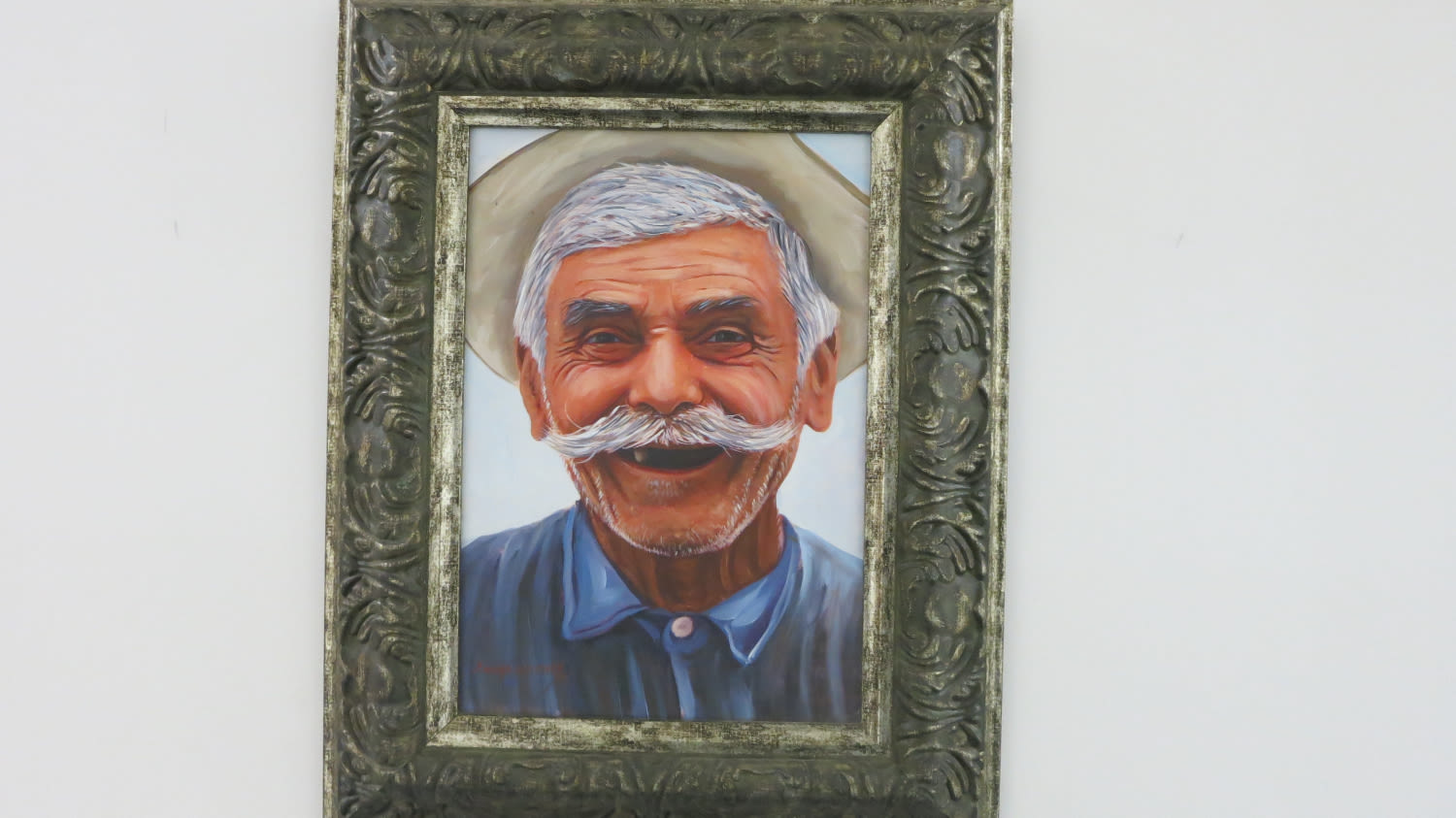 Ornately framed portrait depicting the character of a happy man with one tooth by a Greek artist.