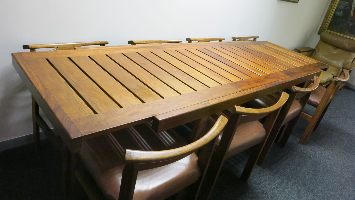 This solid wood table has matching chairs designed by John Tabraham who was the designer of choice for many premium South African furniture manufacturers during the 1950’s and 60’s. These items were manufactured by Kallenbach’s. The chairs could be reupholstered. Table Size Length Extended: 267cm Length Standard: 198cm Height 73cm Width 83cm