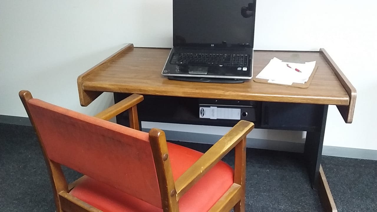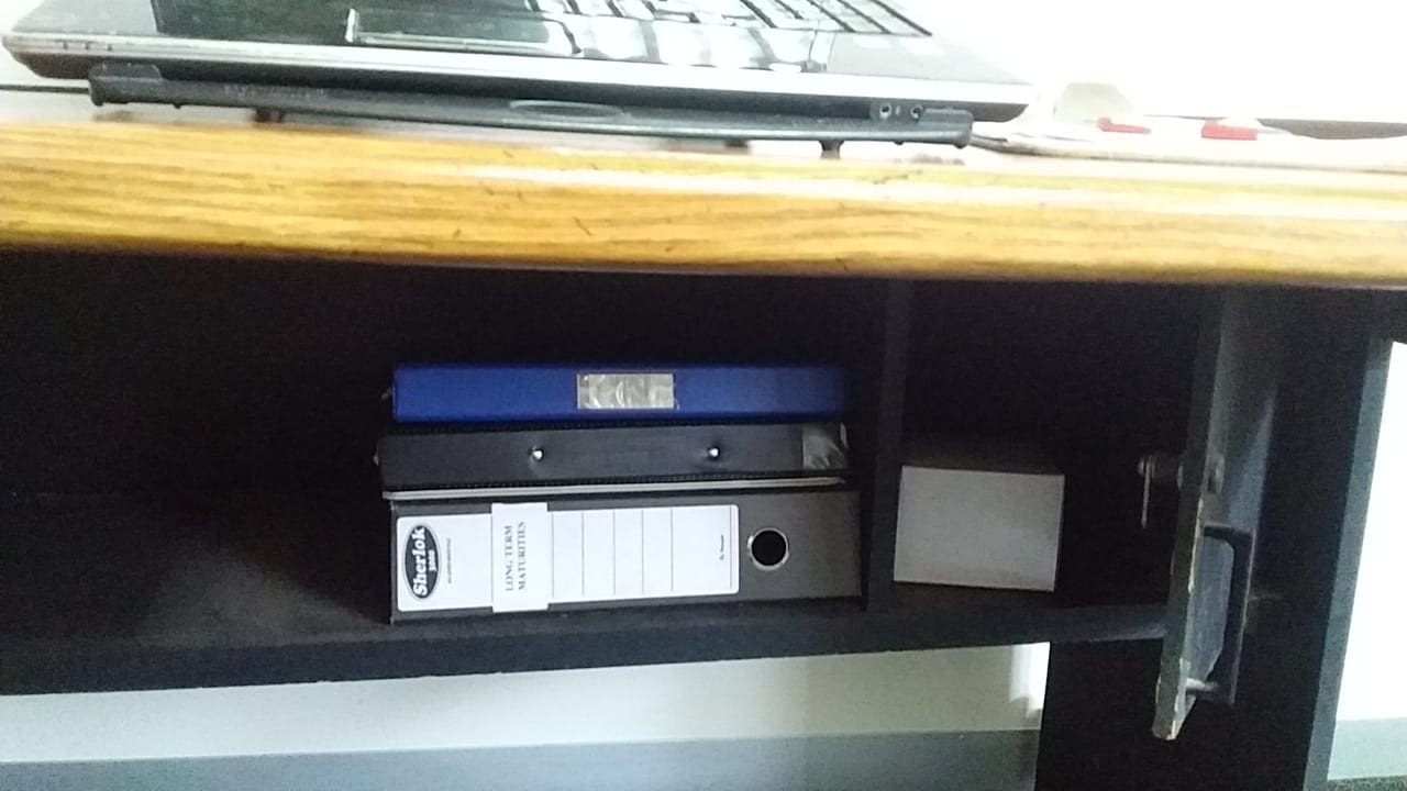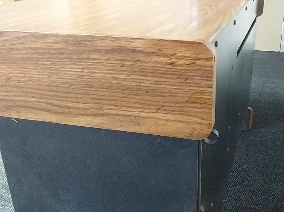 With a built in shelf and lockable cupboard (needing a new lock). This is a used item and show signs of wear and is priced accordingly.