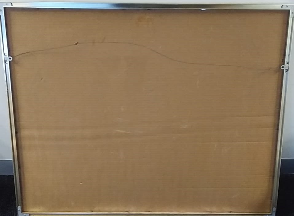Decorative artwork depicting a landscape with a road disappearing over a rise and fields leading to mountains on the horizon with clouds rolling-in. Signed, behind glass in a frame. Condition is good.