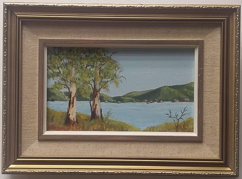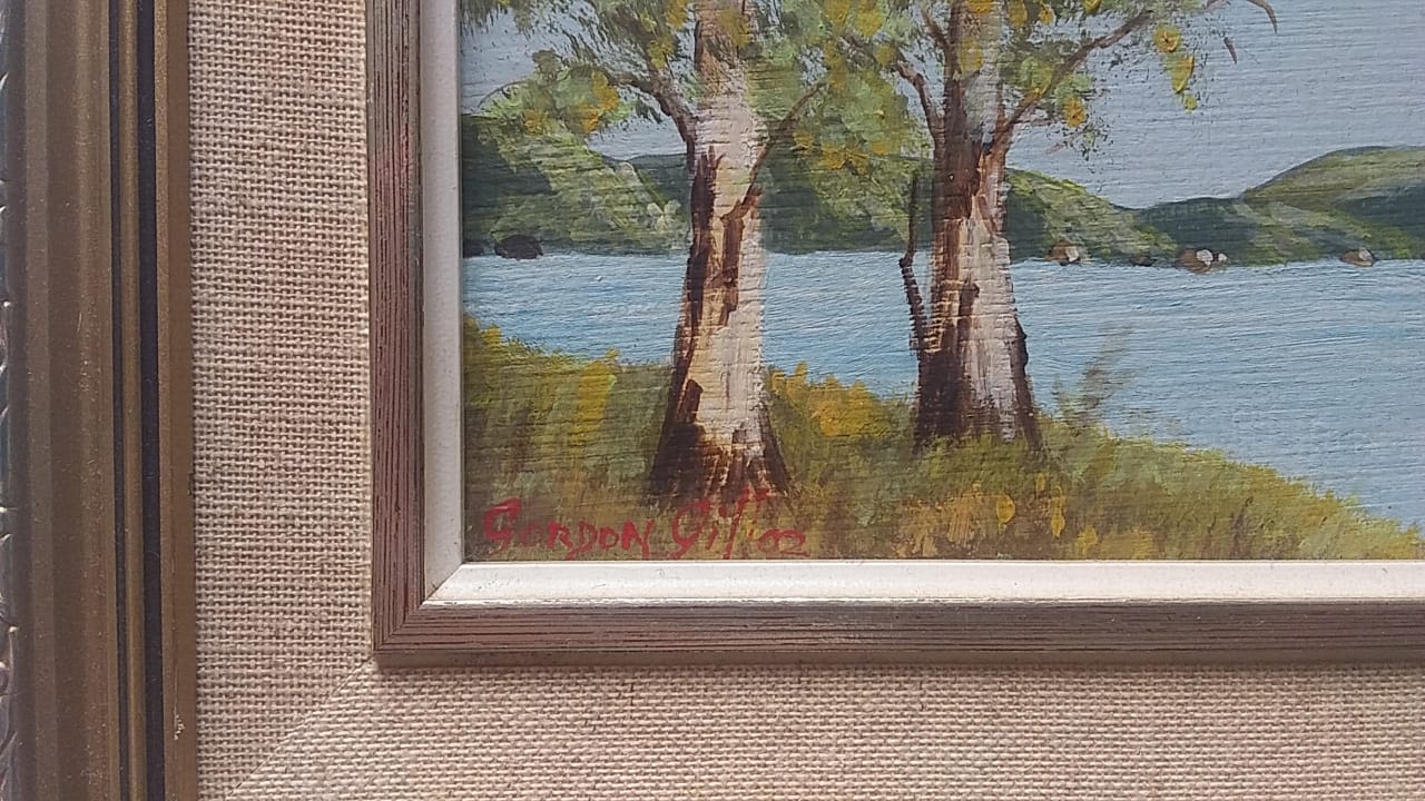 REDUCED - Signed Original Oil Painting on Board Depicting Blue Gumtrees and a Large Body of Water with Mountains in the Background By Gordon Gill.