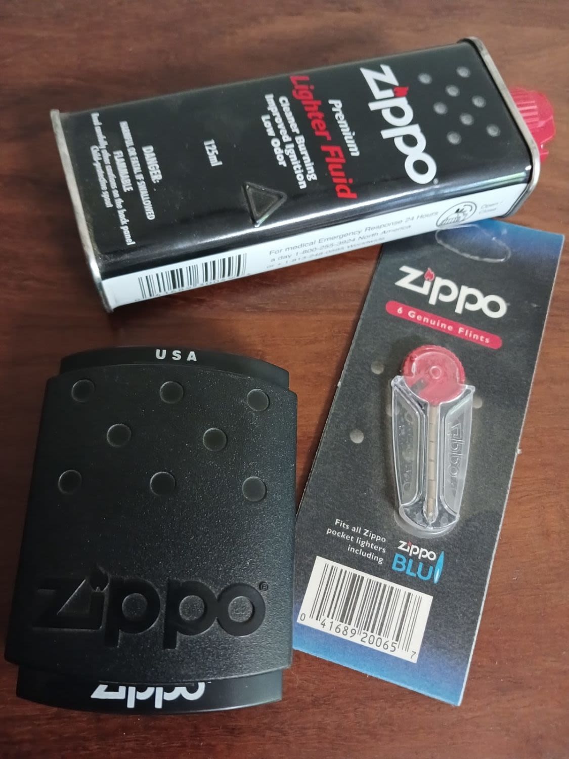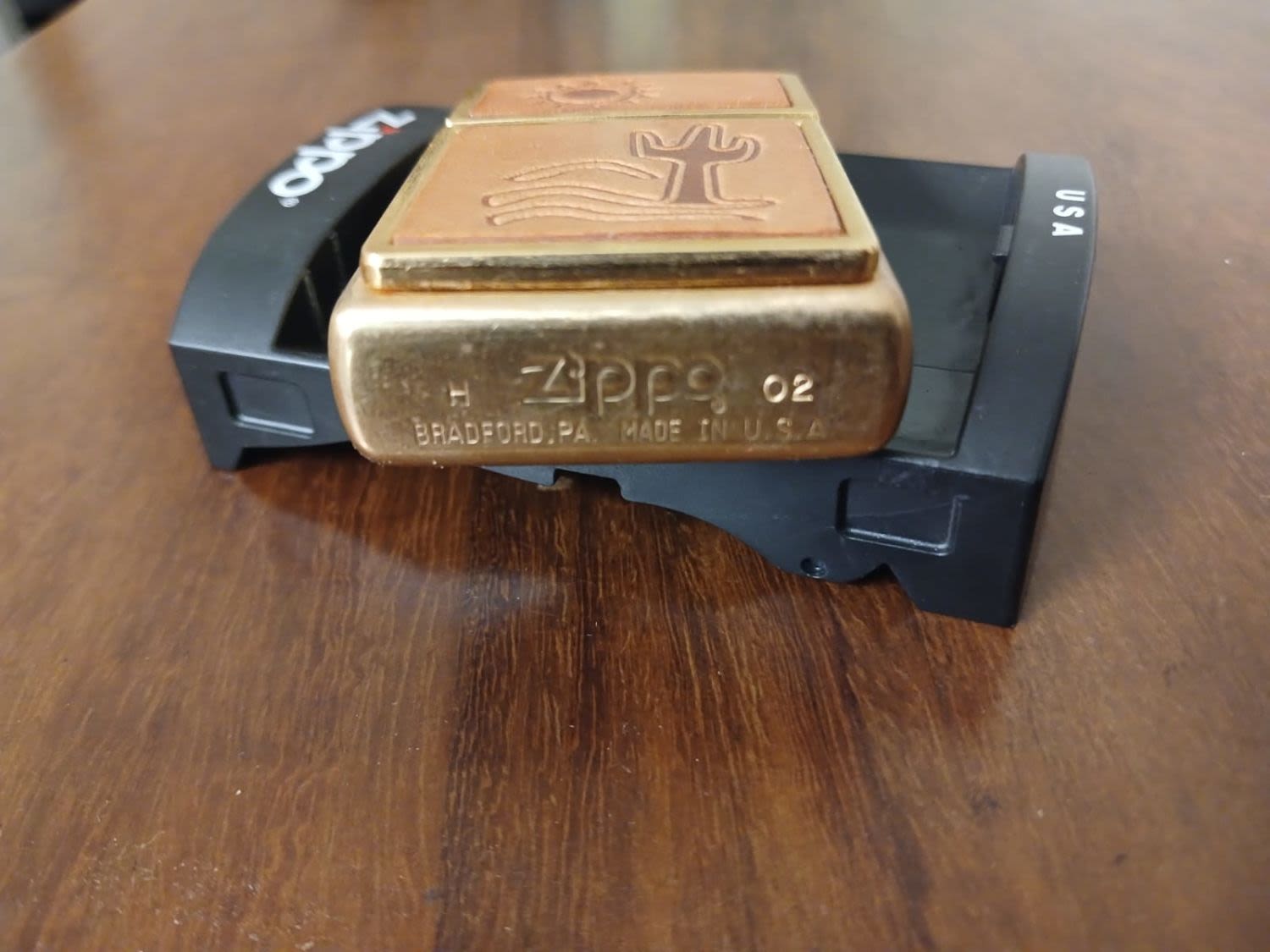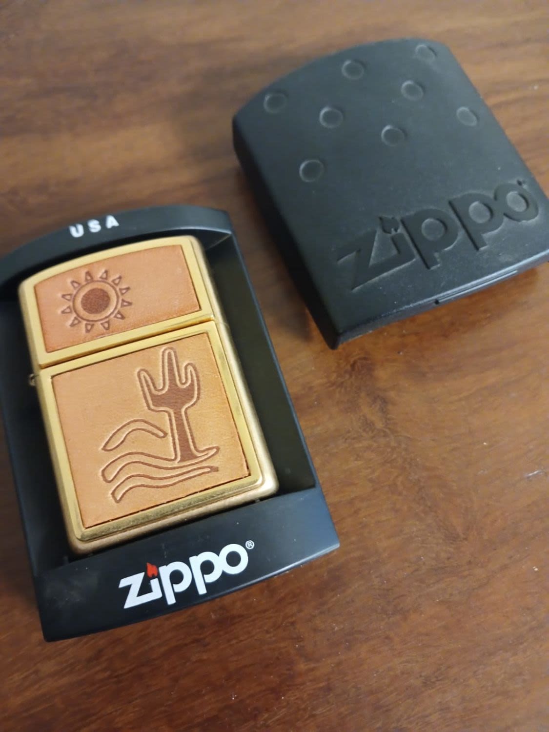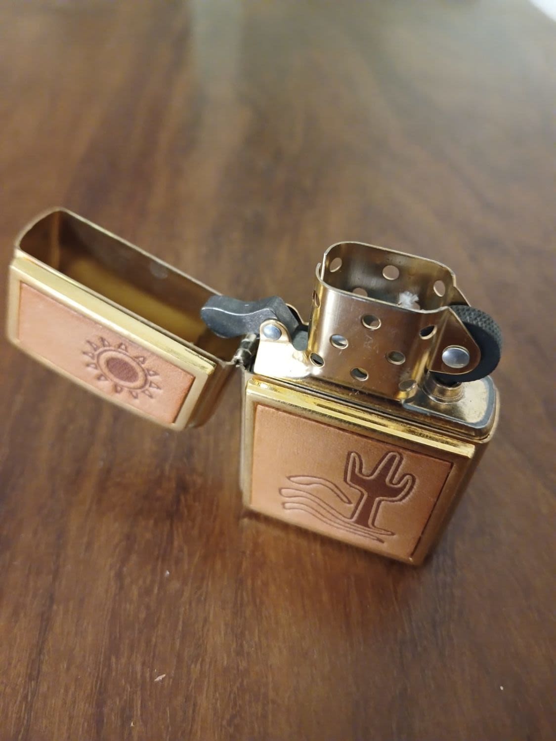 Genuine leather High Noon design emblem on brushed brass finish.. Mint condition in original box, unlit. Supplied with a pack of Zippo flints and fluid, some appears to have evaporated.