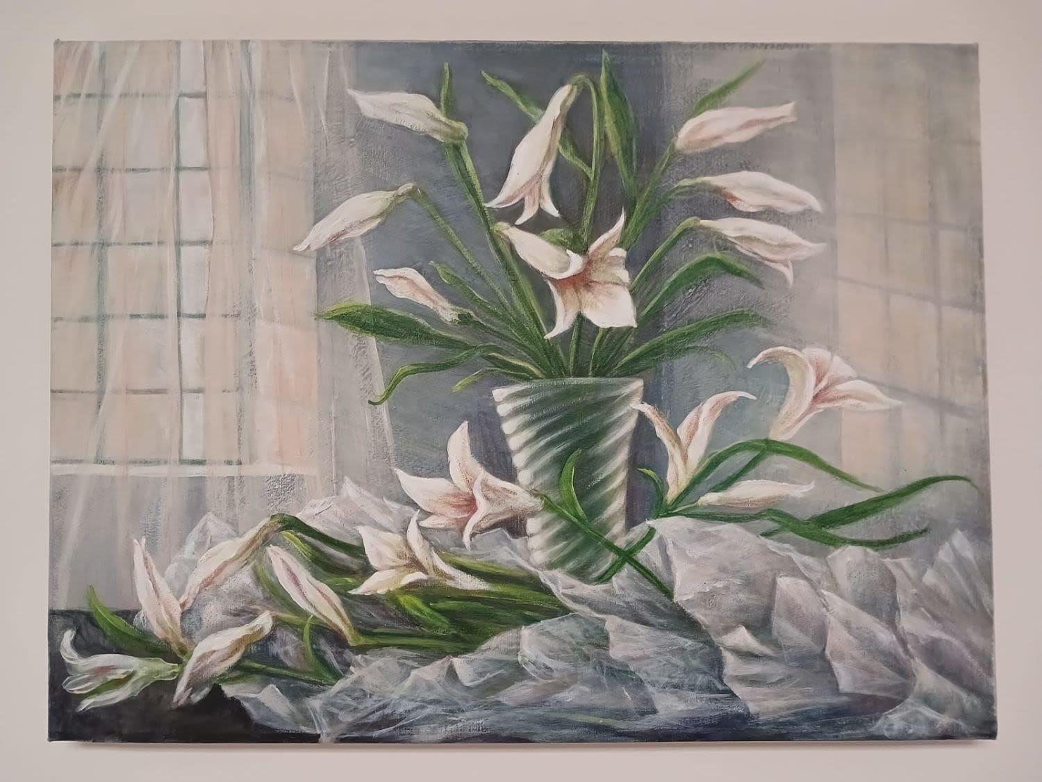 REDUCED - Still Life Oil Painting on Canvas, A Vase with St Joseph Lilies by an Open Window. Unframed. Signed By Sandy de Villiers (1947-2023). - STC.