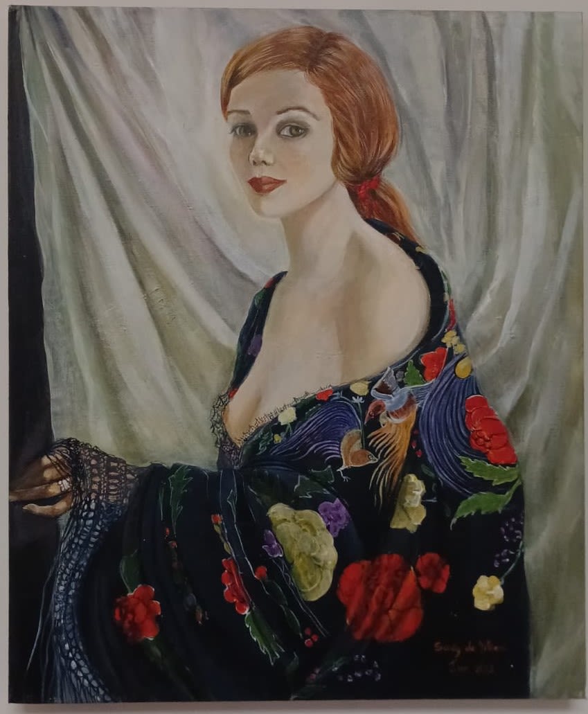 This work captures the essence of feminine beauty and sensuality The lady’s partially revealed figure in an elaborate garment is delicately rendered with a play of light and shadow, creating a sense of depth and realism. Her expression and body language exude confidence and allure, drawing the viewer into her mesmerizing gaze.