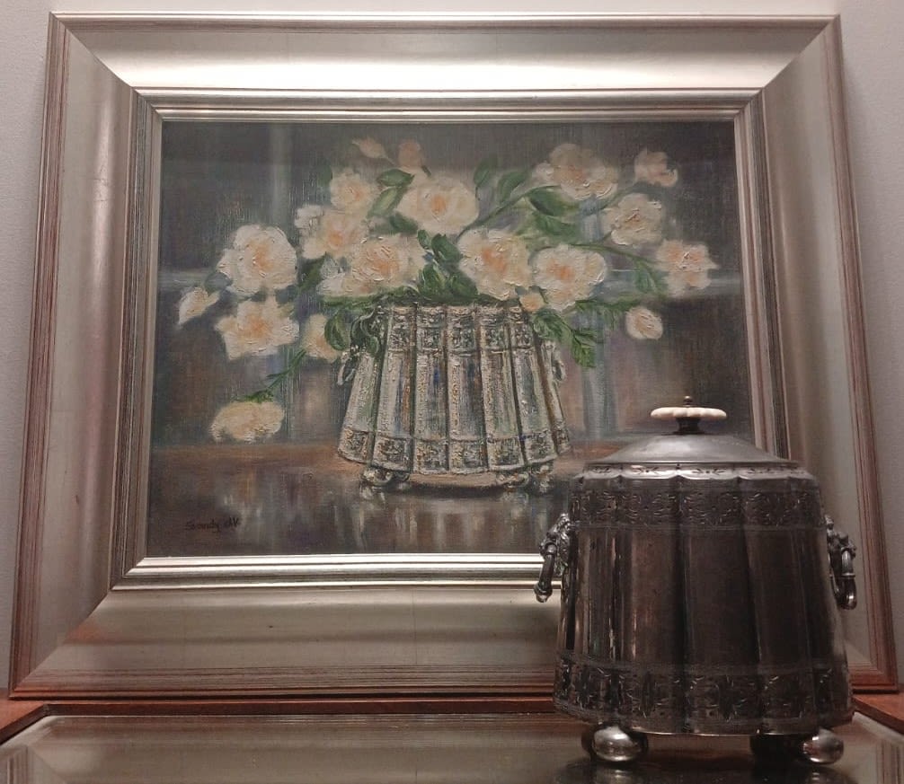 Featuring a beautiful arrangement of roses in a silver plated tea caddy as its subject. The artist, Sandy de Villiers, has meticulously captured the delicate beauty of the roses and the elegant shine of the silver-plated tea caddy in this artwork. The painting is done in oil medium, providing rich and vibrant colors that add depth and realism to the composition.
