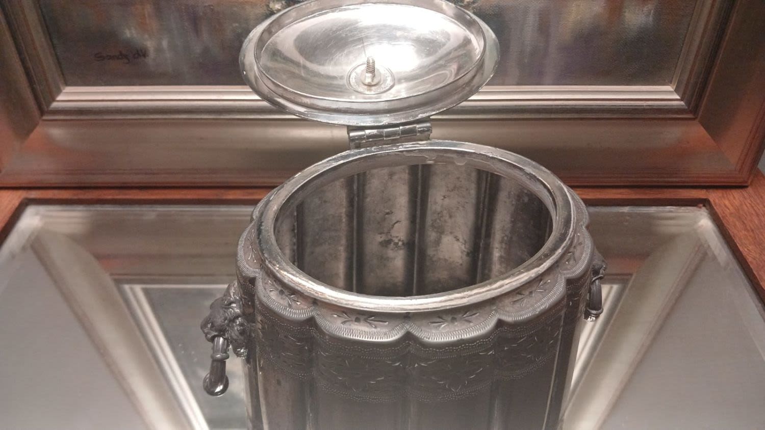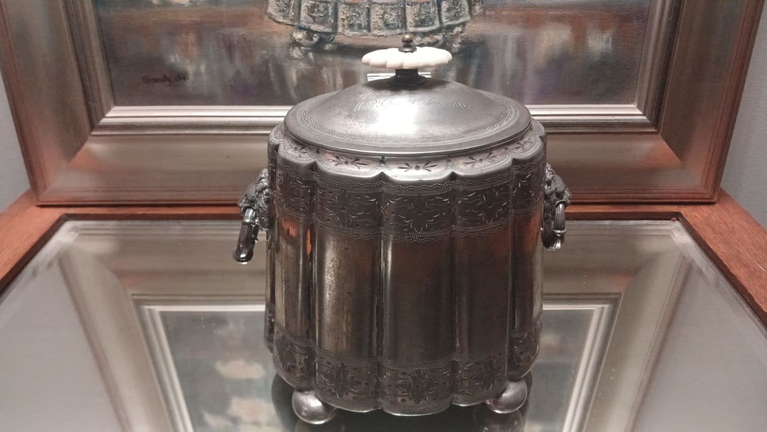 Tea Caddy & Original Still Life Oil Painting on Canvas Covered Board of Roses in the Silver Plated Tea Caddy for sale with the Subject. Framed and Signed by By Sandy de Villiers (1947-2023).