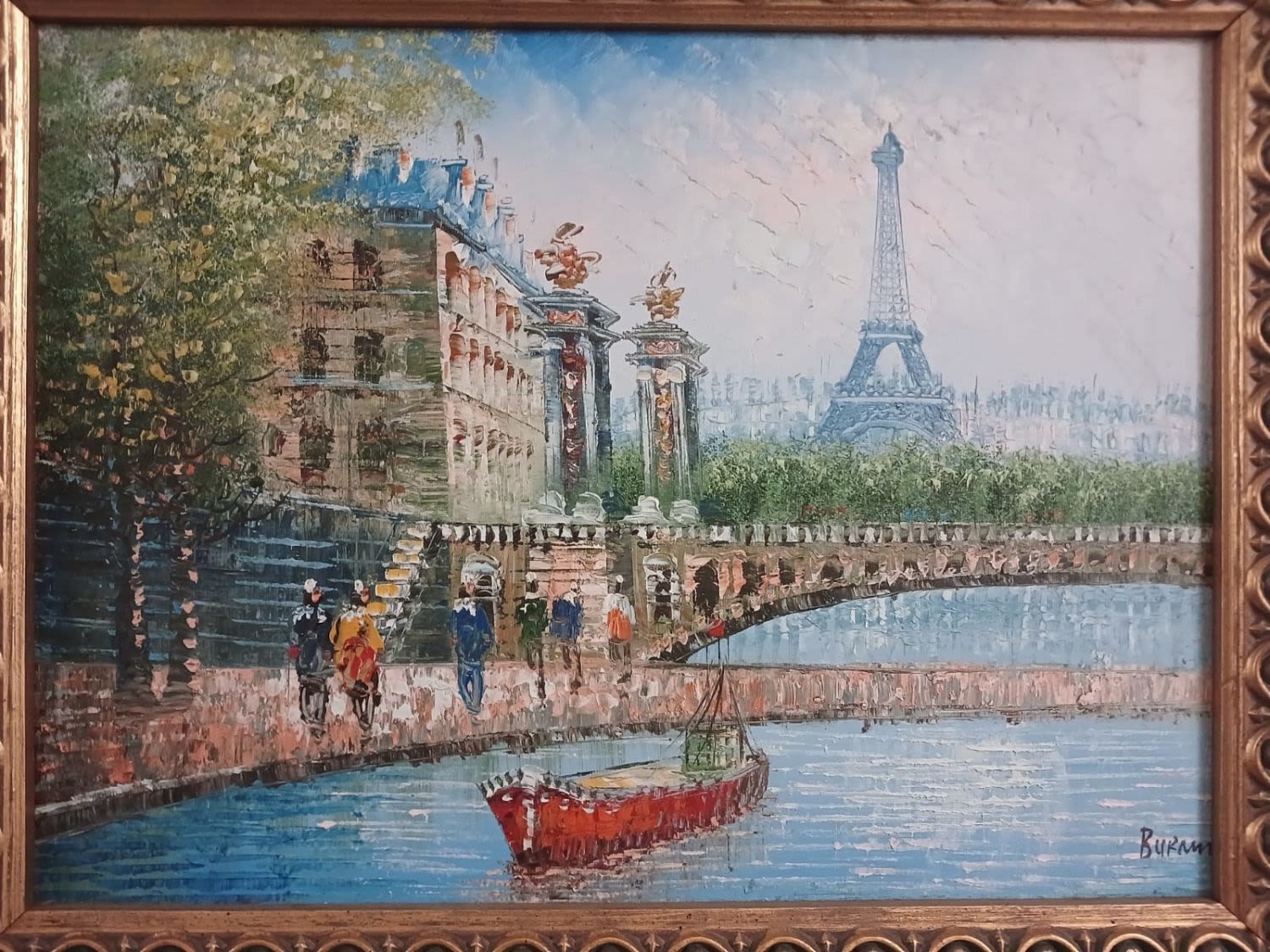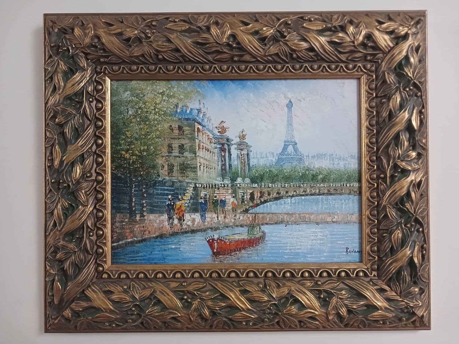 The vibrant strokes of color come to life in this pallet knife painting that captures the essence of the Rhine River. In the foreground, a graceful boat glides through the water, its form expertly rendered with the distinctive textures created by the artist’s skilled use of palette knives. The Eiffel Tower stands tall and elegant in the background, its iconic silhouette framed by a soft, dreamy sky. The juxtaposition of the serene river and the towering landmark invokes a sense of timelessness and wanderlust, inviting viewers to embark on a journey to the heart of Europe.