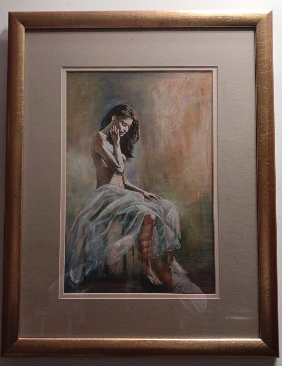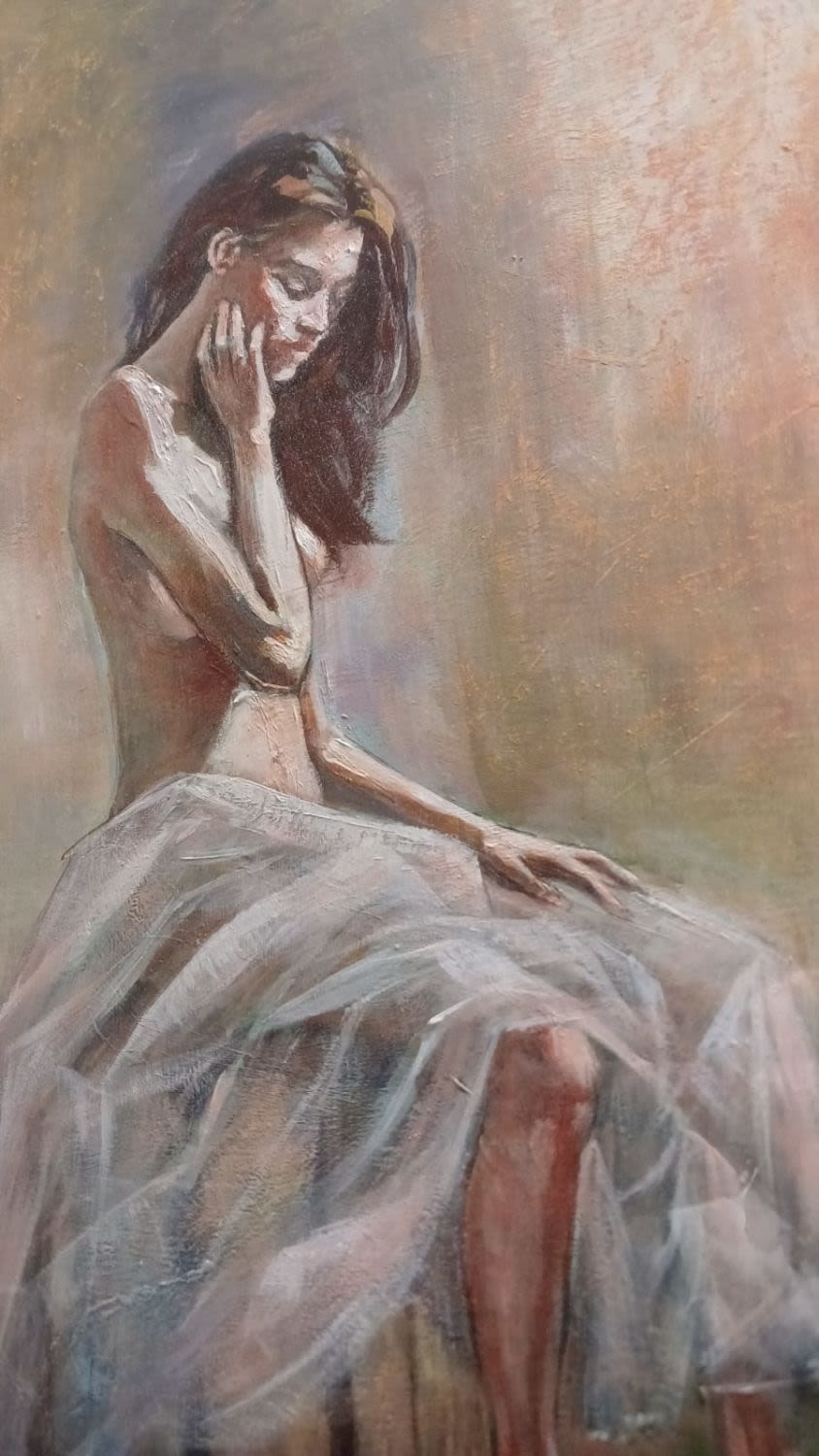 This artwork on board portrays a semi-nude lady in flowing chiffon, seated upon a stool. The artist skillfully blends various materials and techniques, creating a visually stunning piece that balances sensuality and grace. The interplay of textures, colors, and layers adds depth to the composition, evoking a sense of both vulnerability and empowerment. Through this evocative portrayal, the artist invites viewers to explore themes of beauty, introspection, and the interconnection between human form and fabric.