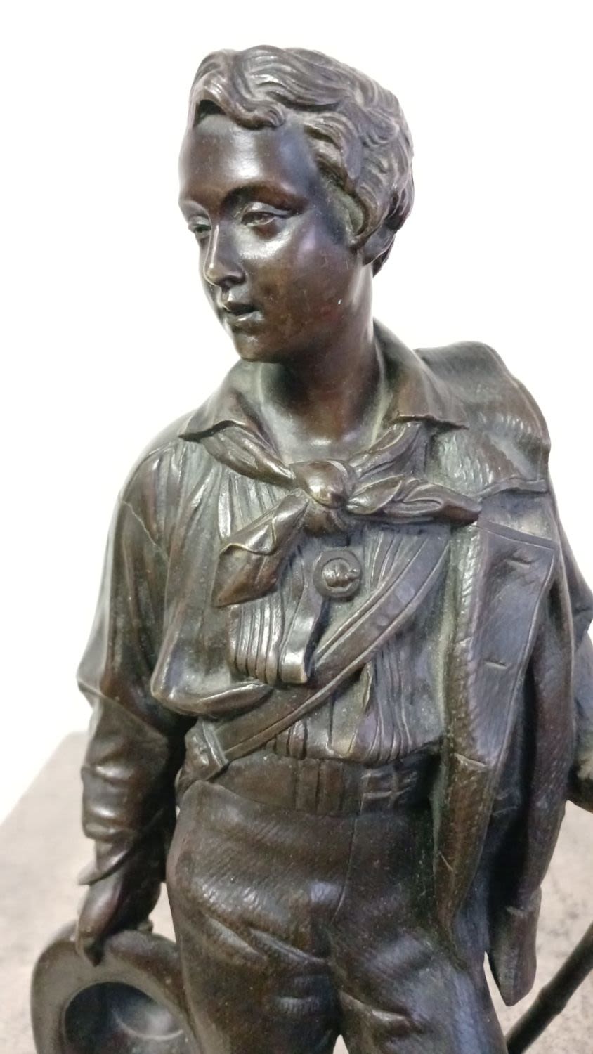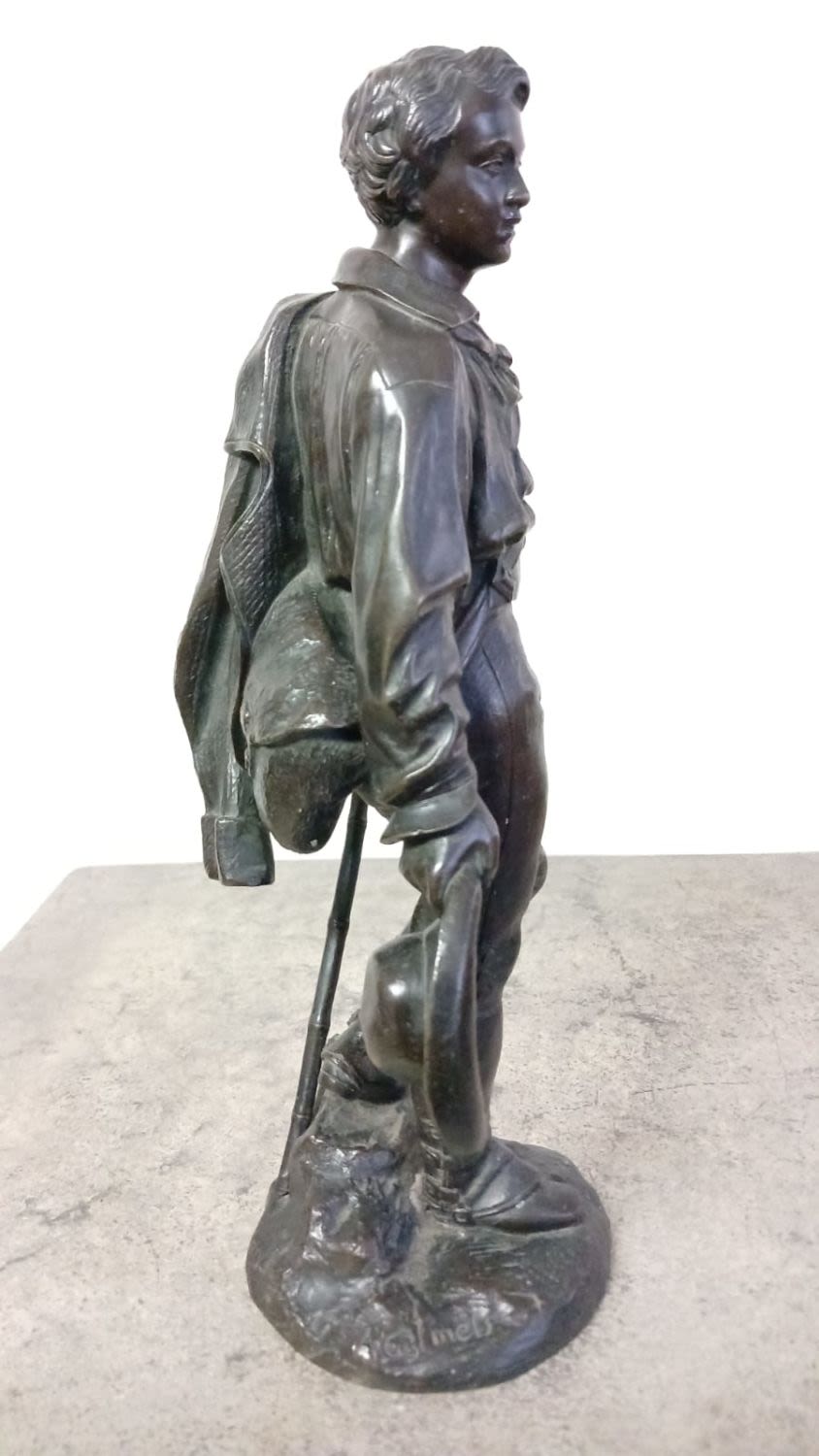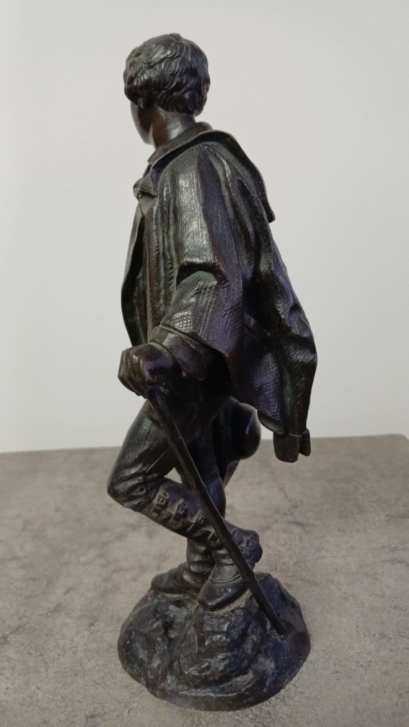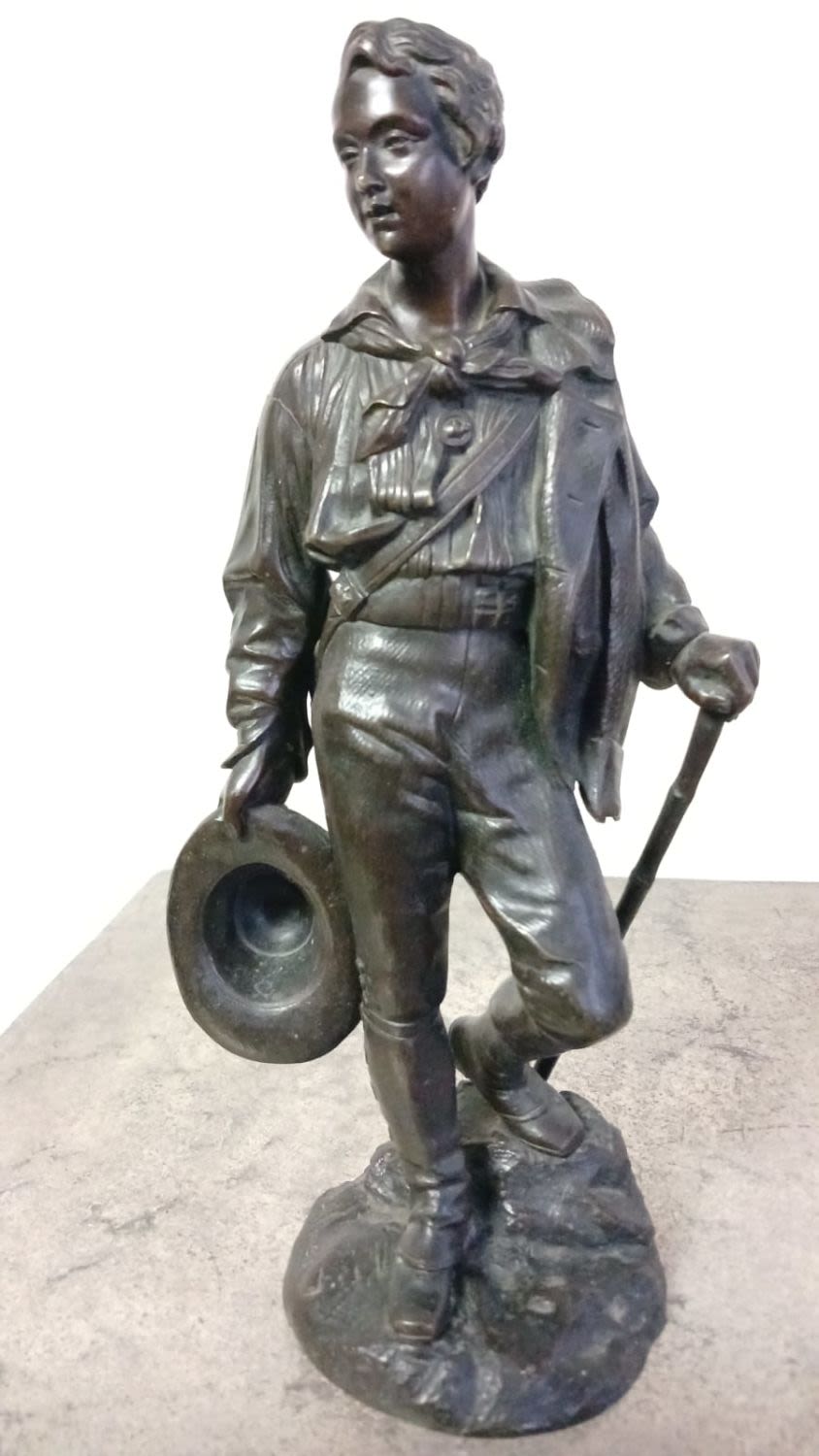 Patinated Bronze Sculpture of a Young Man Holding a Hat and Walking Stick by Celestin Anatole Calmels (1822-1906).