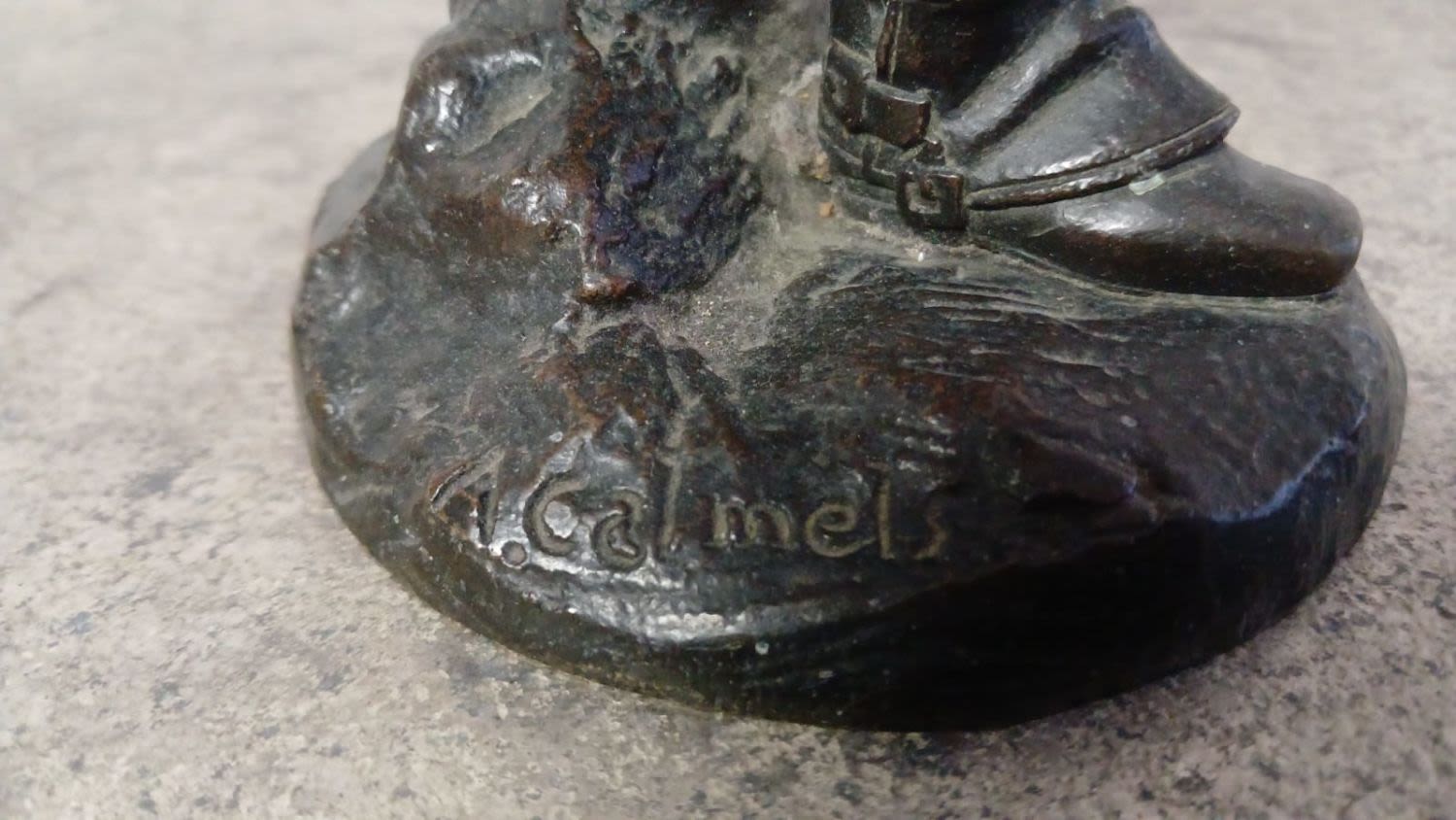 The bronze sculpture depicts a young man in an elegant pose, standing confidently with his weight on one leg. He is portrayed holding a hat in one hand and a walking stick in the other. The artist, Celestin Anatole Calmels, has captured the essence of youth and sophistication in the figure’s facial expression and body language. The patina on the bronze adds depth and richness to the sculpture, highlighting the fine details and texture of the young man’s clothing and features. The overall composition exudes a sense of timeless charm, making it a captivating and classic piece of art.