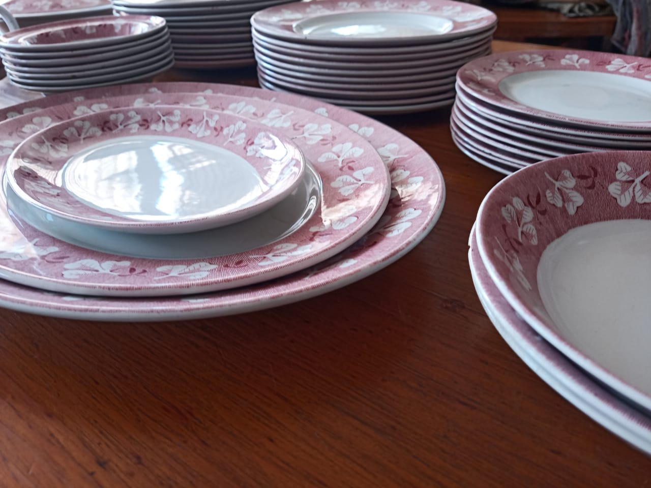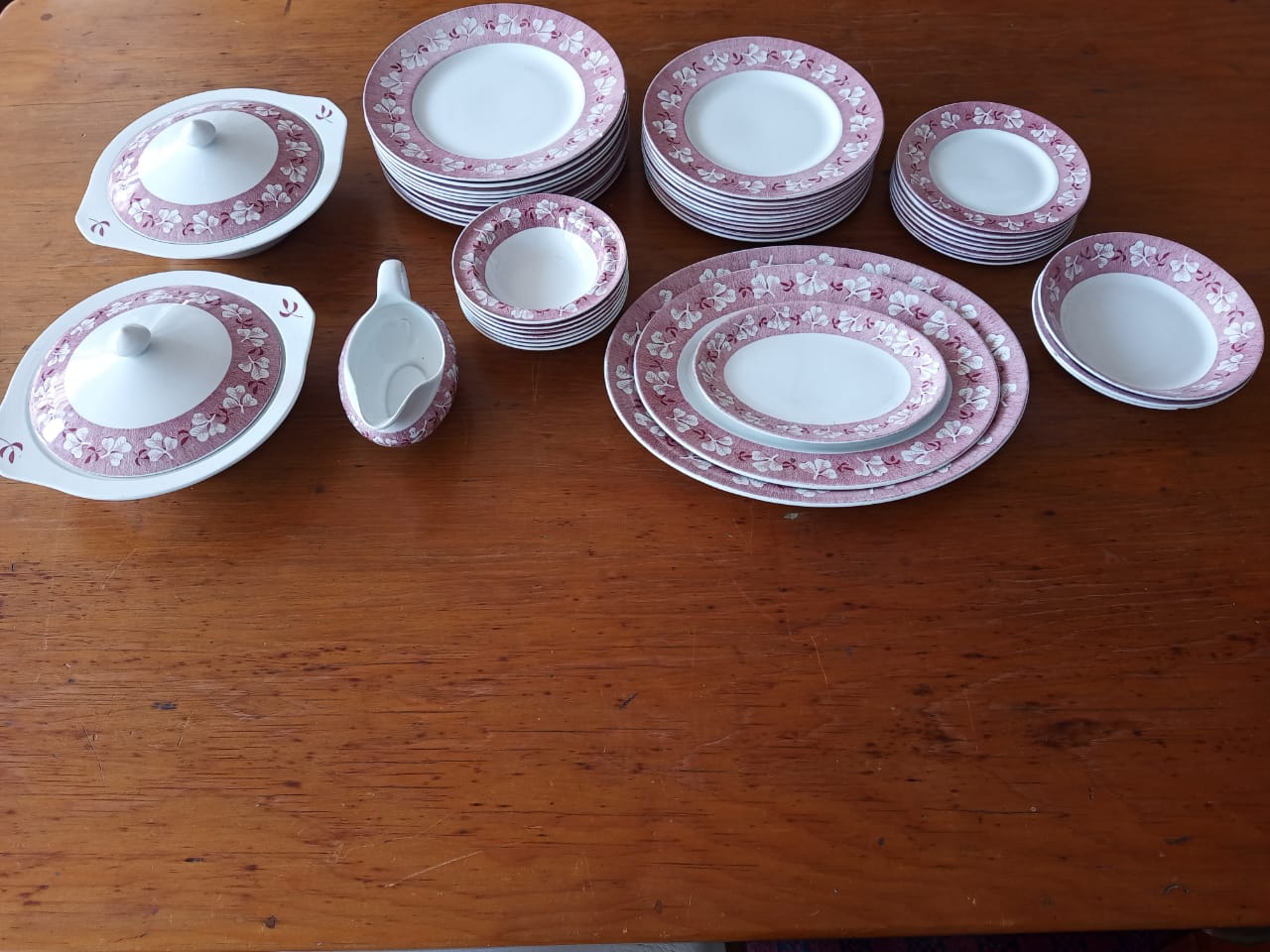 Contains: 9 small plates, 10 medium plates, 10 large plates, 3 medium bowls, 7 small bowls(dessert), 3 oval platers (small, medium, Large), 1 gravy boat and 2 serving pots