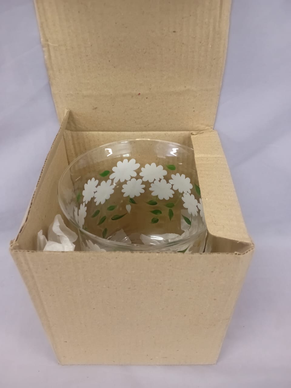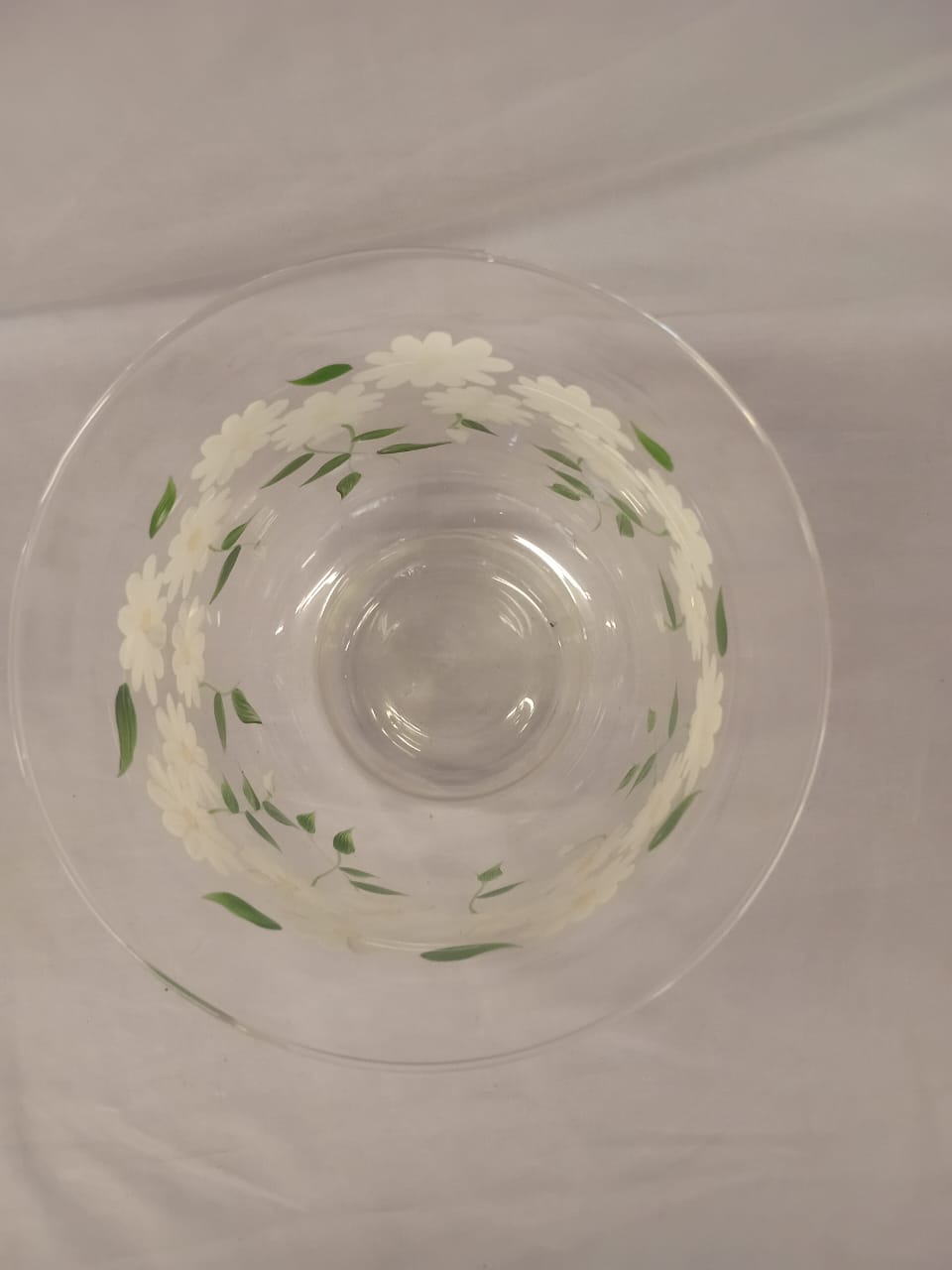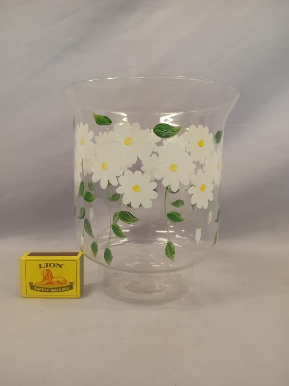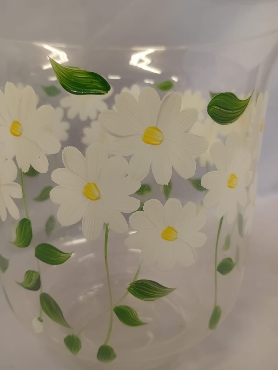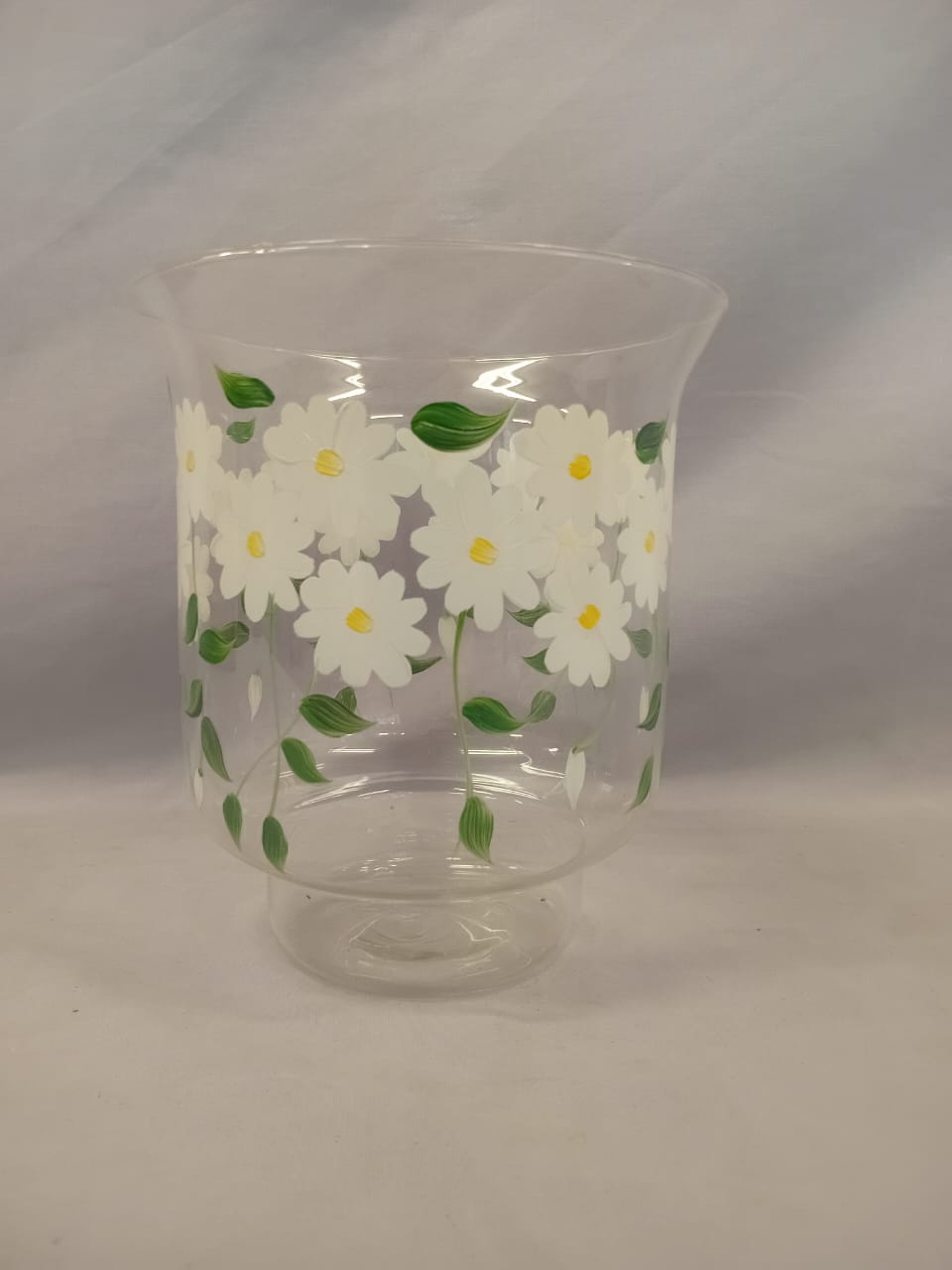 A delicate, lightweight glass vase featuring a charming design of white daisies printed all around its surface. The transparent glass enhances its airy feel, while the daisies add a touch of freshness and simplicity, making it perfect for brightening up any room.