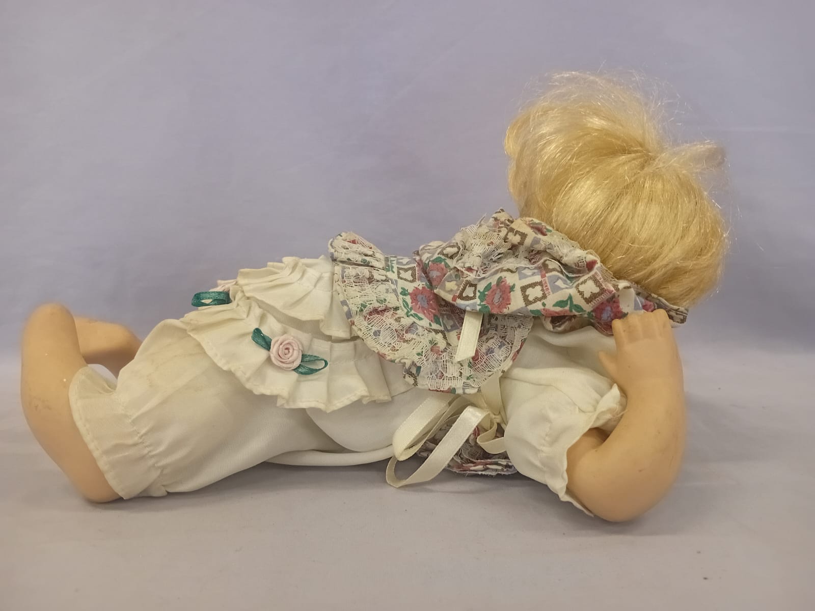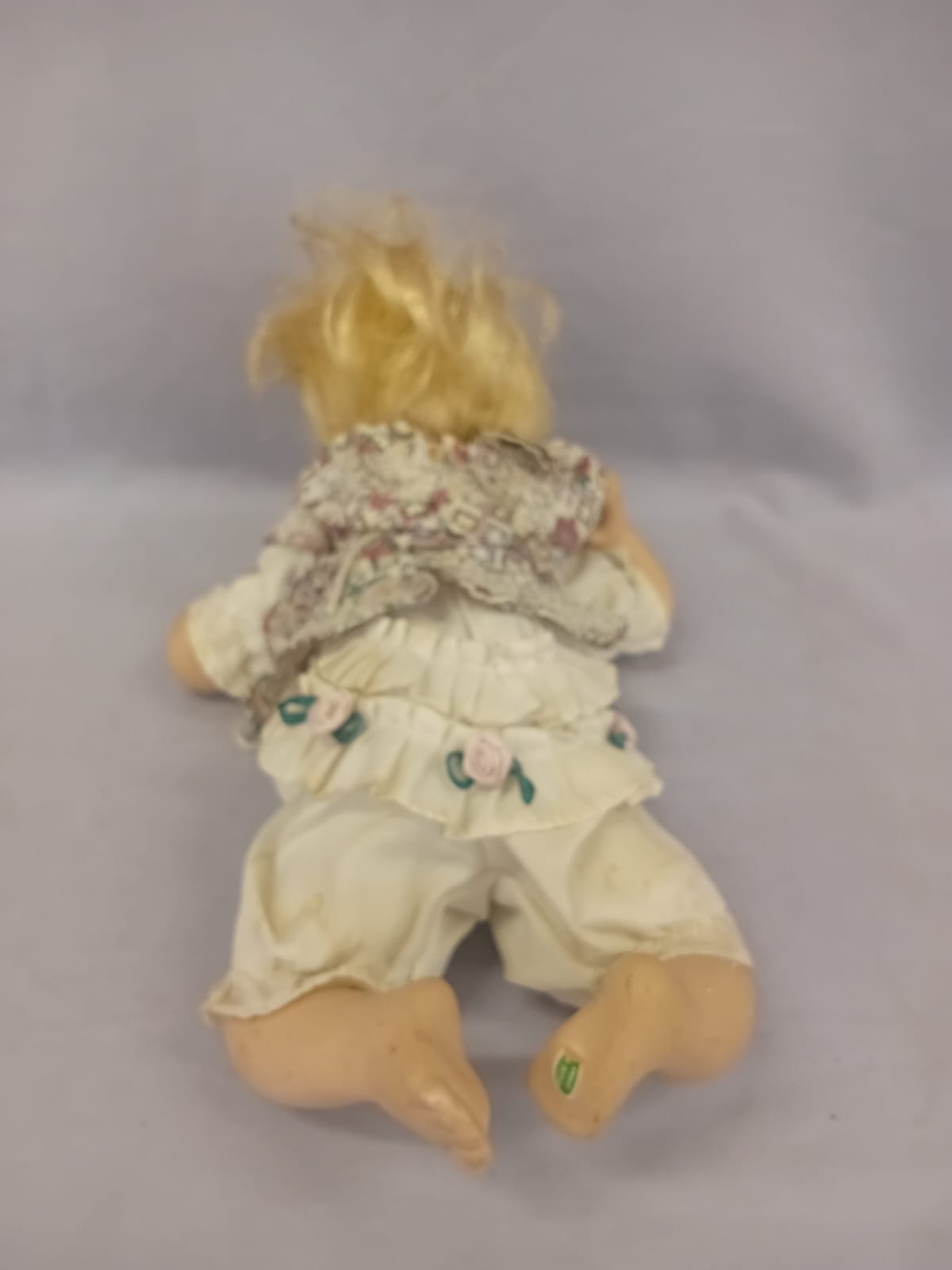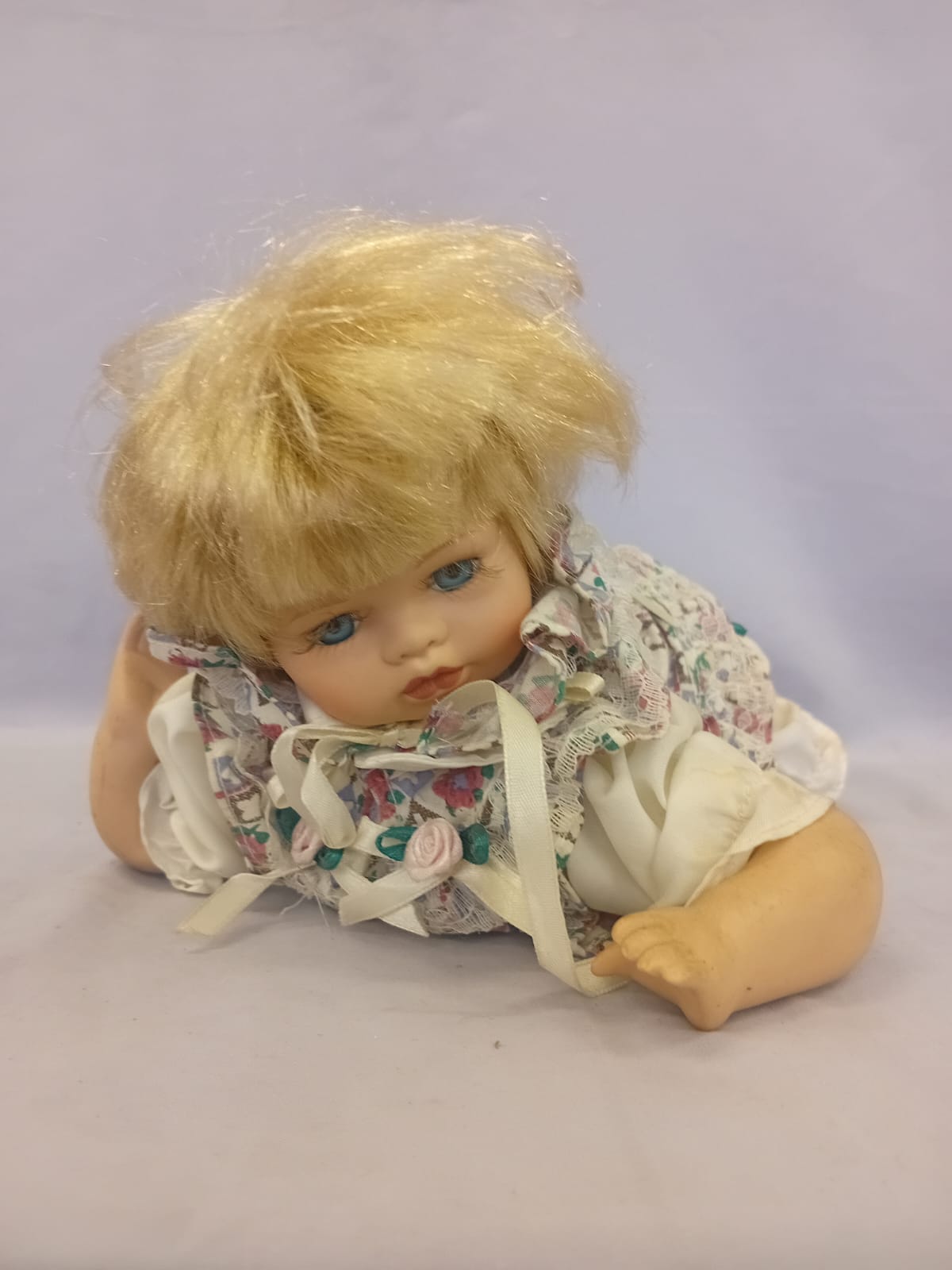 This is a charming crawling baby doll with delicate porcelain hands, feet, and head, evoking a vintage aesthetic. The doll features soft blond hair and vivid blue eyes, its head tilted slightly to the left, giving it a curious and lifelike expression. It is dressed in a classic baby grow paired with a vintage coat that includes a hood. The coat showcases a unique design with a mix of floral and square prints, adding a nostalgic touch to the doll’s overall look. This piece exudes timeless charm and makes a beautiful collector’s item or decorative piece.