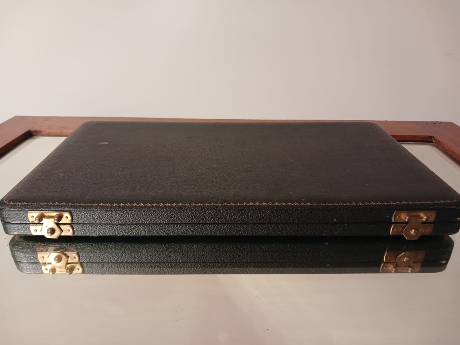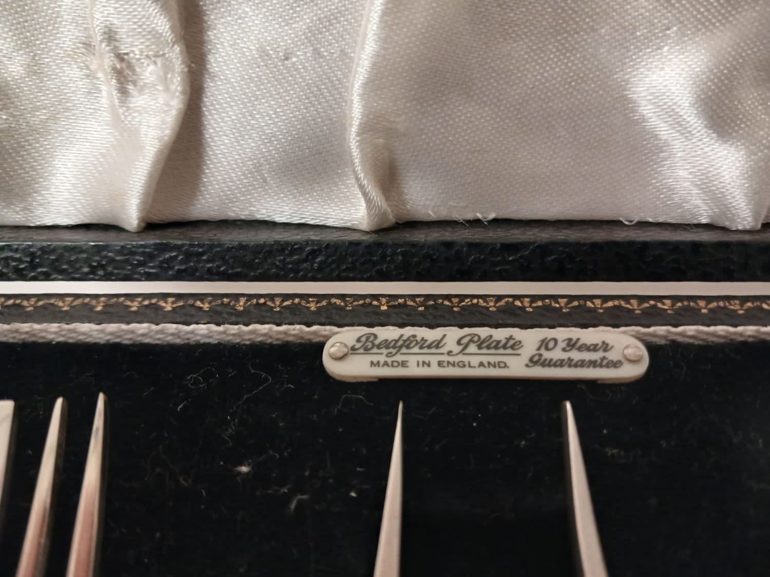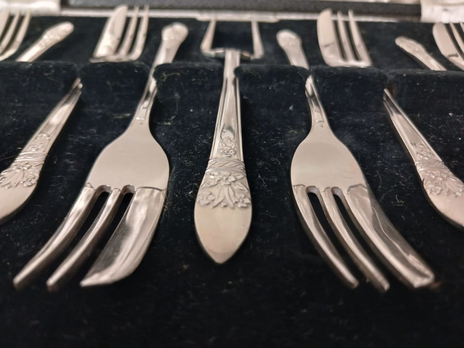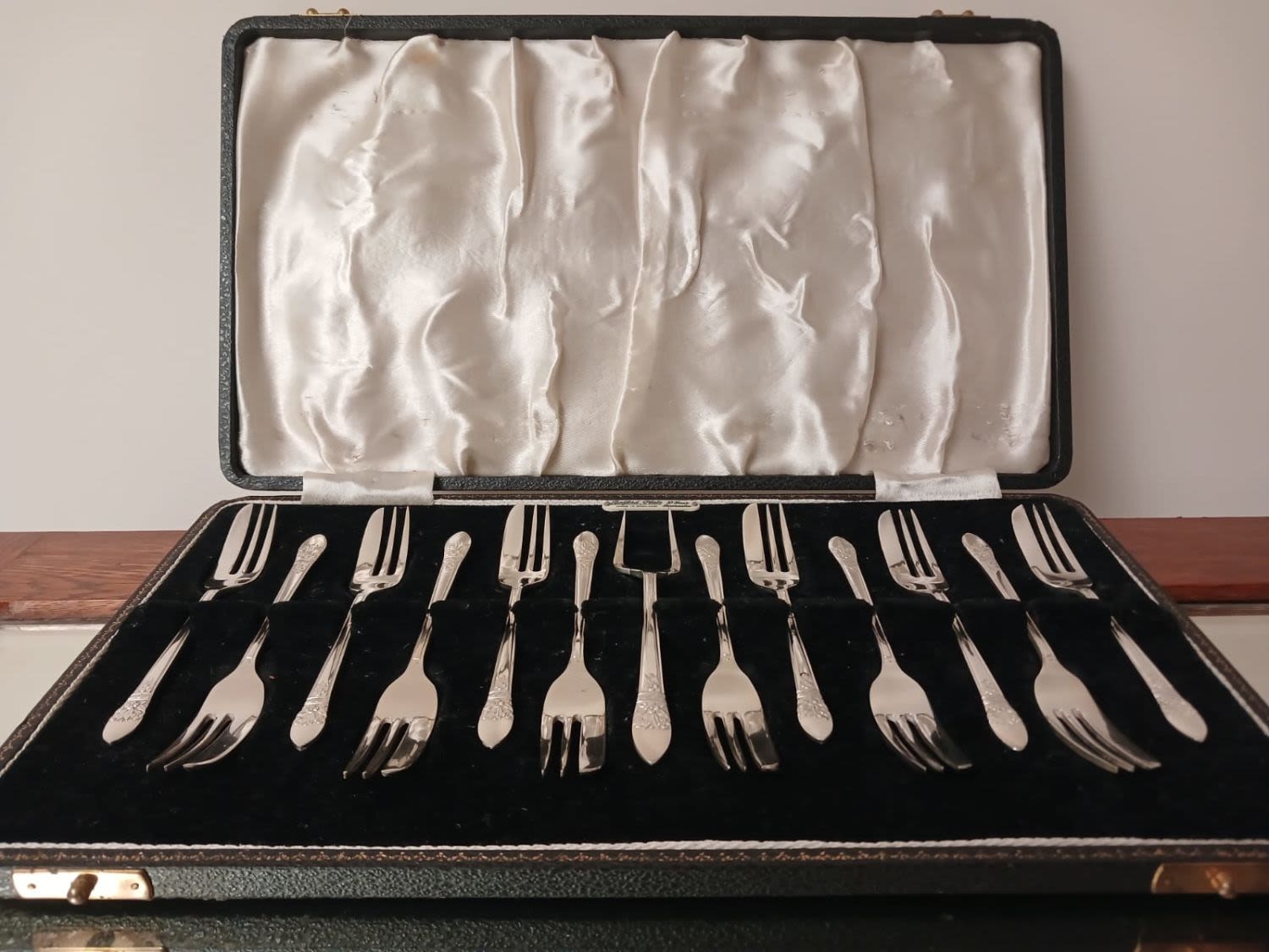 This glistening, silver-plated cake fork set is an elegant collection housed in its original canteen, featuring a total of 12 meticulously crafted cake forks and one cake server fork. Each is coated in a lustrous layer of silver, adding a touch of sophistication to any dessert occasion. The canteen itself is designed with a cream satin lining on the top, providing a soft and luxurious backdrop for the gleaming silverware. The bottom of the canteen is lined with black velvet, ensuring both a secure storage space and a visually appealing presentation. This set combines practicality with aesthetic charm, making it a delightful addition to any dining experience or a thoughtful gift for special occasions.