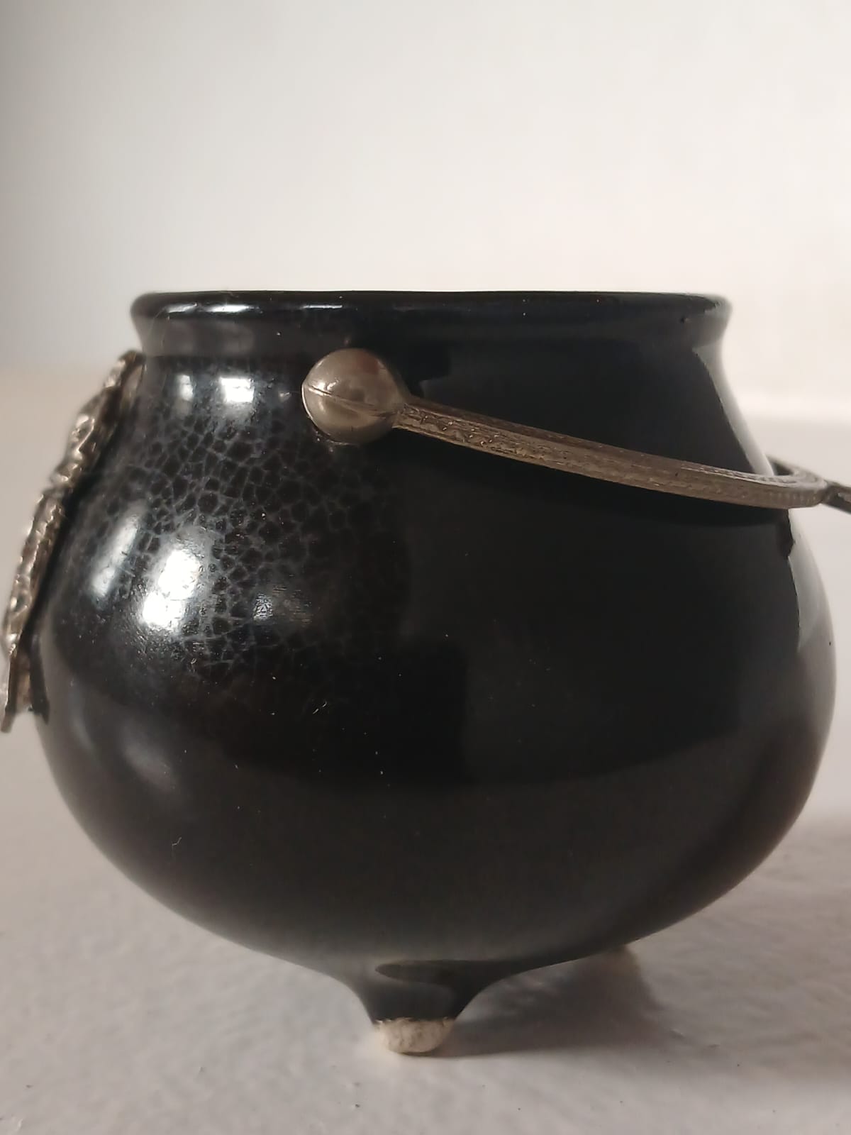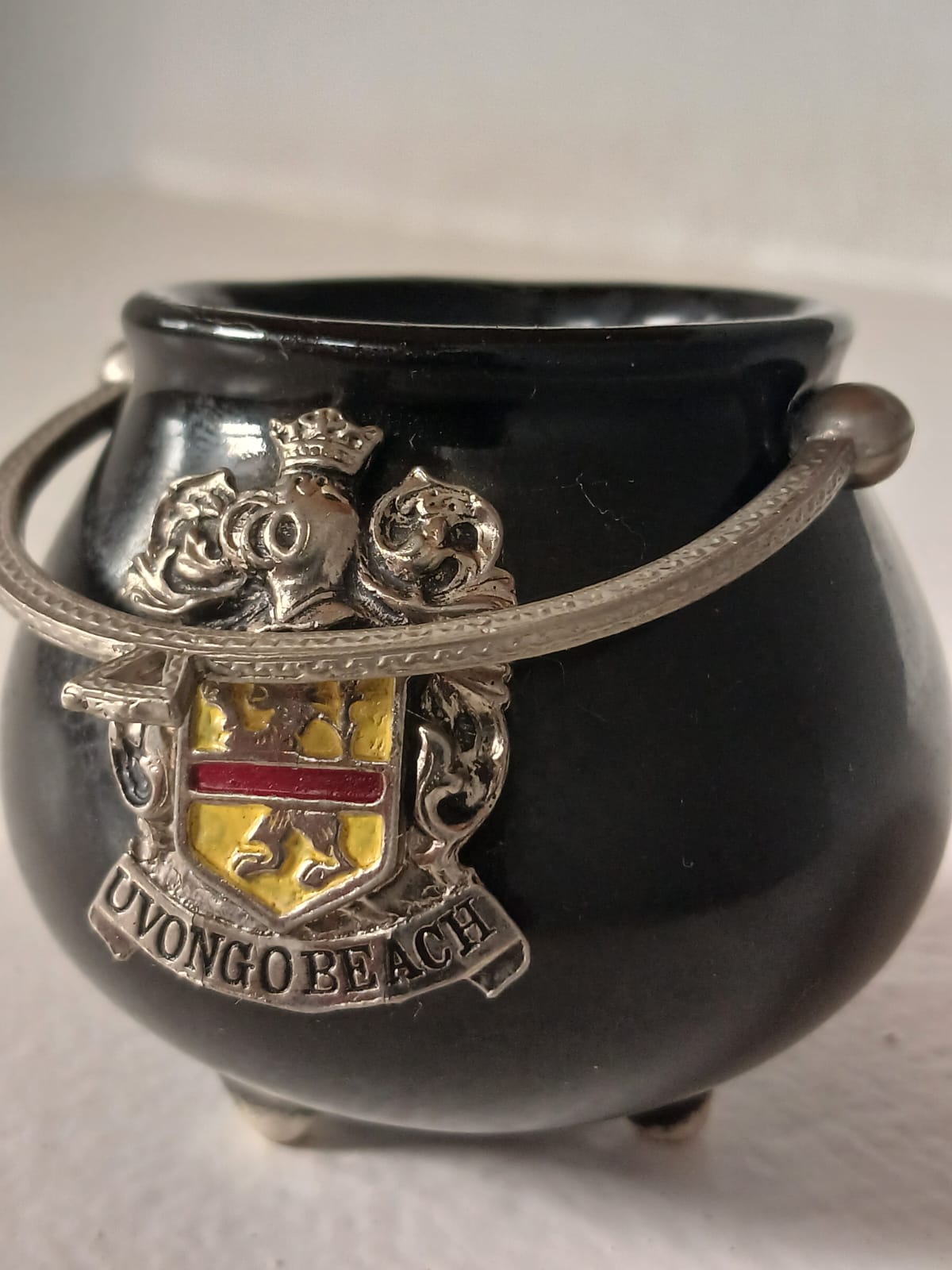 A charming three-legged ceramic pot, resembling a miniature cauldron, featuring black enamel finish, a silver-toned metal handle, and an emblem from Uvongo Beach on the front. Standing 6cm high with a 6cm diameter at its widest point, this unique collectible is in great condition—a perfect addition to any vintage or coastal-themed collection.