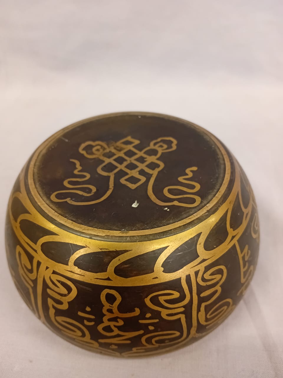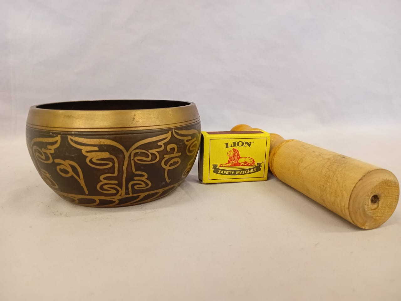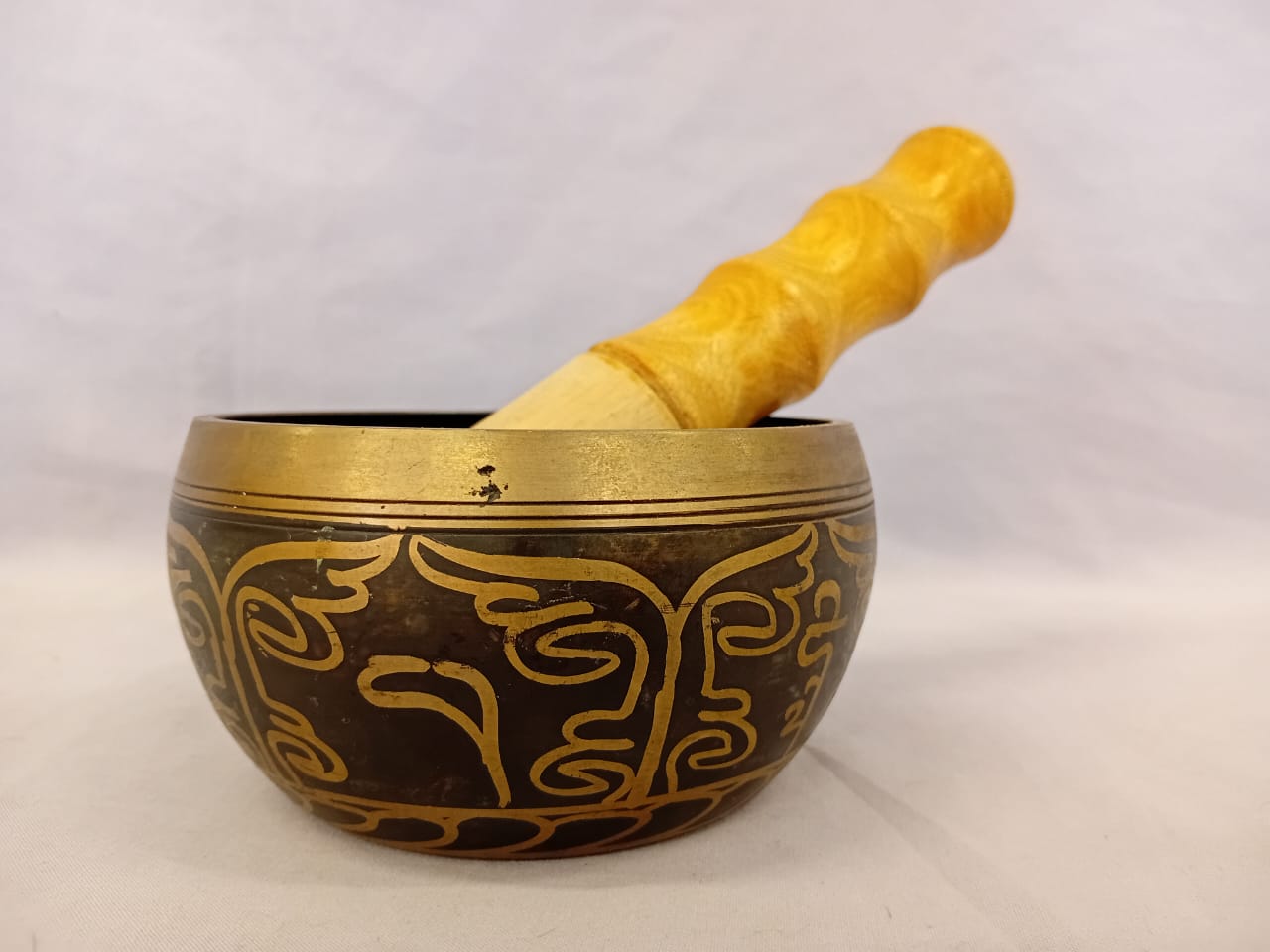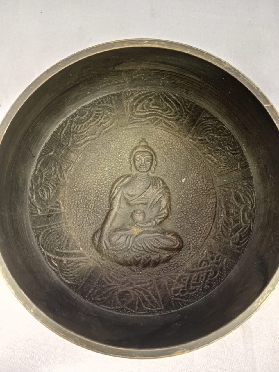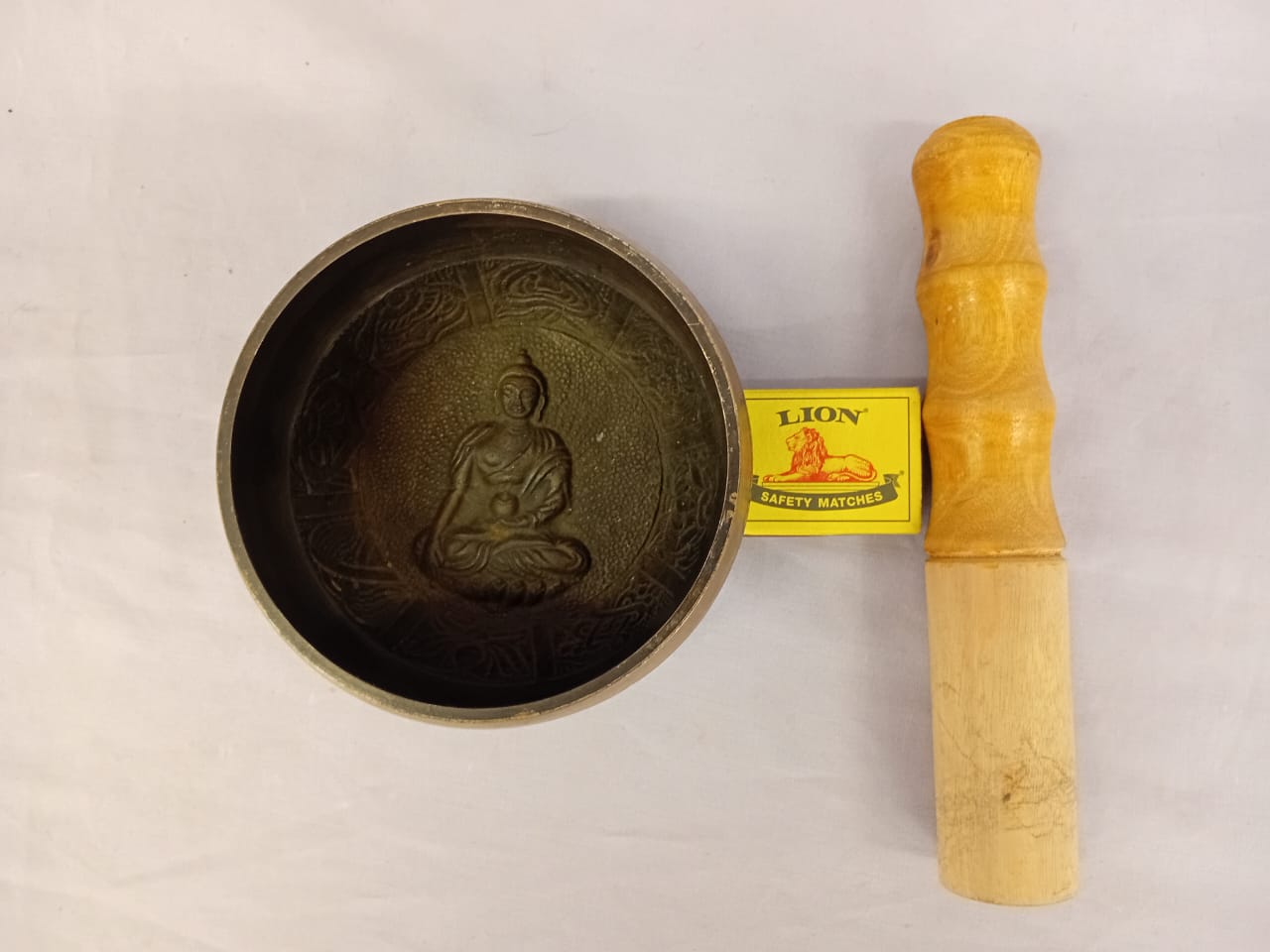 A traditional brass bowl, used for meditation, healing, and sound therapy. When struck or rubbed with a mallet, it produces a deep, resonant tone that promotes relaxation and mindfulness. This particular singing bowl features an embossed Buddha at its center, symbolizing enlightenment, inner peace, and spiritual awakening. The presence of the Buddha enhances its significance, making it a powerful tool for meditation, devotion, and sound healing practices.