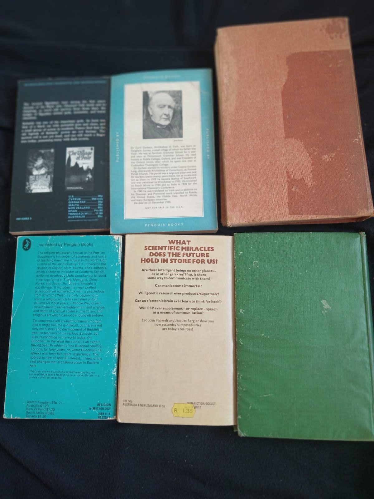 6 vintage books covering occult, hypnosis, Buddhism, dreams, and historical events