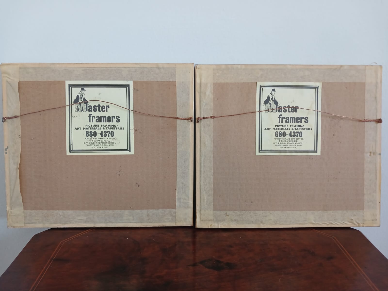 These 2 signed paintings framed. The frame measures 27cm x 24cm.