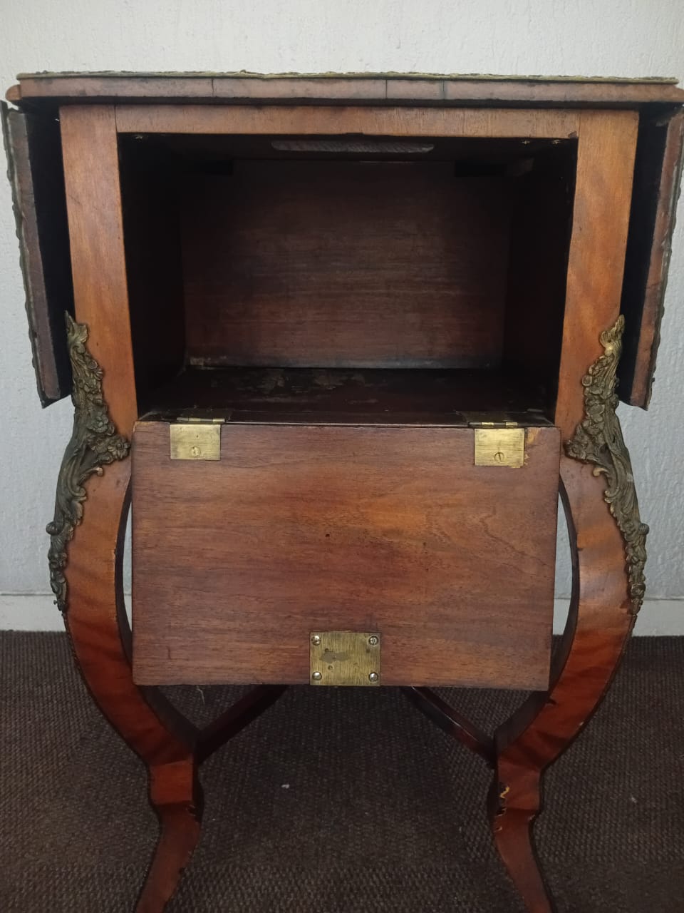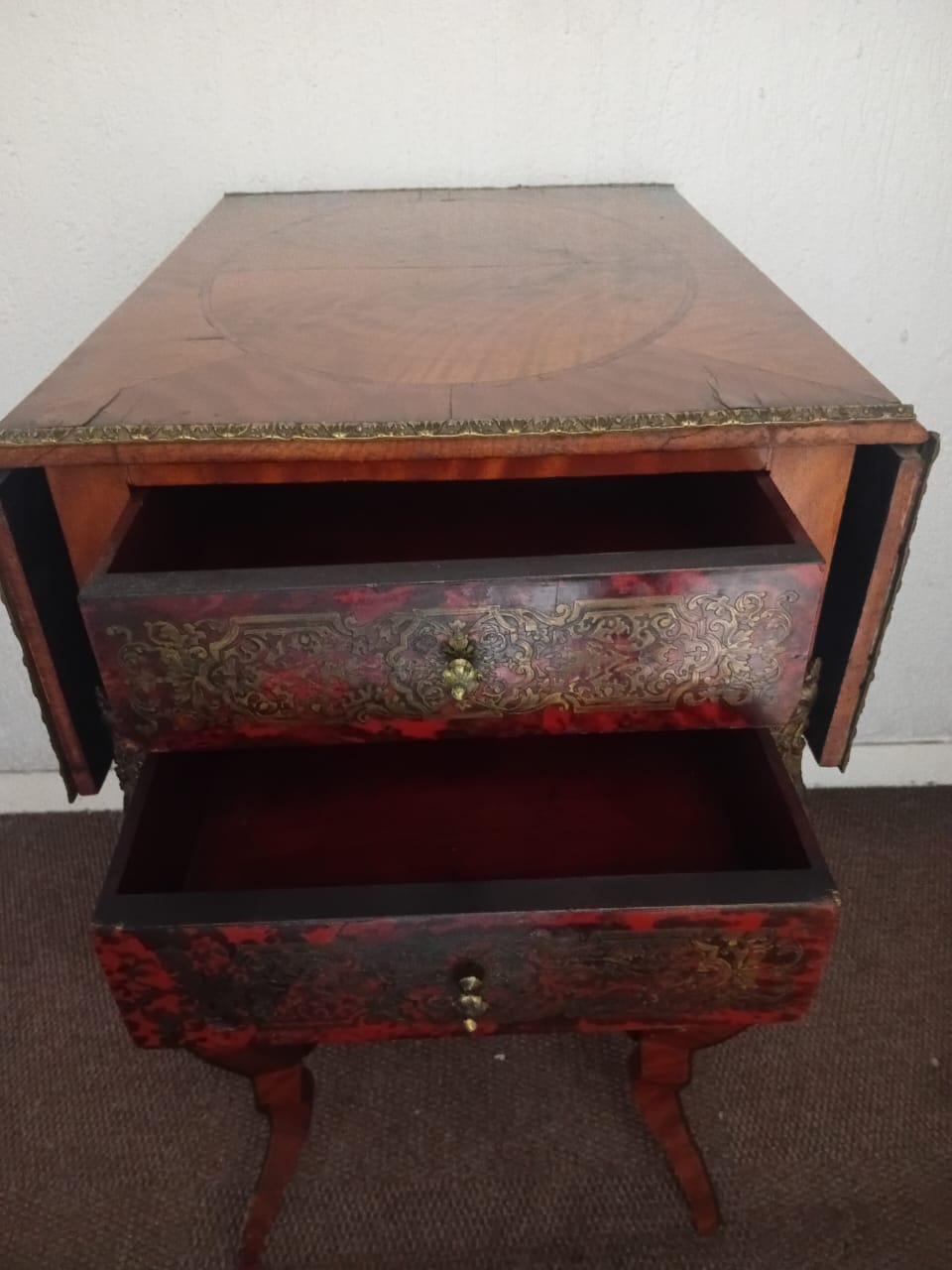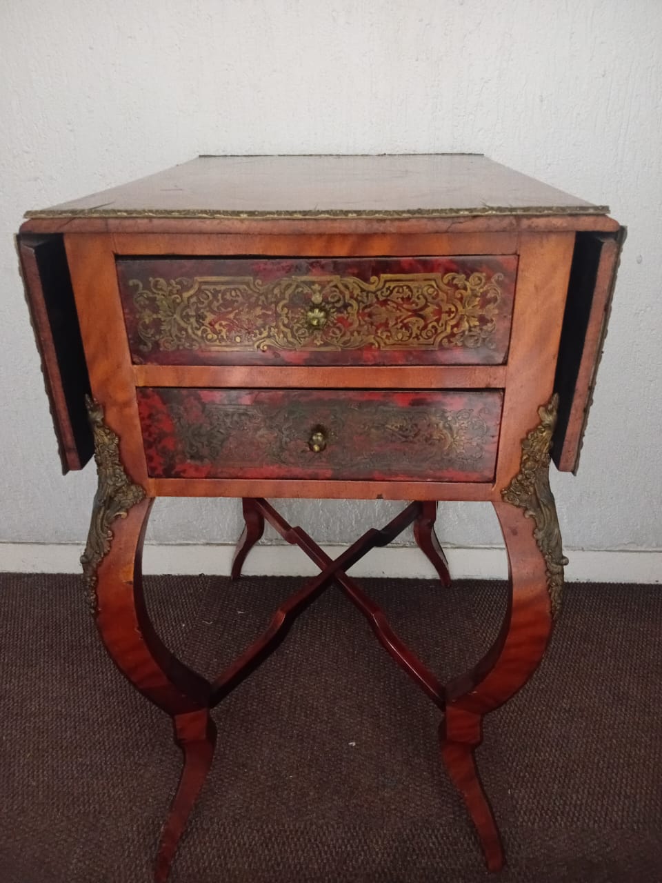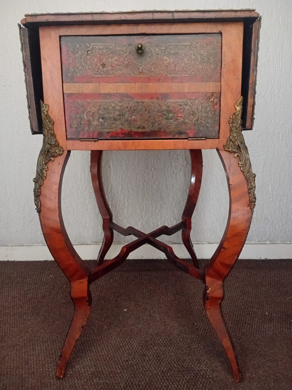 This side table features ornate brass embellishments. It has a drop-leaf design, allowing the sides to extend for additional surface space. One side of the table has two drawers adorned with decorative inlays and metal handles, while the opposite side contains a fold-open compartment to store larger objects or be used for additional functionality. The curved legs and intricate patterns contribute to its elegant and antique aesthetic.