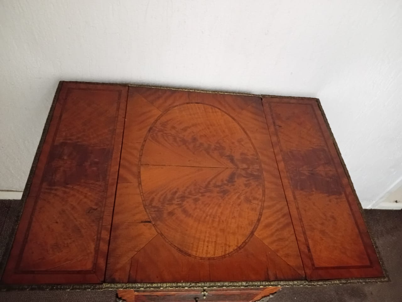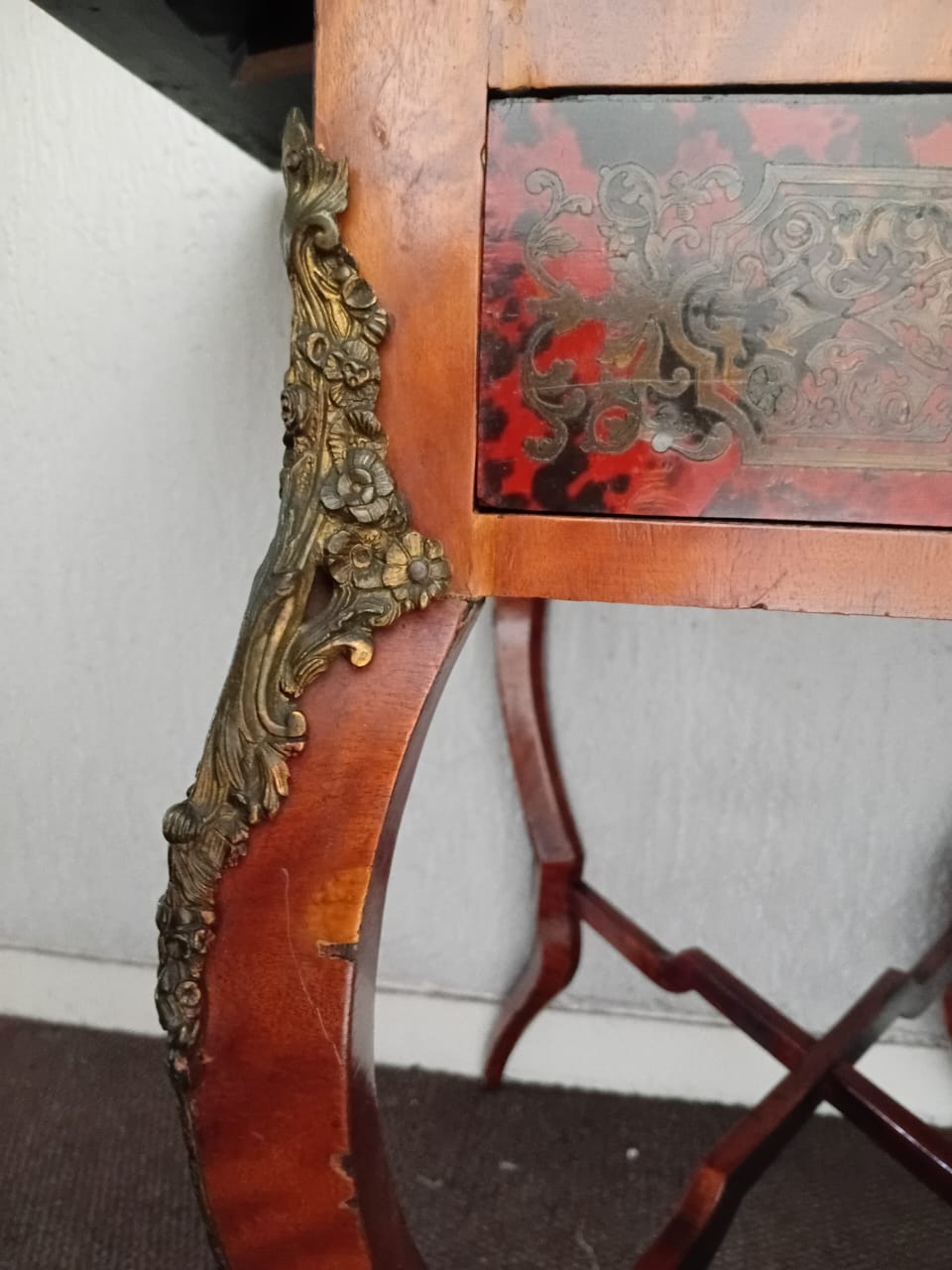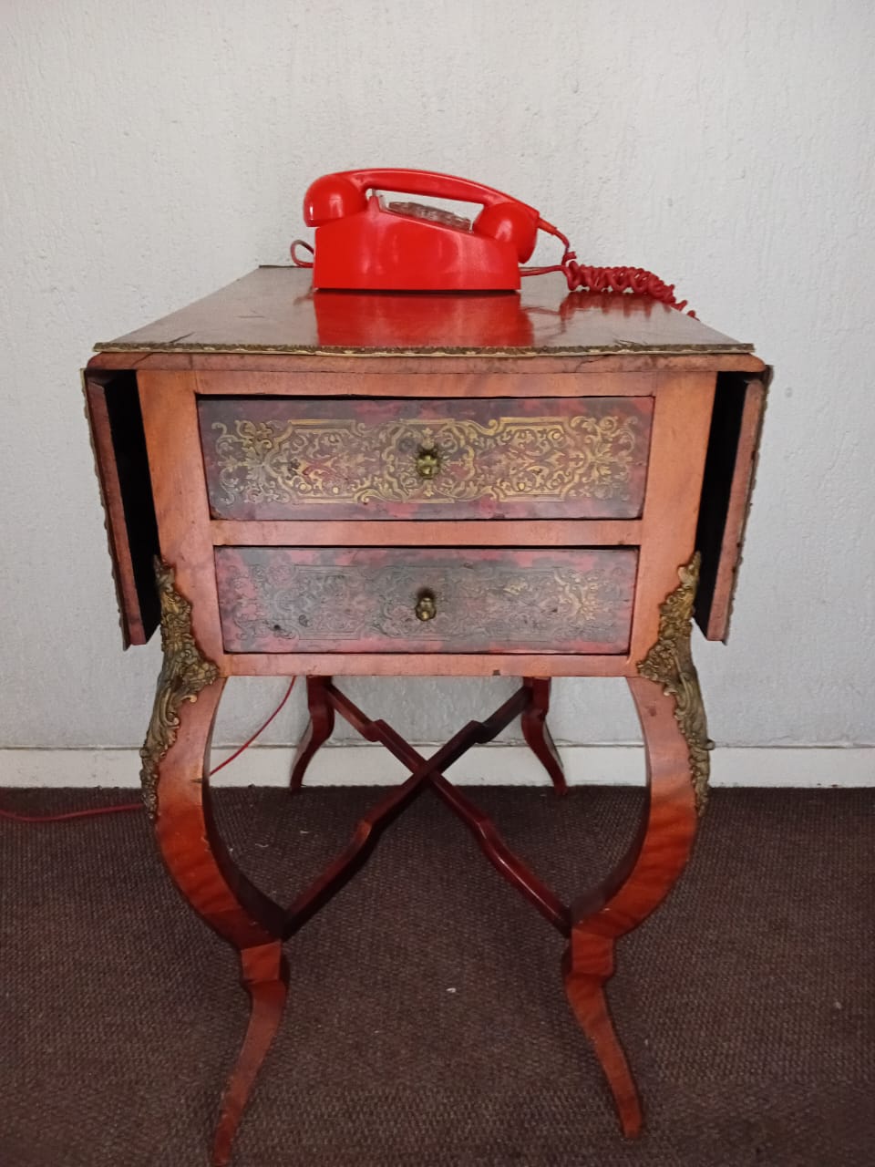 This side table features ornate brass embellishments. It has a drop-leaf design, allowing the sides to extend for additional surface space. One side of the table has two drawers adorned with decorative inlays and metal handles, while the opposite side contains a fold-open compartment to store larger objects or be used for additional functionality. The curved legs and intricate patterns contribute to its elegant and antique aesthetic.