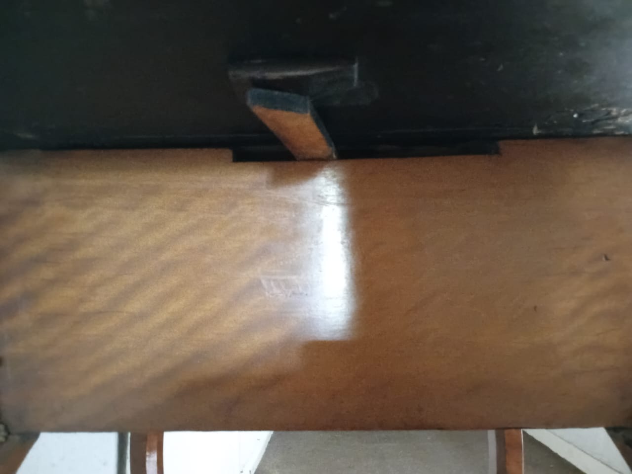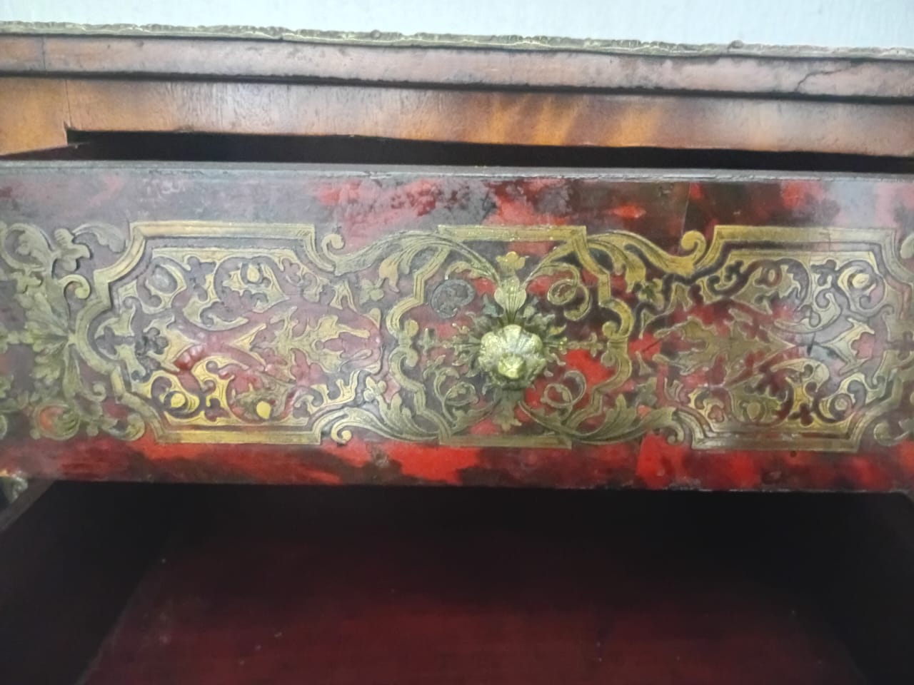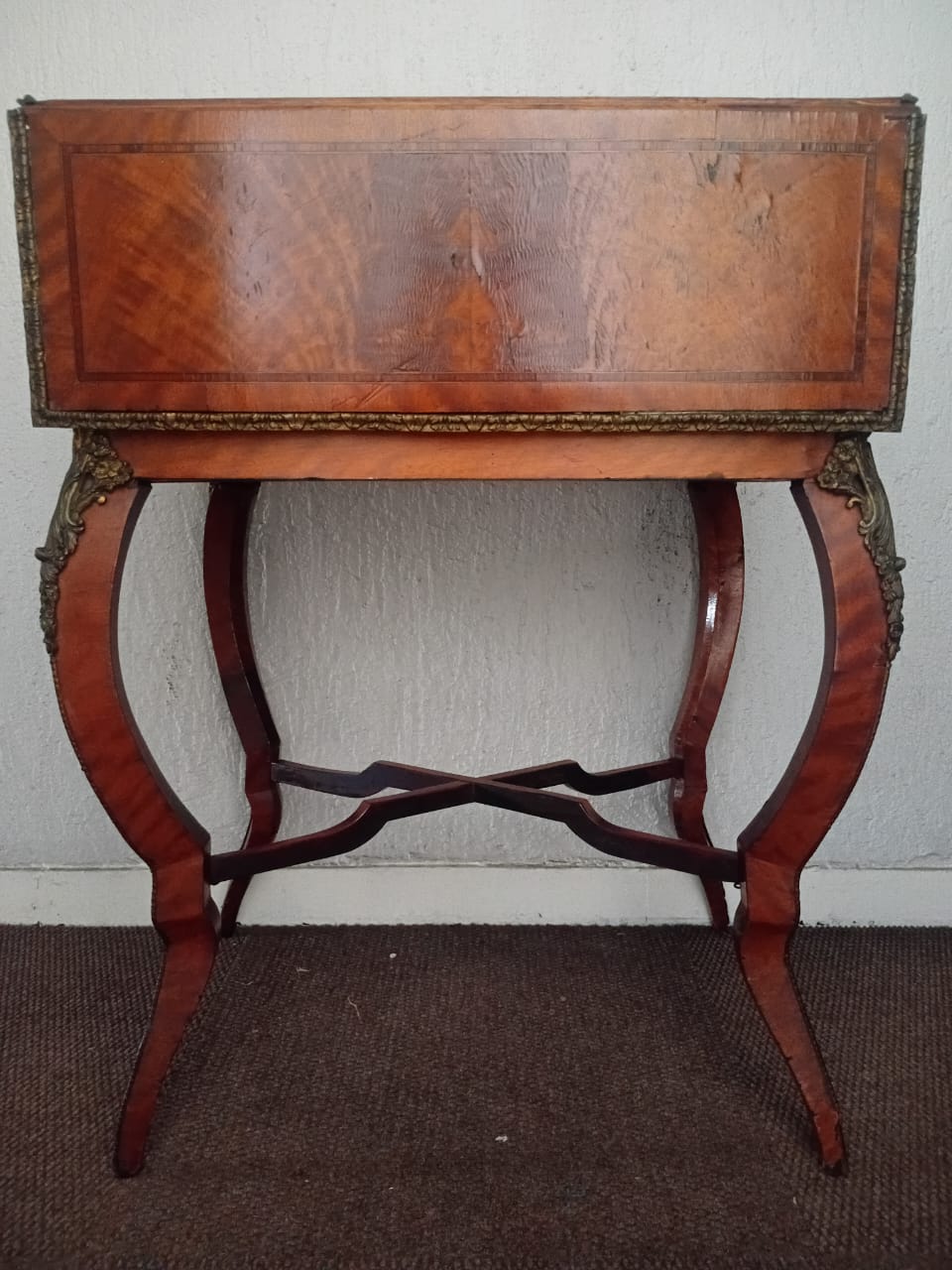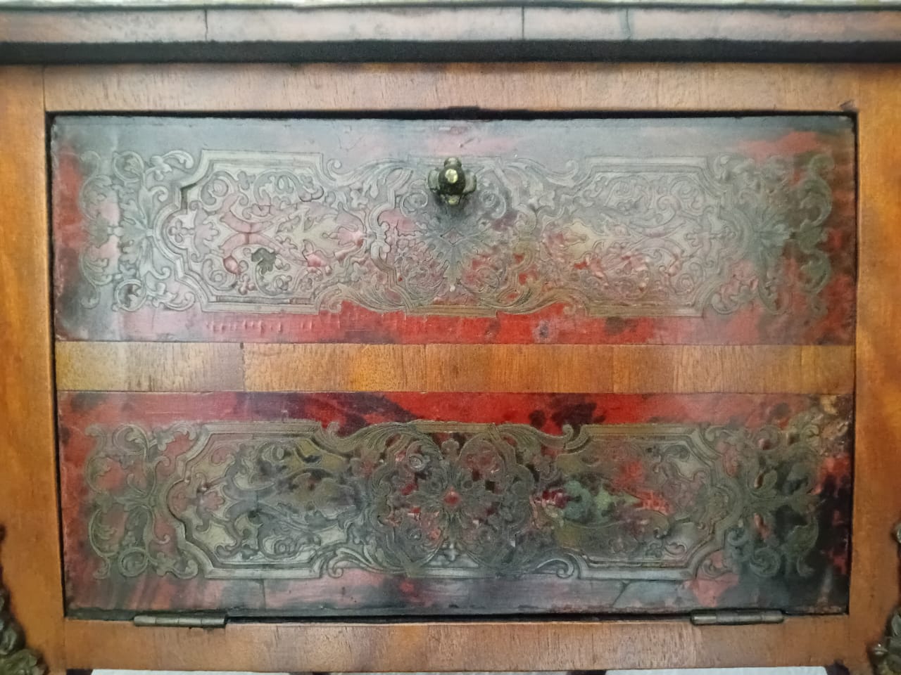 This side table features ornate brass embellishments. It has a drop-leaf design, allowing the sides to extend for additional surface space. One side of the table has two drawers adorned with decorative inlays and metal handles, while the opposite side contains a fold-open compartment to store larger objects or be used for additional functionality. The curved legs and intricate patterns contribute to its elegant and antique aesthetic.