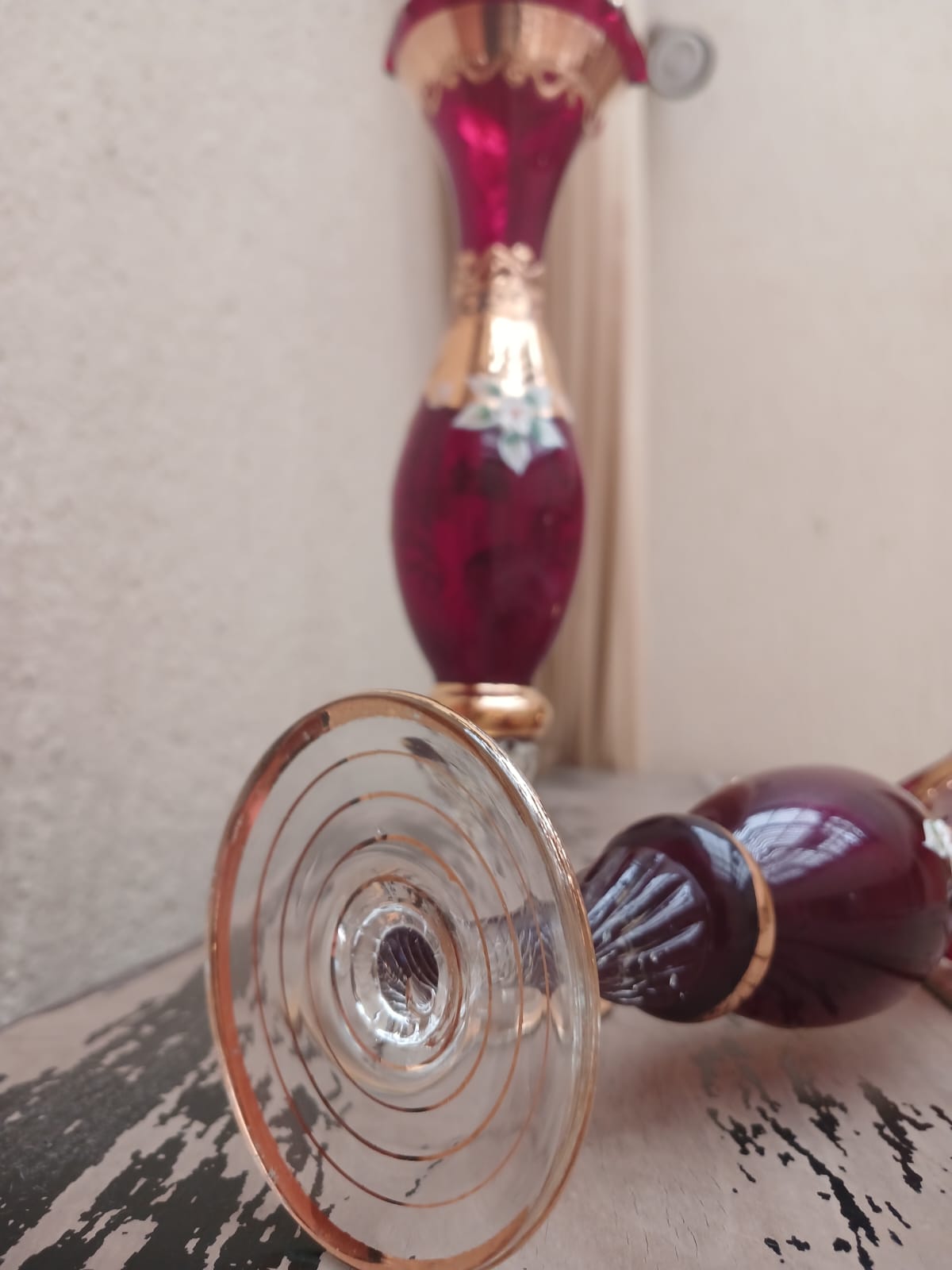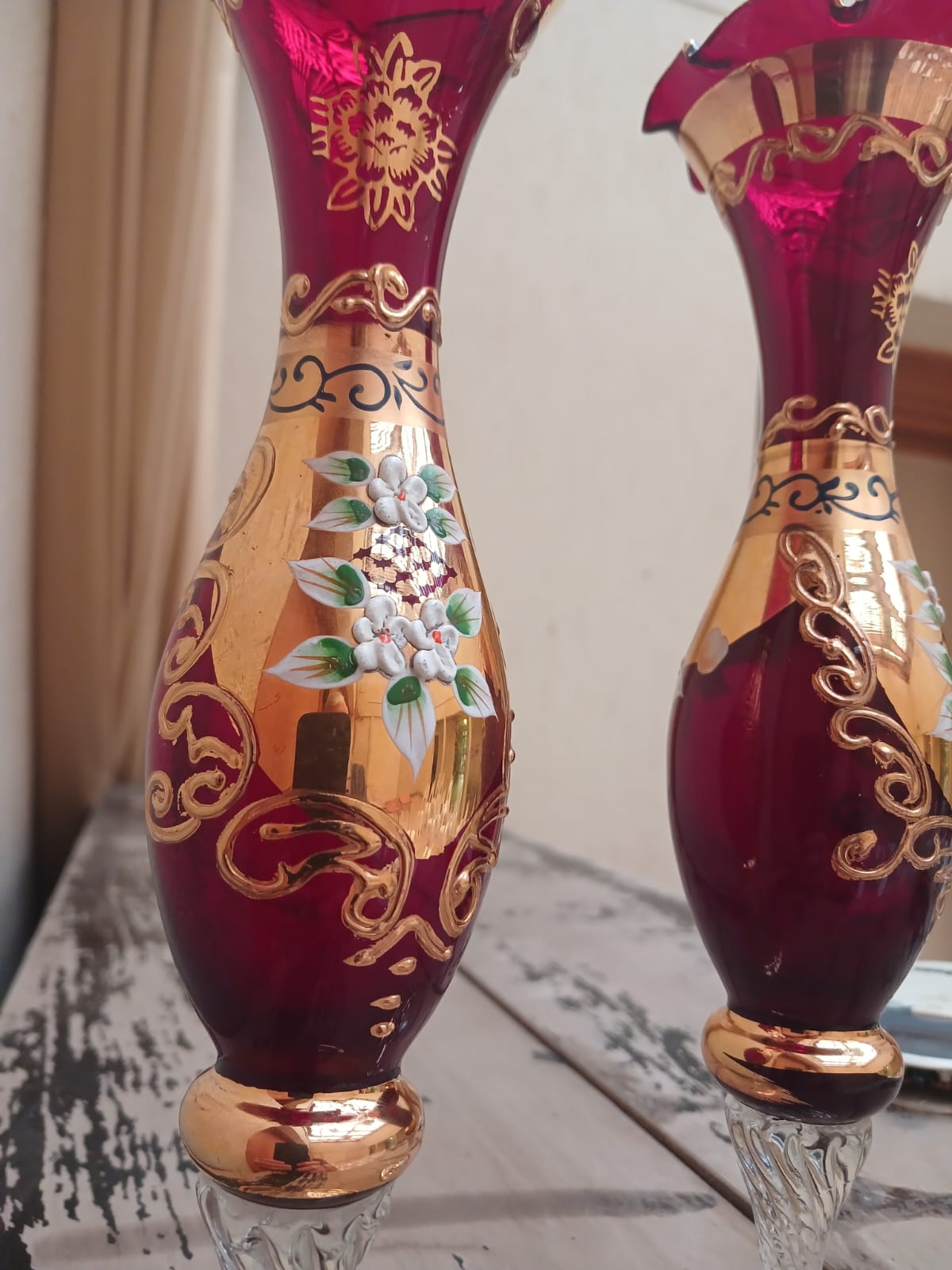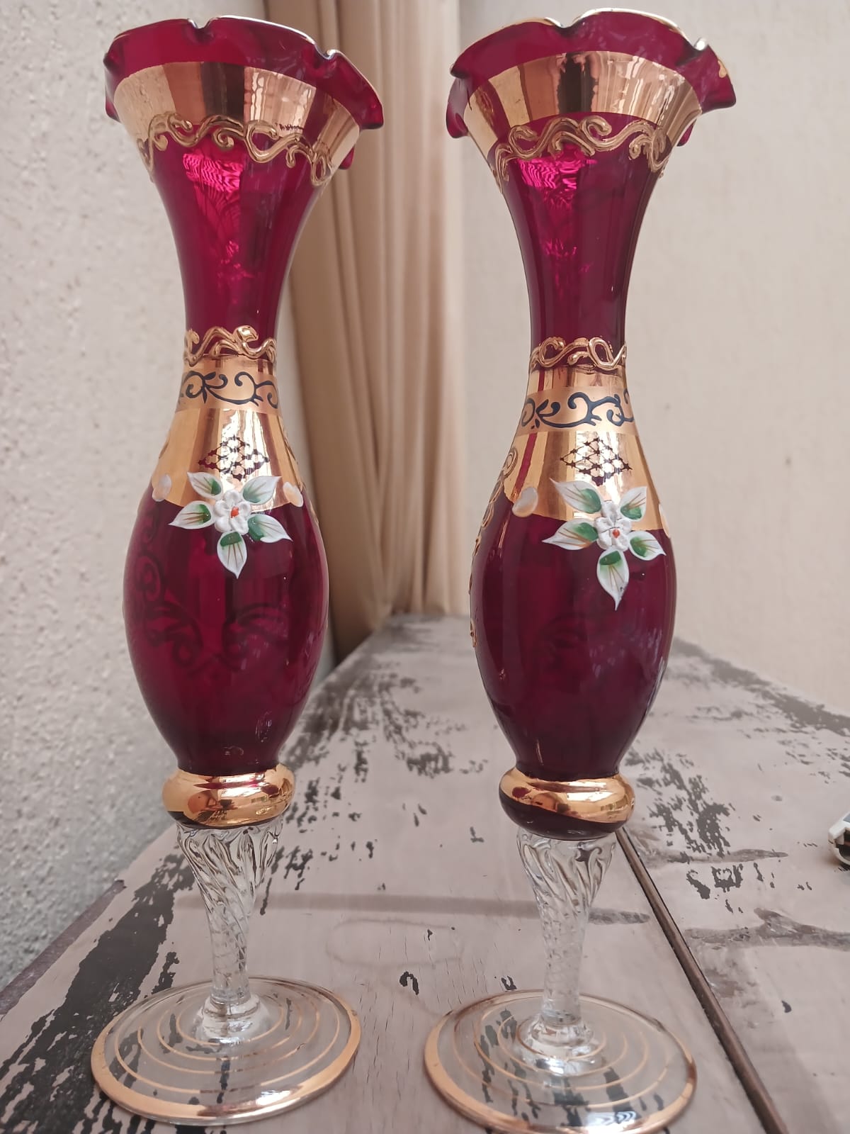 A stunning pair of Ruby Red & 24k gilt Bohemia Czech fluted glass vases, dating to the 1930s. These elegant vases stand 26cm tall and 7cm wide, featuring wave-form edges and a vibrant ruby red glass body. Hand-painted with intricate 24k gold detailing, they showcase applied floral motifs and elaborate gilt patterns. Despite their vintage charm, they remain in excellent “as new” condition, with only slight (almost unnoticeable) gilt loss to the base of one vase, adding character to this exquisite collectible set.