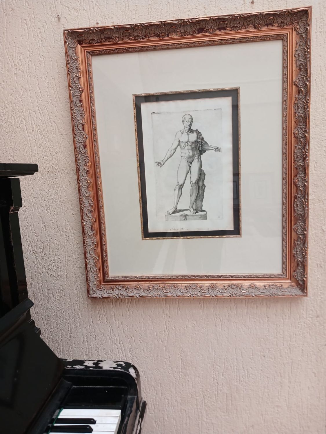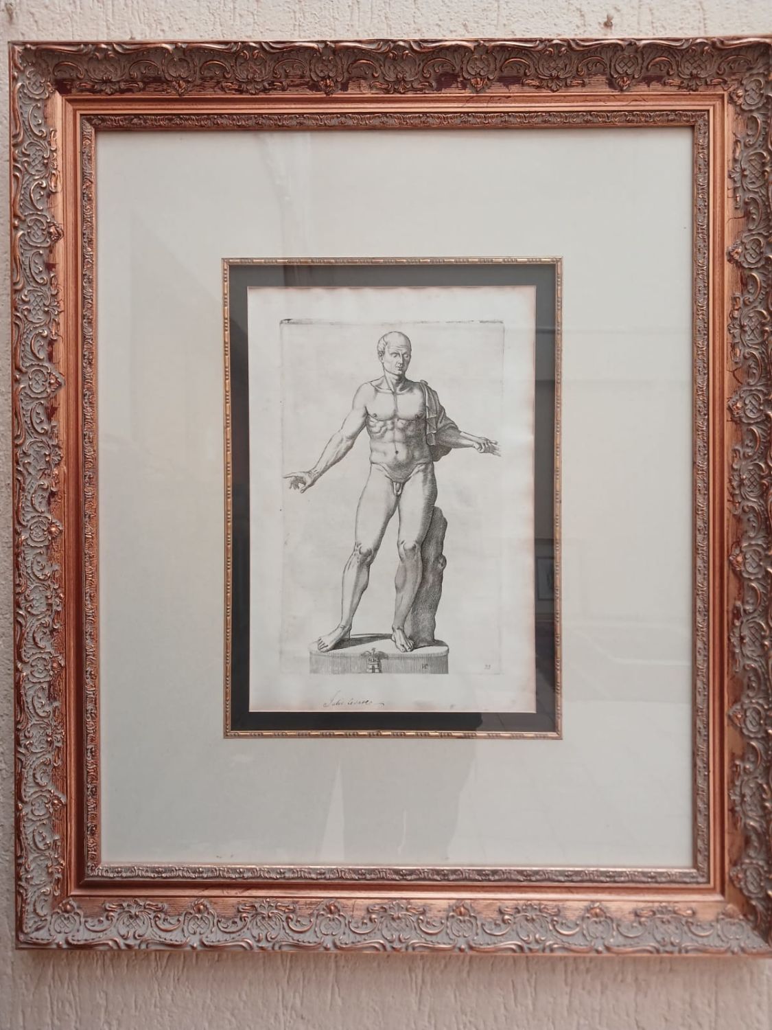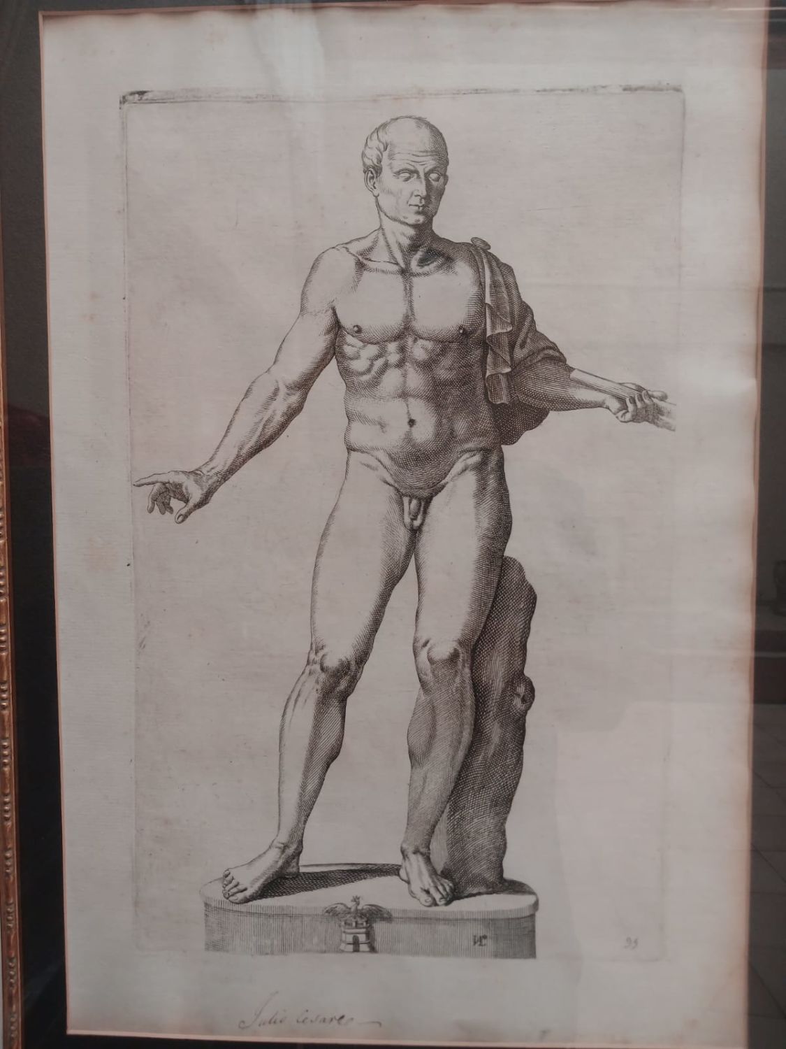The graphic from an engraving by Giovanni Luigi Valesio featuring the statue of Julius Caesar is a captivating piece of art, especially as it is presented in a beautifully gilt frame behind glass. The frame’s dimensions of 83cm x 91cm is sizable enough to command attention on a wall.