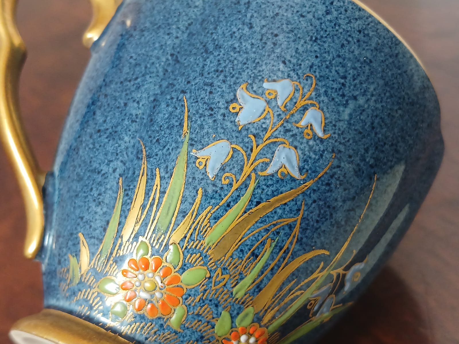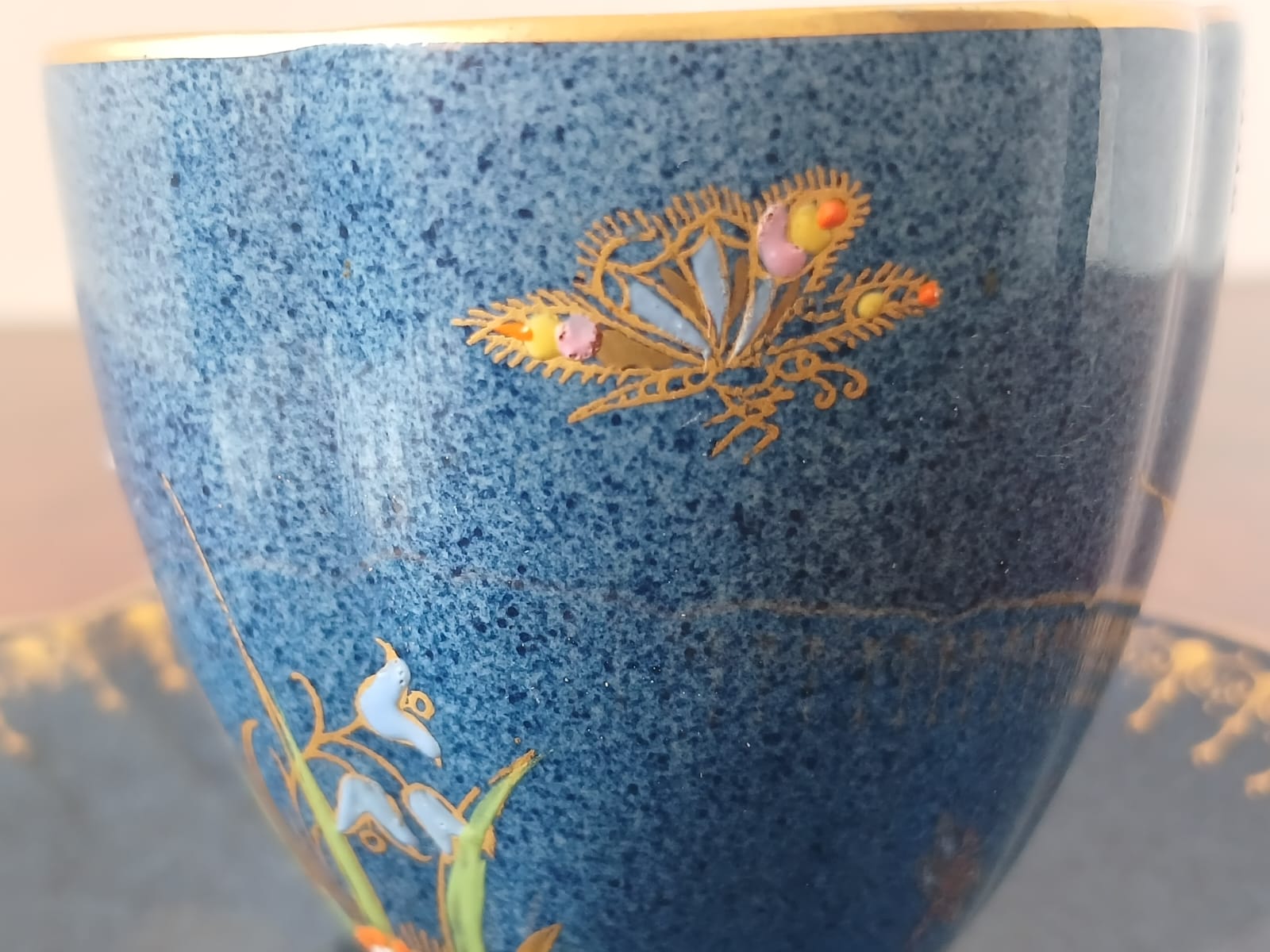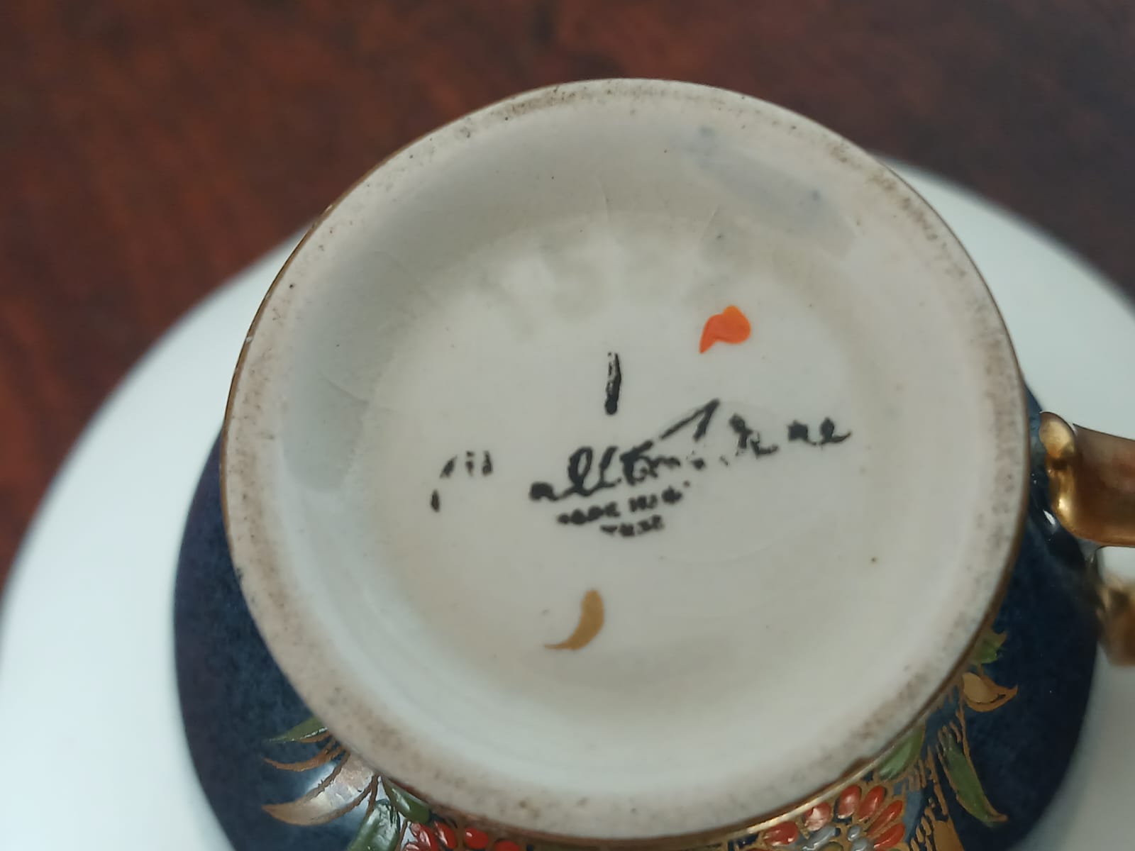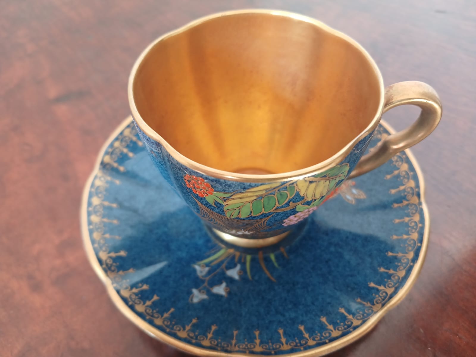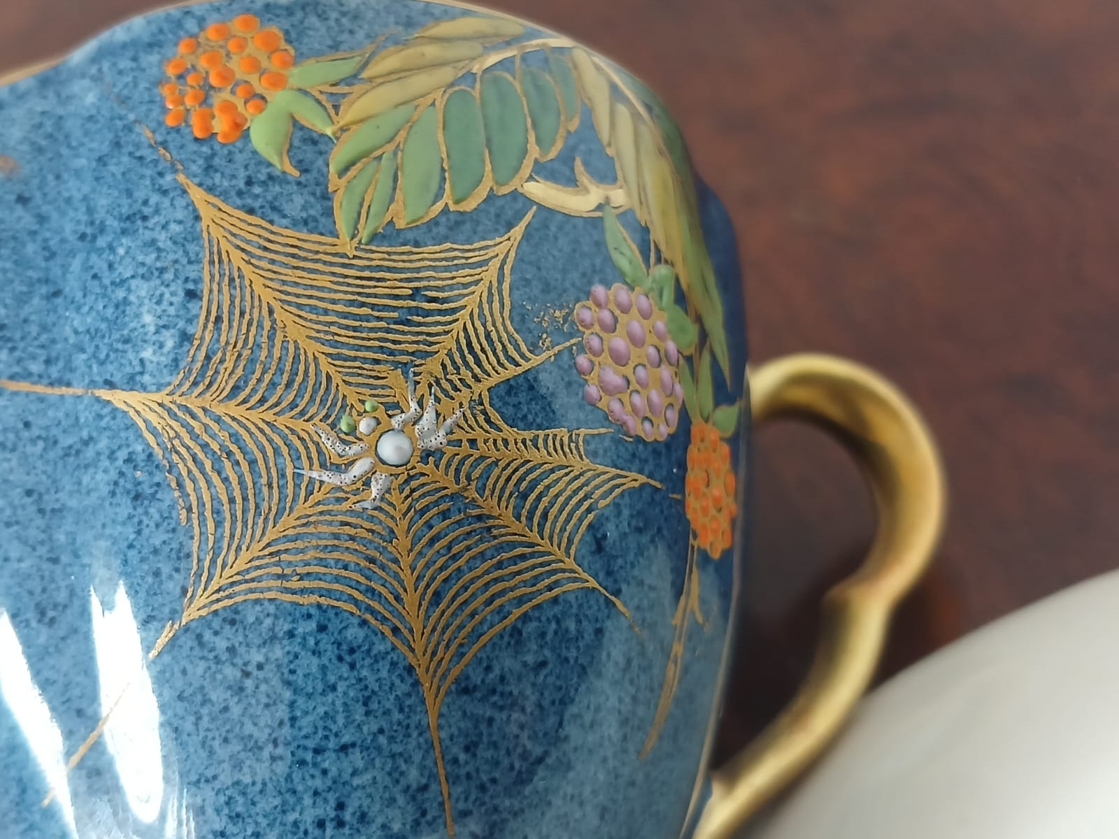 A striking hand-painted demitasse coffee cup and saucer set from Carlton Ware’s iconic “Spiderweb” Bleu Royale range, dating to circa 1940.