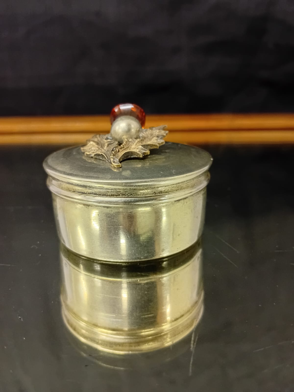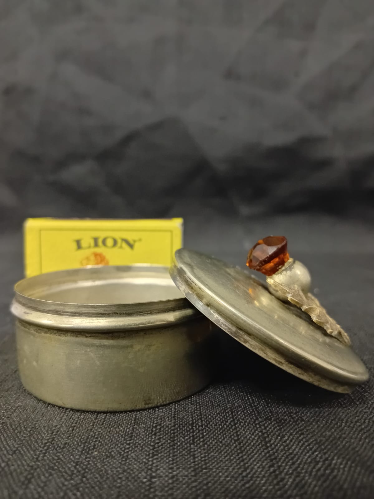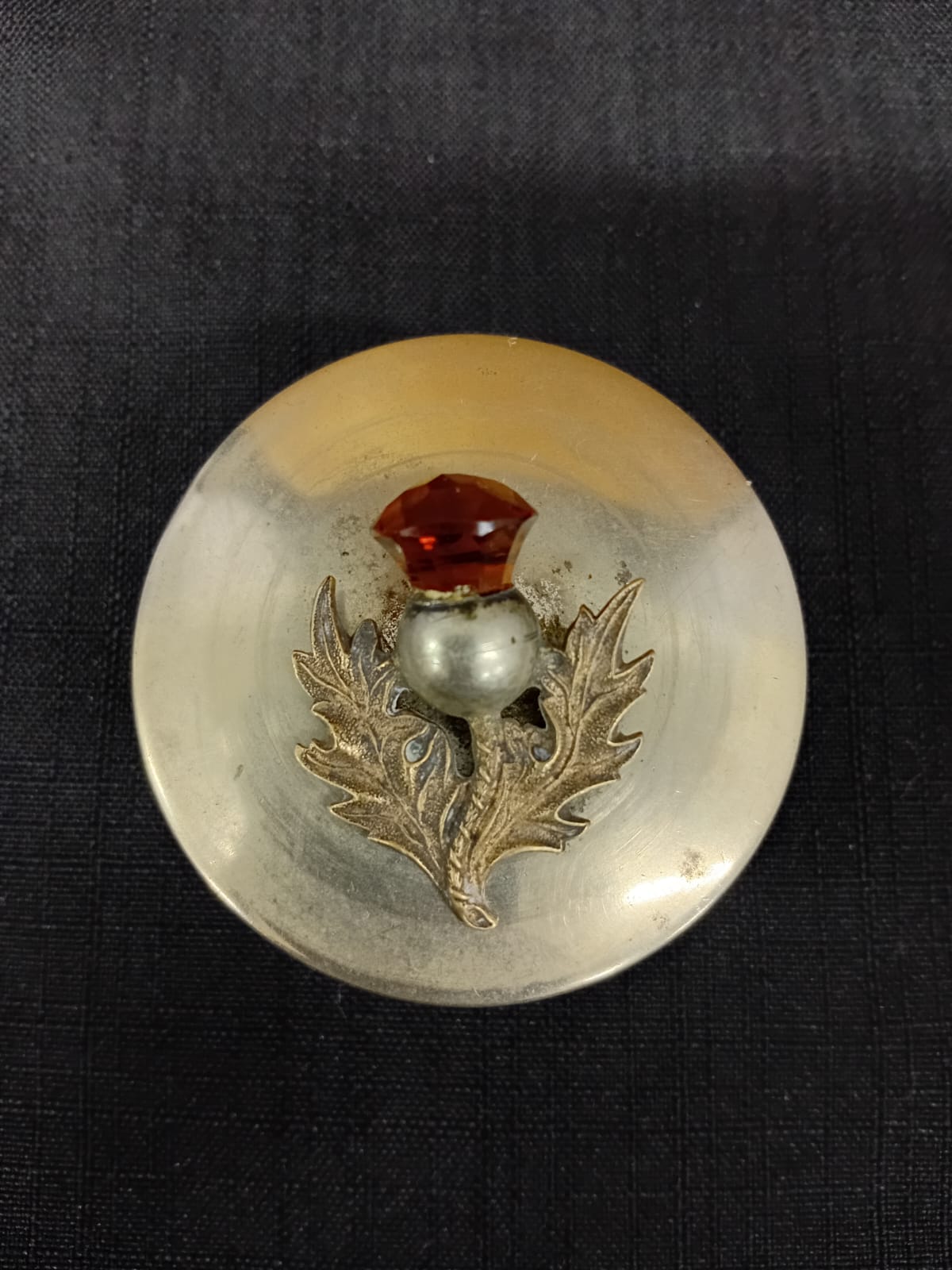 A small, decorative container adorned with intricate crafted thistle , symbolizing Scottish heritage. Crafted with a silver-plated finish, it exudes elegance and charm, making it ideal for storing small keepsakes, jewelry, or snuff. Its vintage appeal, making it a cherished collectible or gift.