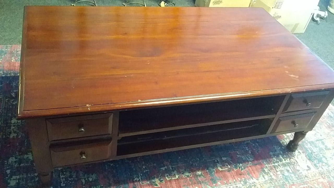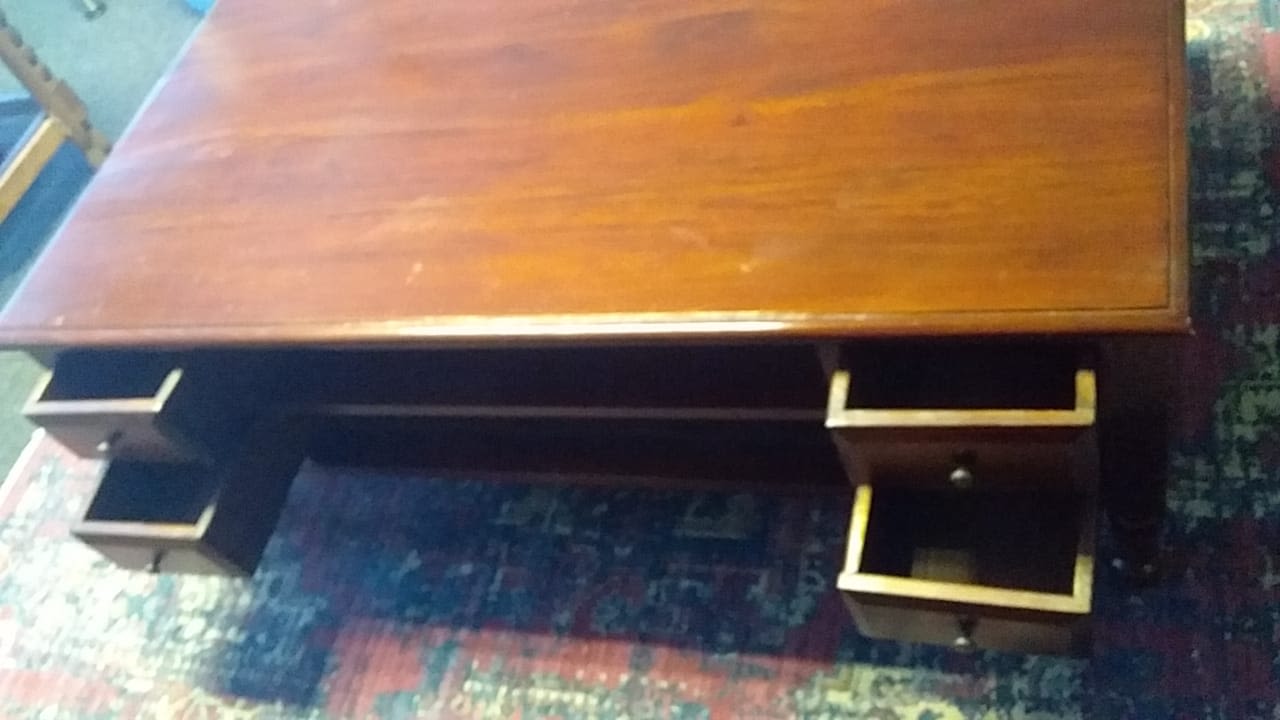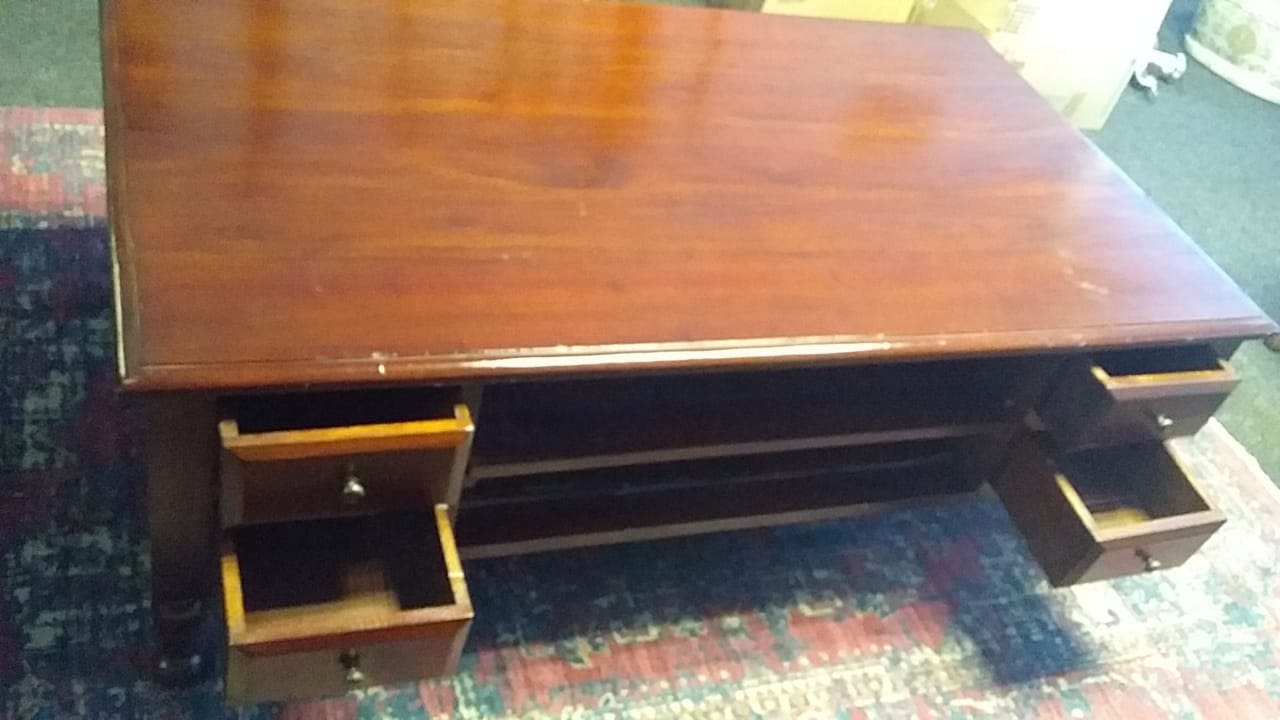 Solid Wood Magony Coffee Table with 8 Draws and 2 Large Comparments. Dimensions: 79cm x 140cm x 52cm