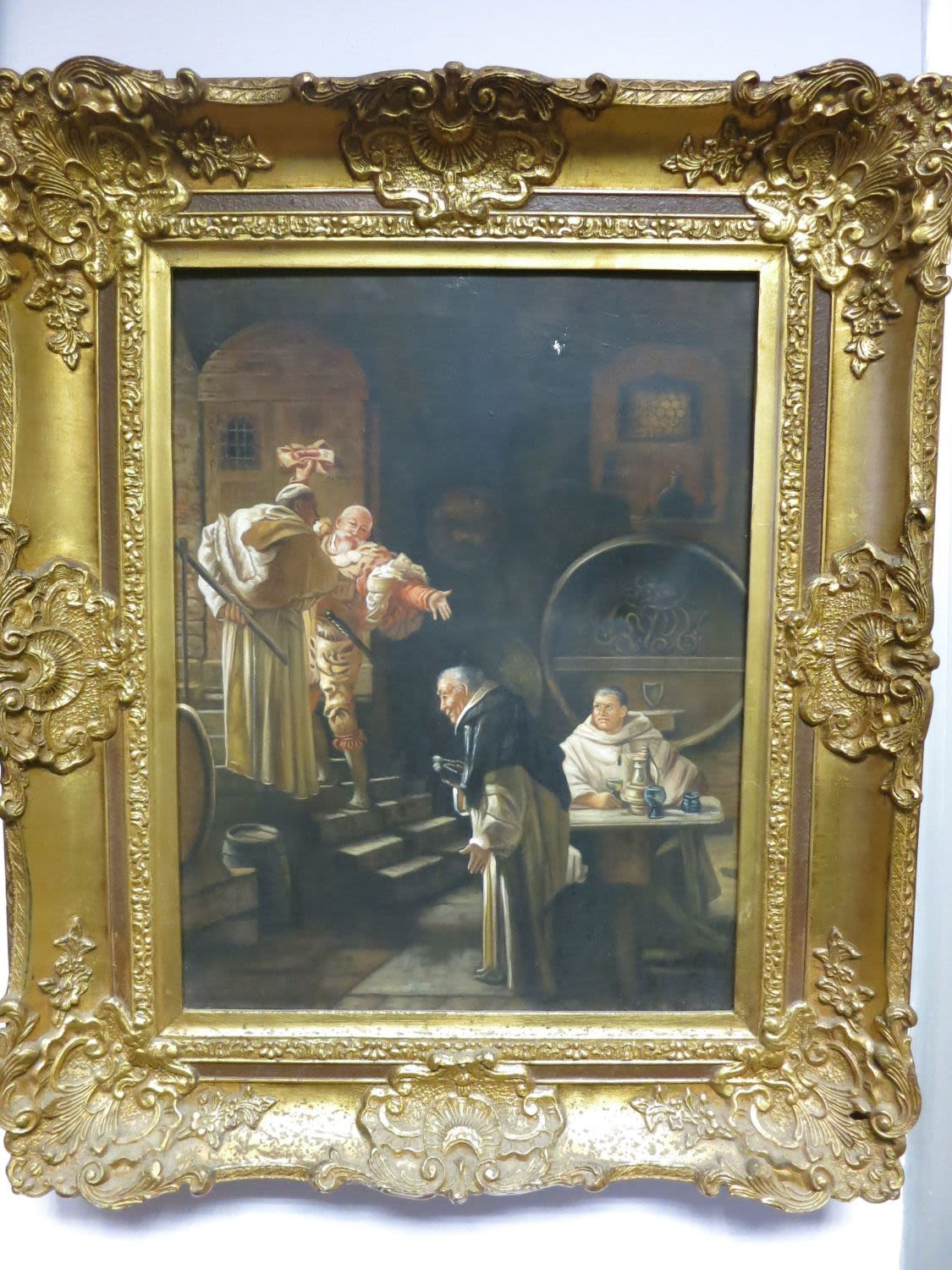 Fascinating Oil on Canvas of Men in Cellar in a Beautiful Gilt Frame Taking One's Imagination to a Bygone Era (Unattributed) Measures 56cm x 66cm