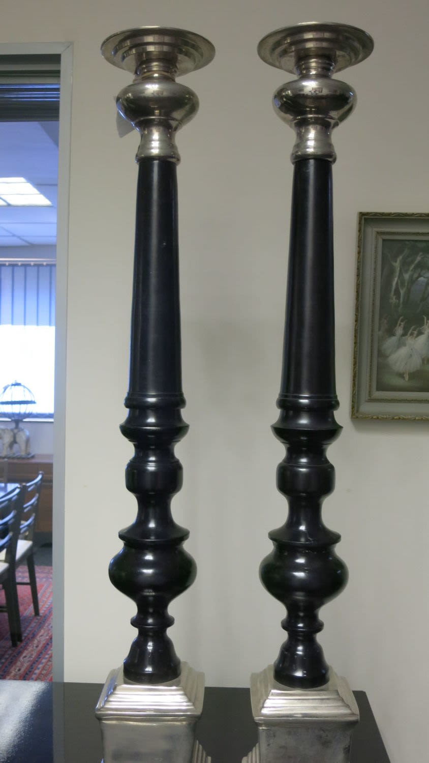 Bidding on a pair of black & chrome metal candlesticks (87cm tall)