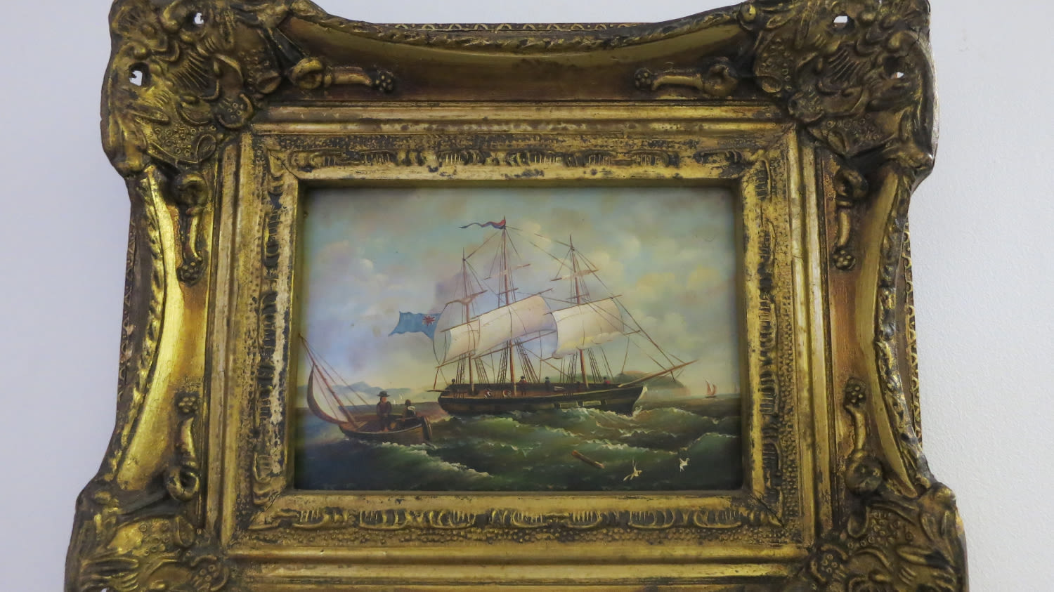 Oil painting on board depicting a ship with sail boats, on a choppy sea with seagulls in the foreground. 29cm x24cm in Frame