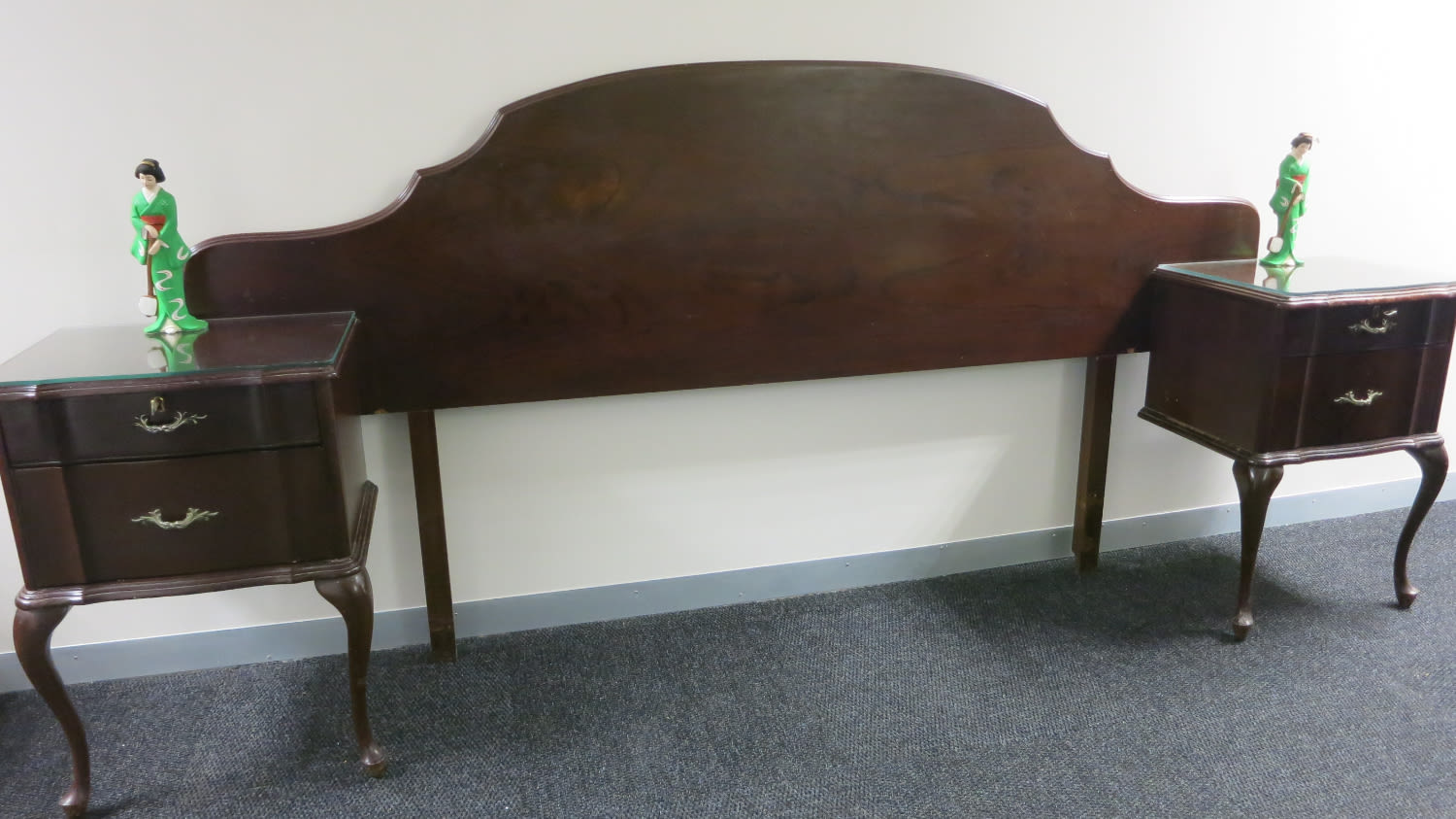 Glass on top of side tables, has keys and original handles. To Fit Queen Size. Dimensions: 242cm wide x 105cm high x 40cm depth (this is one piece of a whole bedroom suite that is on offer)