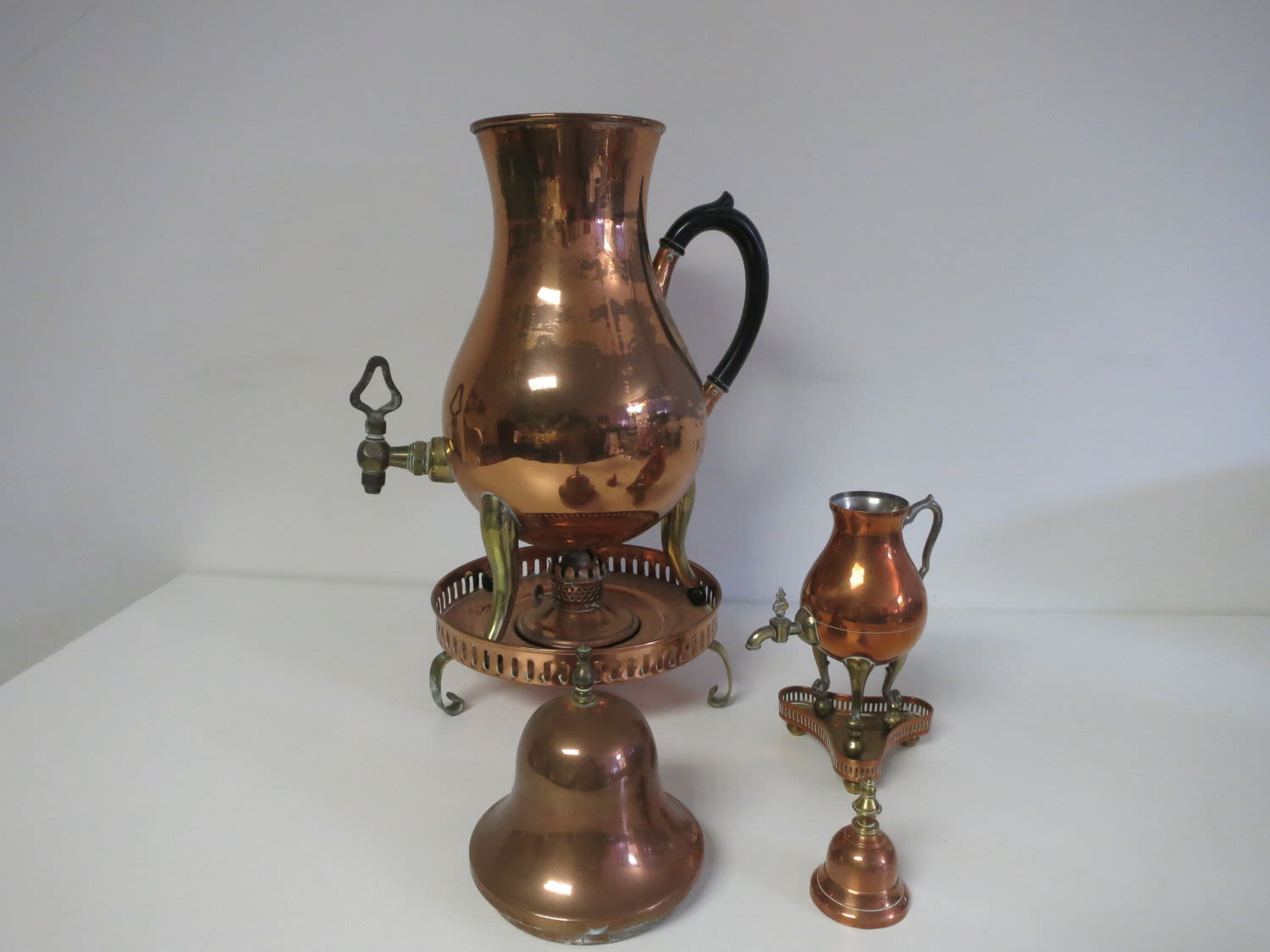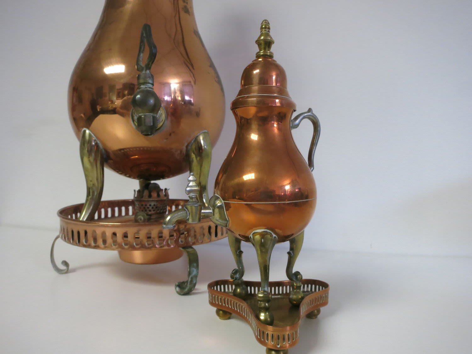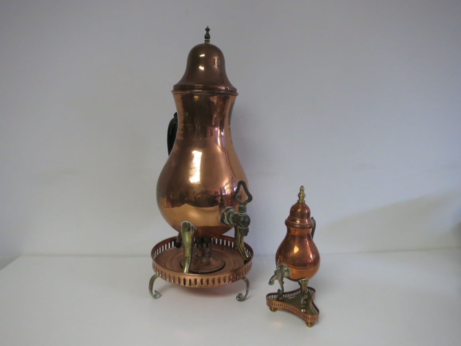 This pair of pear shaped samovars are rare. The large one comes with a burner while the smaller could be decorative or used for cold item. Highly collectable and a very rare shape. They are in good condition and have not been polished in a while