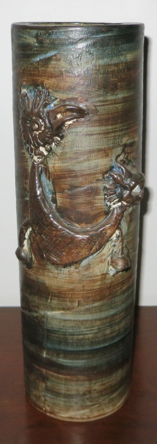 Very fascinating cylindrical ceramic vase with an applied adornment of a rooster. Hight 33cm