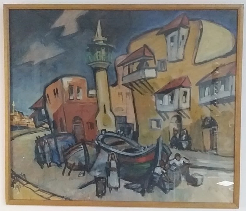 Delightful painting depicting life in a Mediterranean city, possibly Jaffa Dated 1953