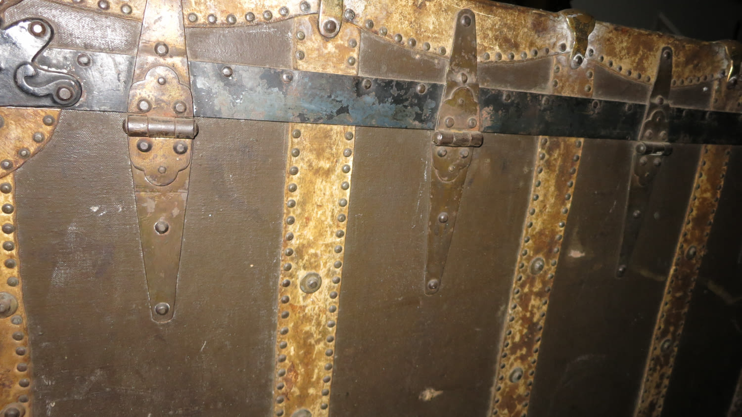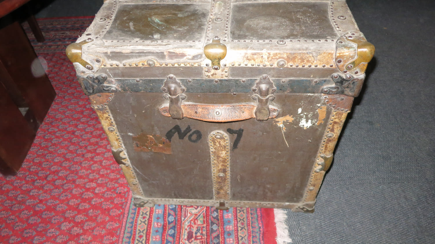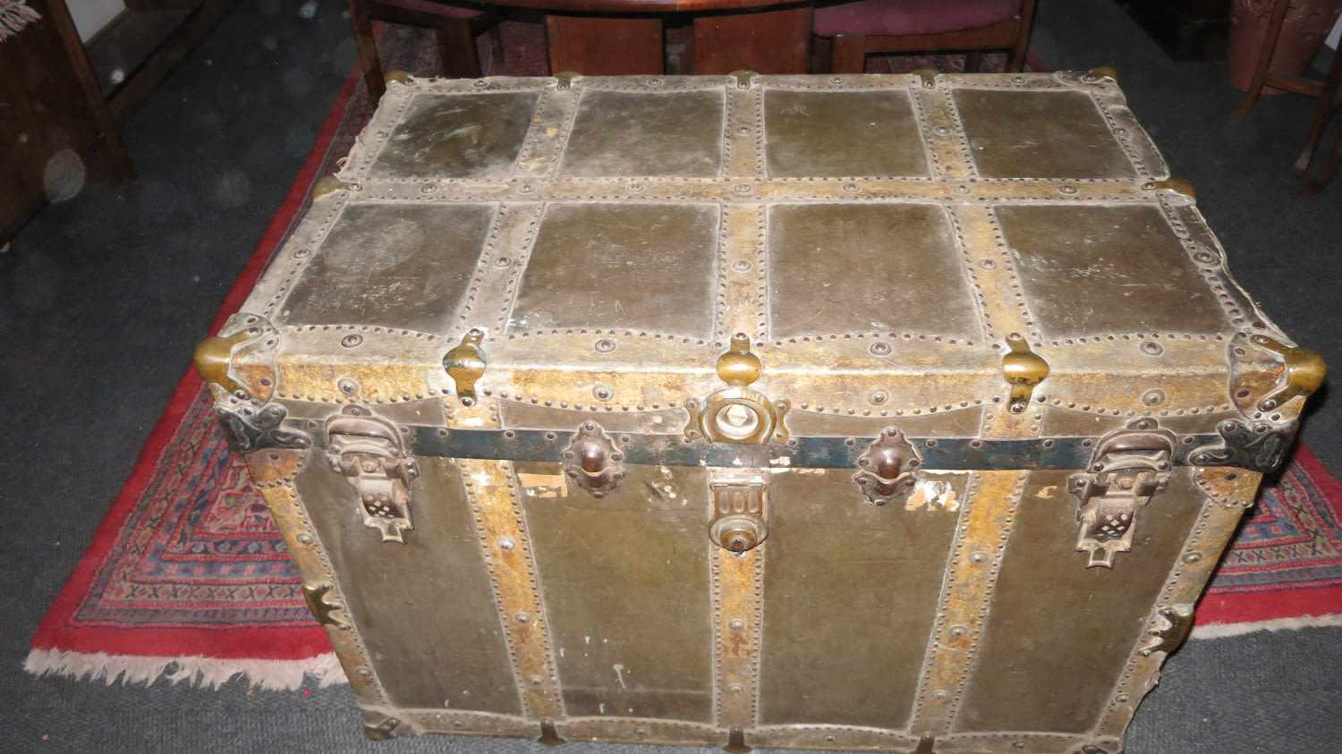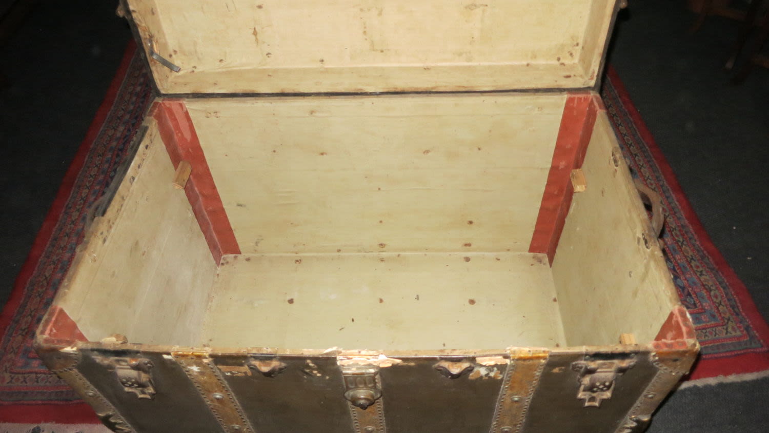 Sought after antique flat top steamer trunk, in original aged condition. It has signs of wear from ropes rubbing against it probably while on a wagon or ship for a long journey. The exterior is covered in a painted canvas that was initially put on to protect against water, this is held down by leather strips and riveted to the wooden body with brass corners for reinforcing. It still retains its authentic interior paper lining. The central latch was forced open at some time so it is unable to lock. This piece of furniture can be used for storage and as a table. Measurements 96cm L x 63cm B x 66cm H
