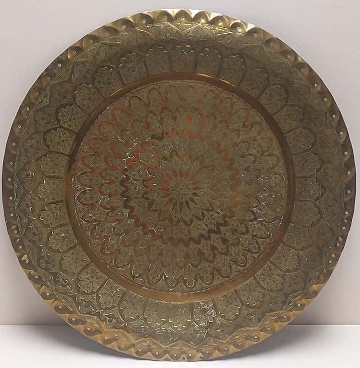This generous sized platter has an intricate pattern beaten into a brass sheet. A beautifully aged item that can be easily polished up to appear golden