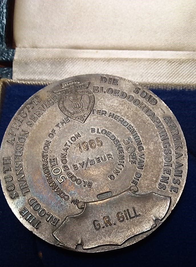 Silver Medal from the South African Blood Transfusion Service Awarded to Gordon Ronald Gill for his 50th Blood Donation - Artists Personal Memento