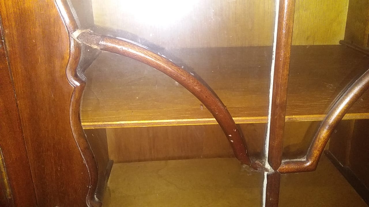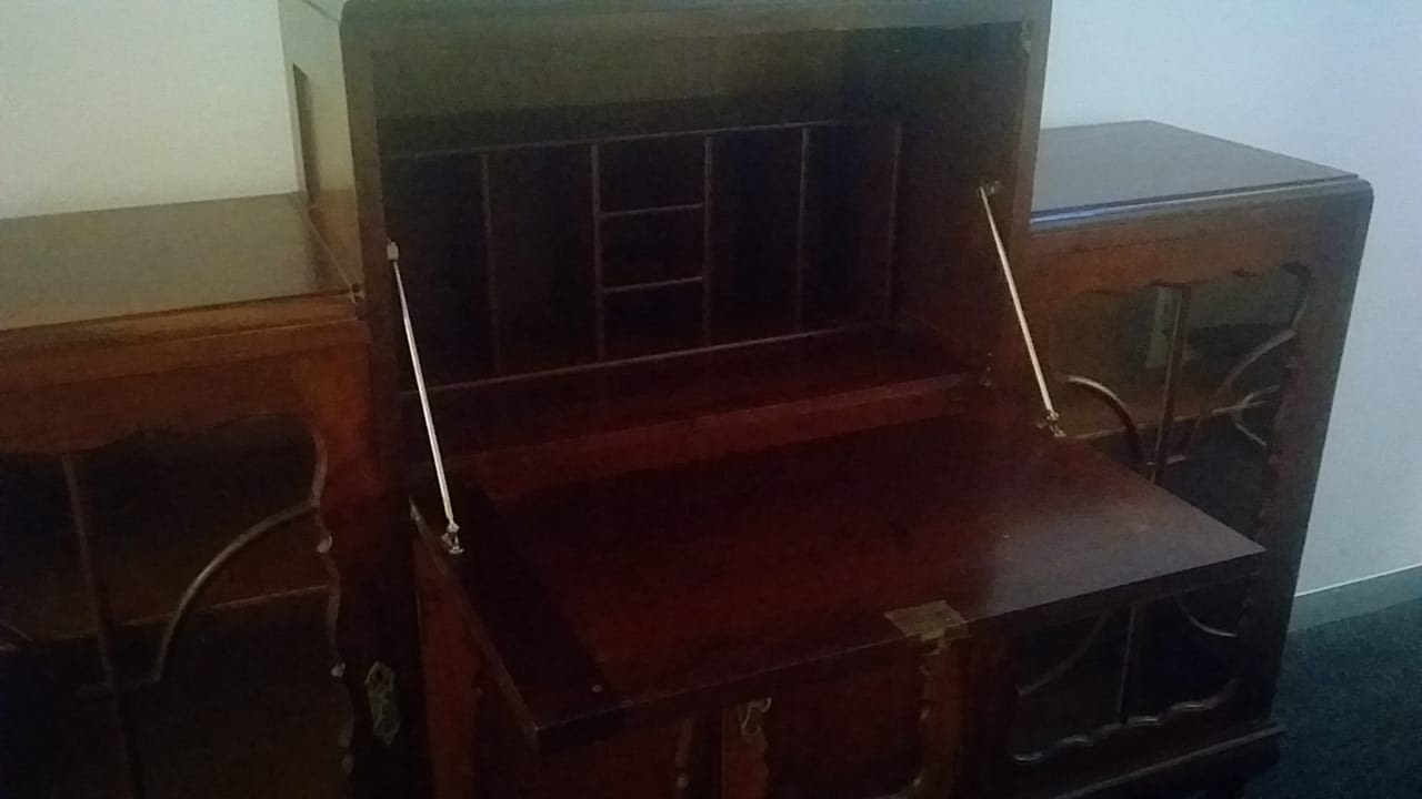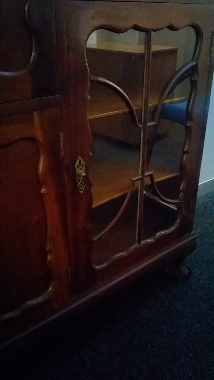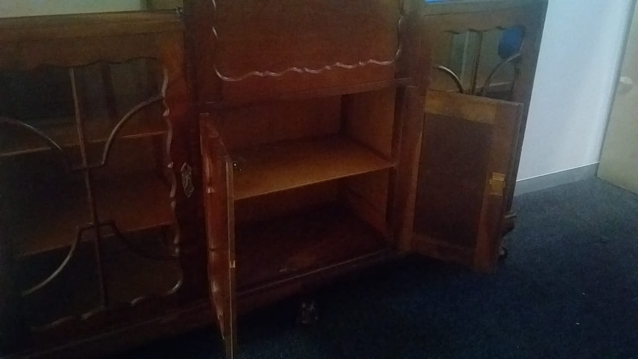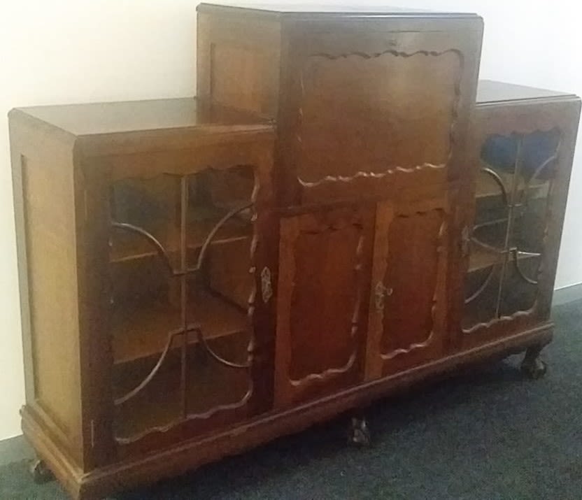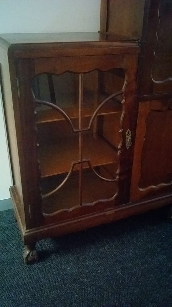 Includes a bureau cabinet with compartments, a cupboard and 2 display cupboards. This could easily be adjusted into a liquor cabinet. Condition is reasonable but with issues, please view images or come in to view.
