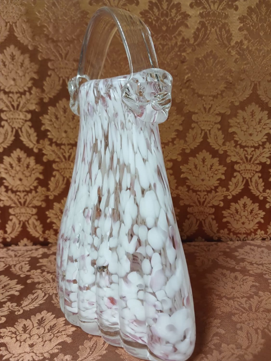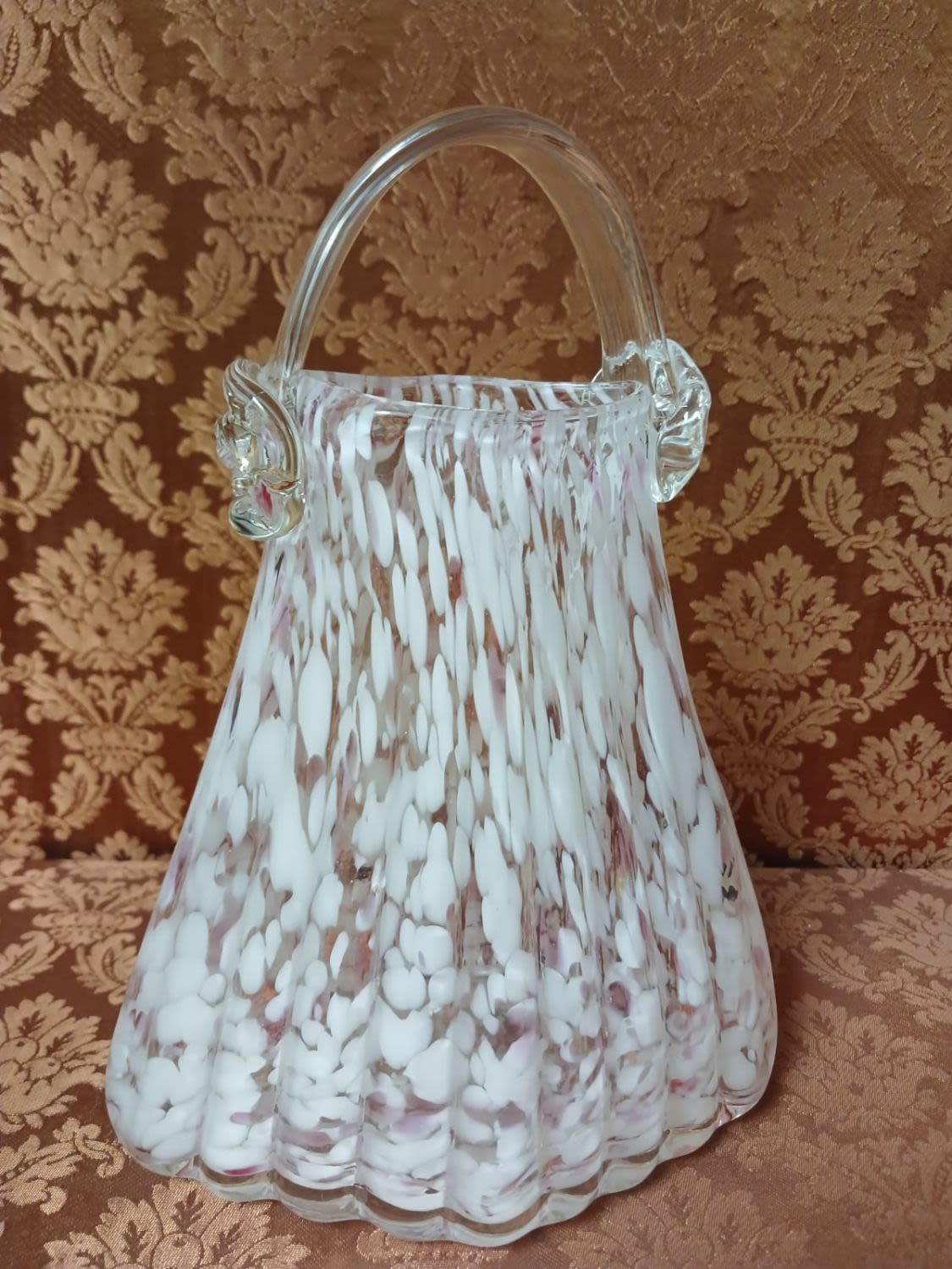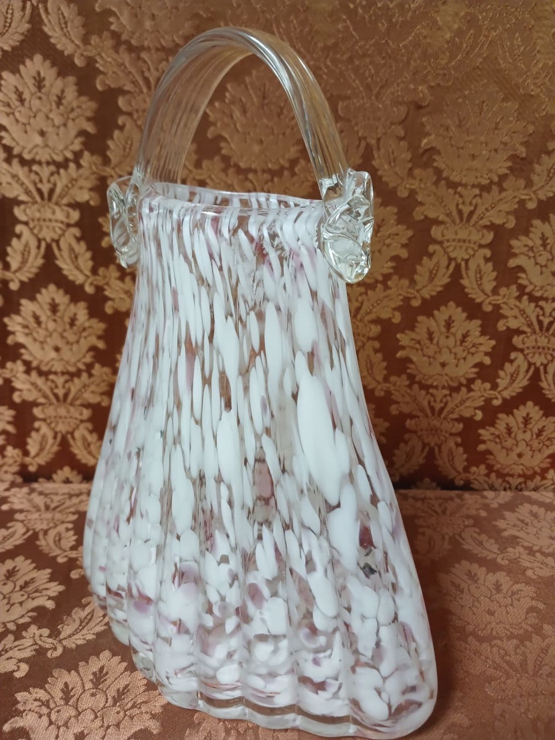 Vintage Handblown Art Glass Handbag Shaped Vase with Pink and White Confetti-Like Speckles Made in Laguna Murano - STC