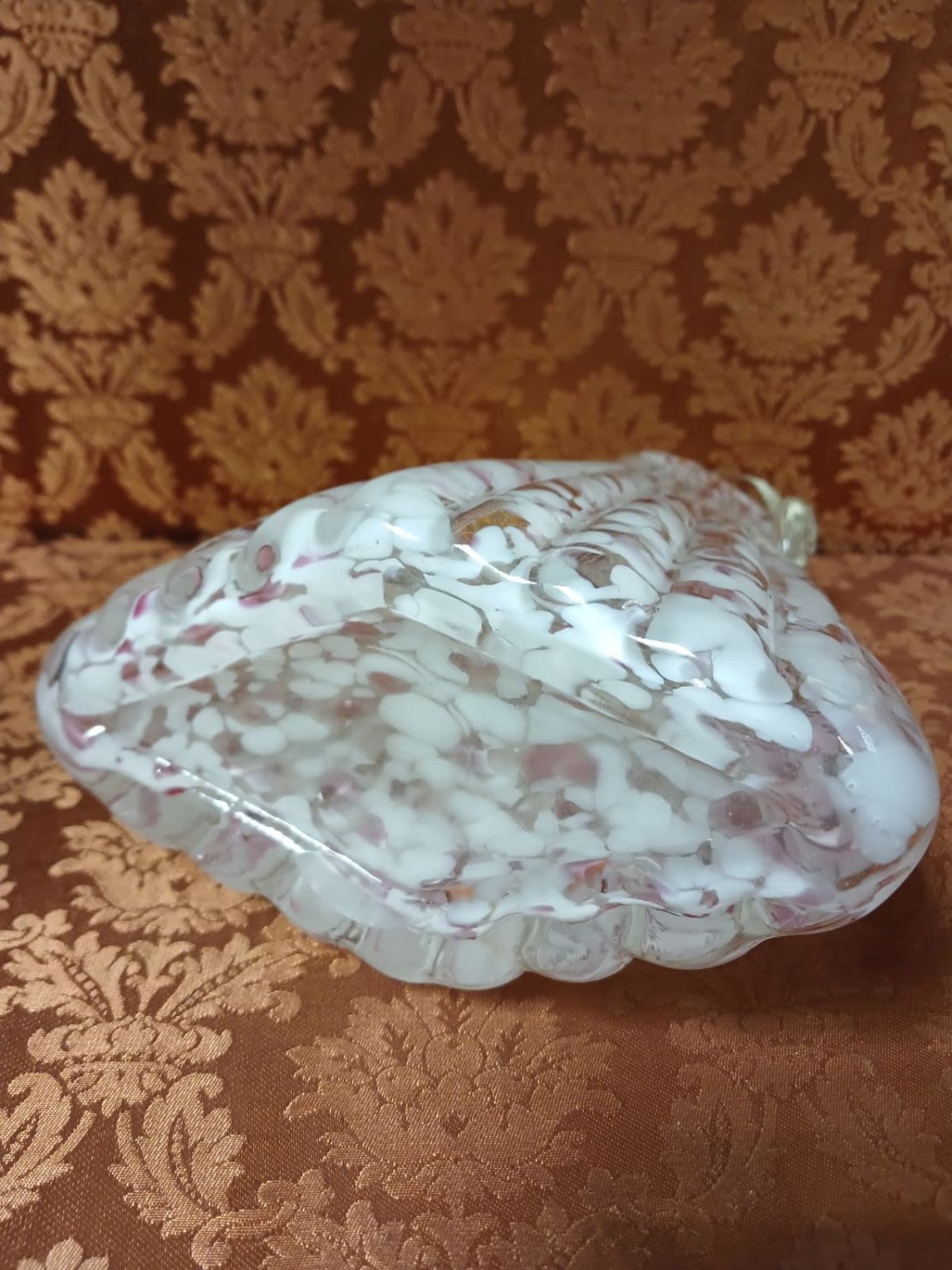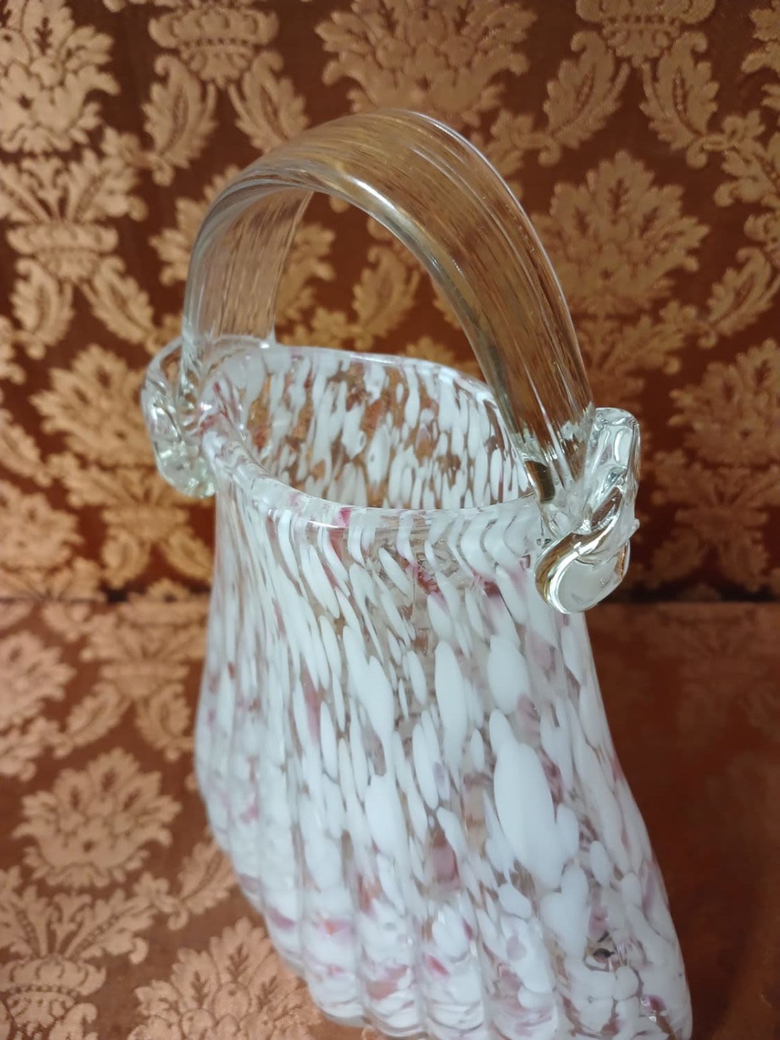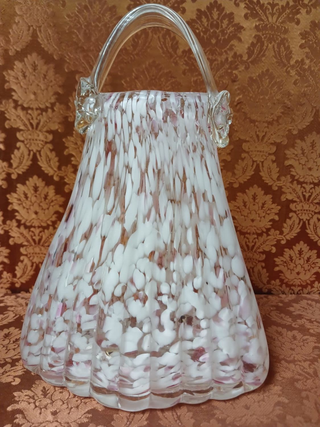 Vintage Handblown Art Glass Handbag Shaped Vase with Pink and White Confetti-Like Speckles Made in Laguna Murano - STC