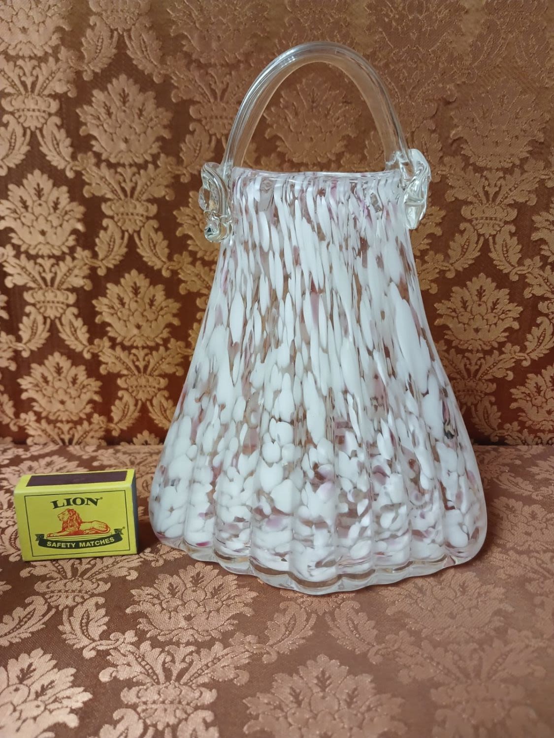 An elegant glass handbag shaped vase with a stunning white and pink design. This exquisite piece is perfect for adding a touch of sophistication and charm to any space. Crafted with precision, the vase showcases a delicate blend of white and pink hues, creating a visually captivating pattern that effortlessly complements any décor style. Whether used as a centerpiece or a standalone decorative item, this vase is sure to enhance the beauty of your home or office. Its sleek and timeless design makes it an ideal gift for any occasion.