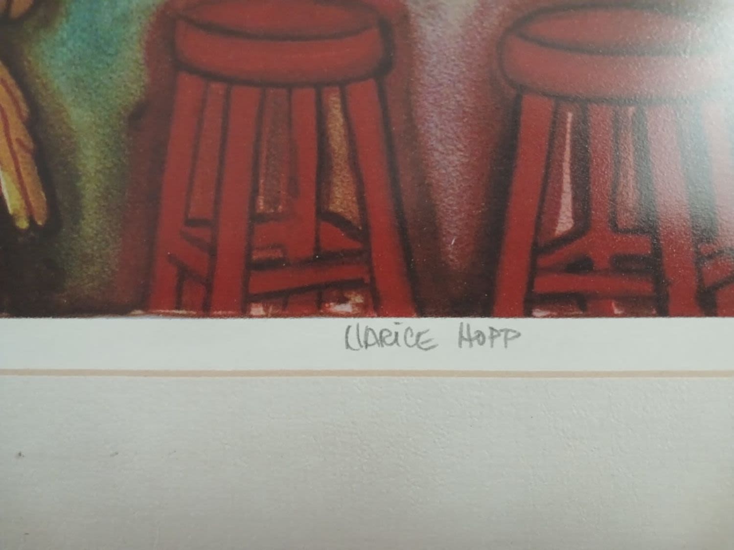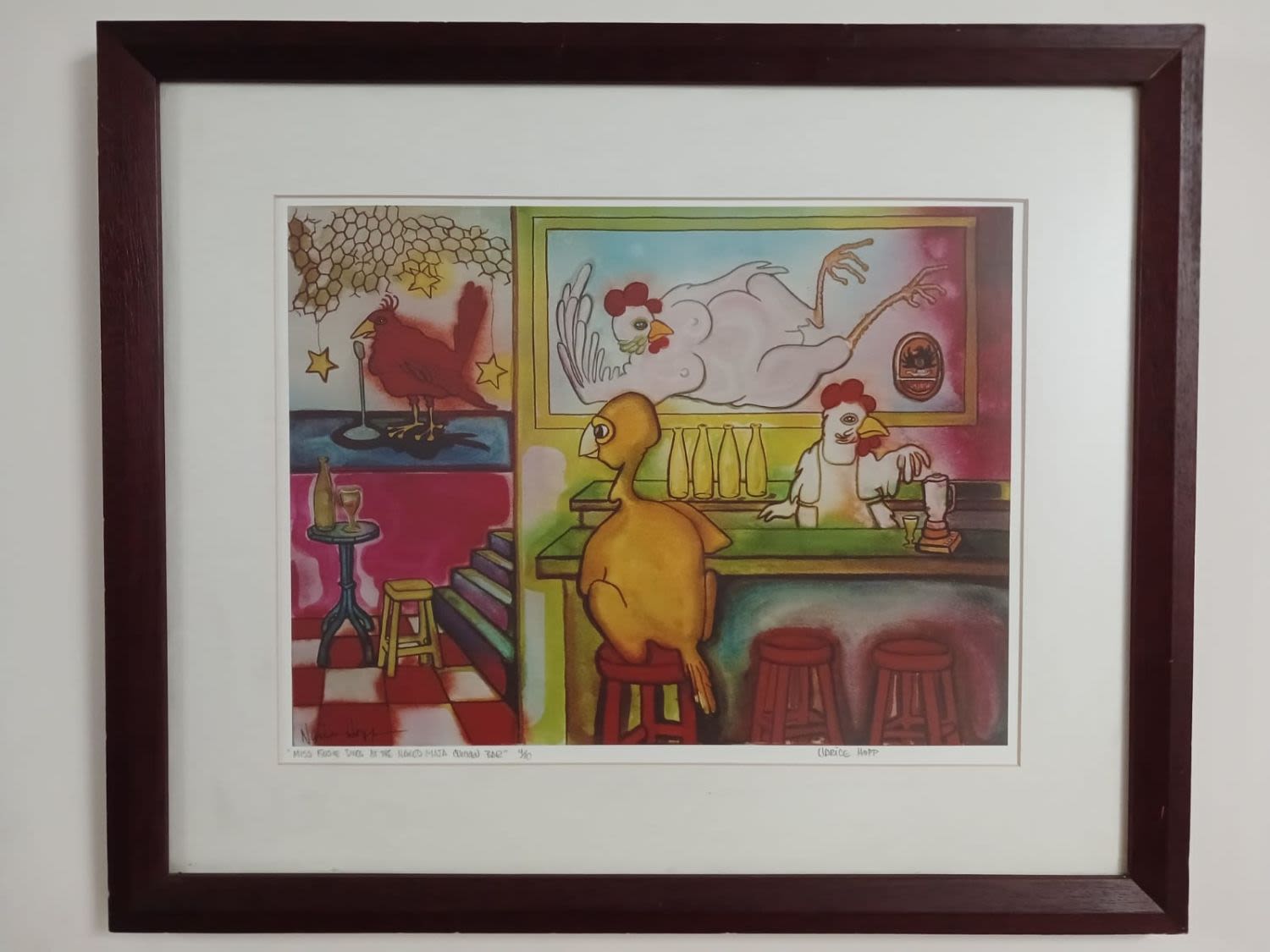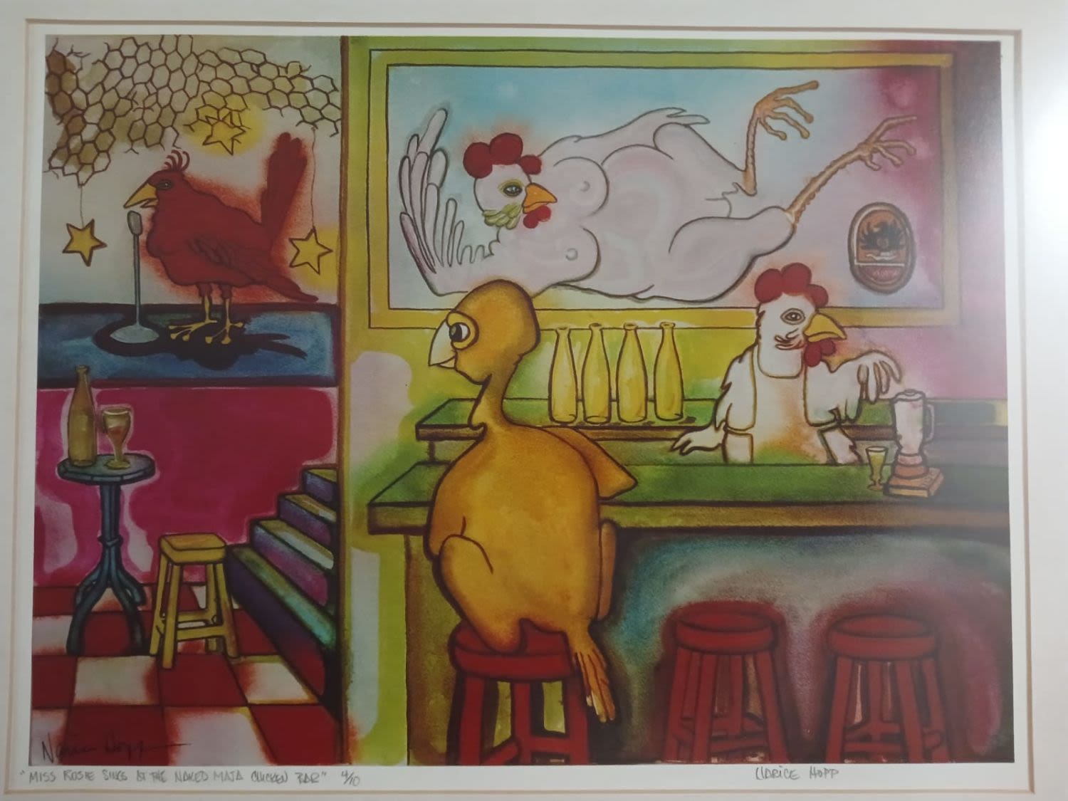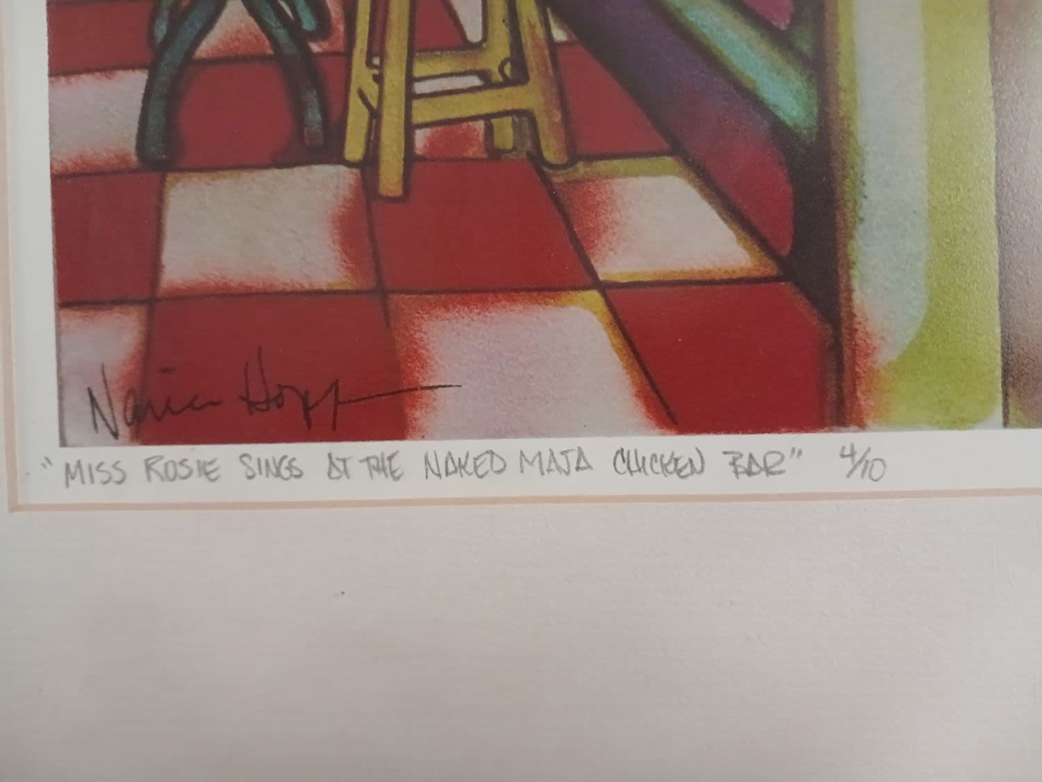 REDUCED: "Miss Rosie Sings at the Naked Maja Chicken Bar" Labeled and Signed Print By American Artist Narice Hopp 4/10. Framed (60cm x 50cm) and Behind Glass.