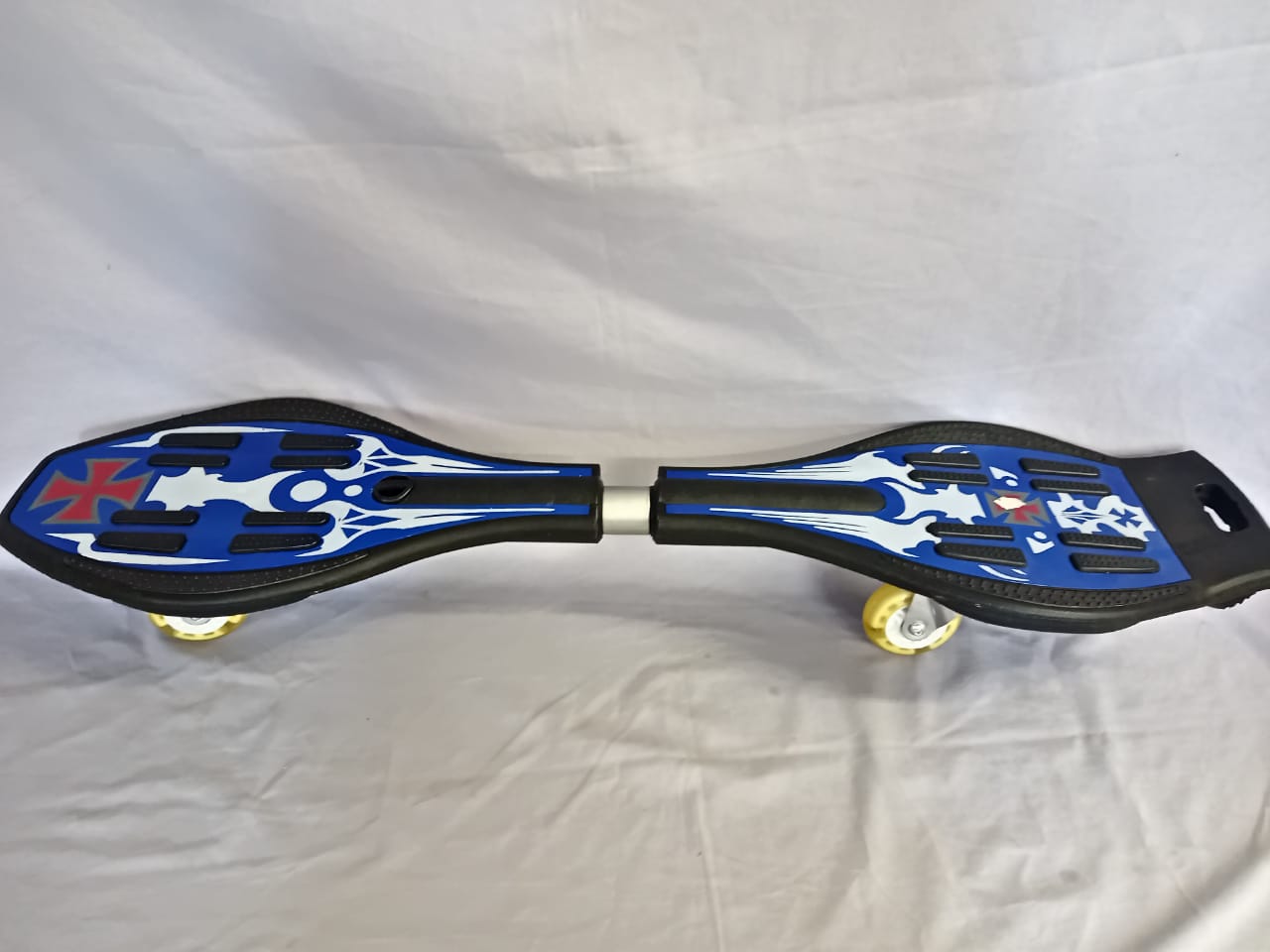 Known as a snakeboard or waveboard, created for riding on smooth surfaces. It consists of two platforms connected by a pivoting mechanism, allowing for a unique side-to-side motion that mimics surfing or snowboarding. Riders shift their weight to steer and propel themselves forward, making it popular for both tricks and casual riding. The design includes grip tape on the platforms and wheels that enable smooth movement.