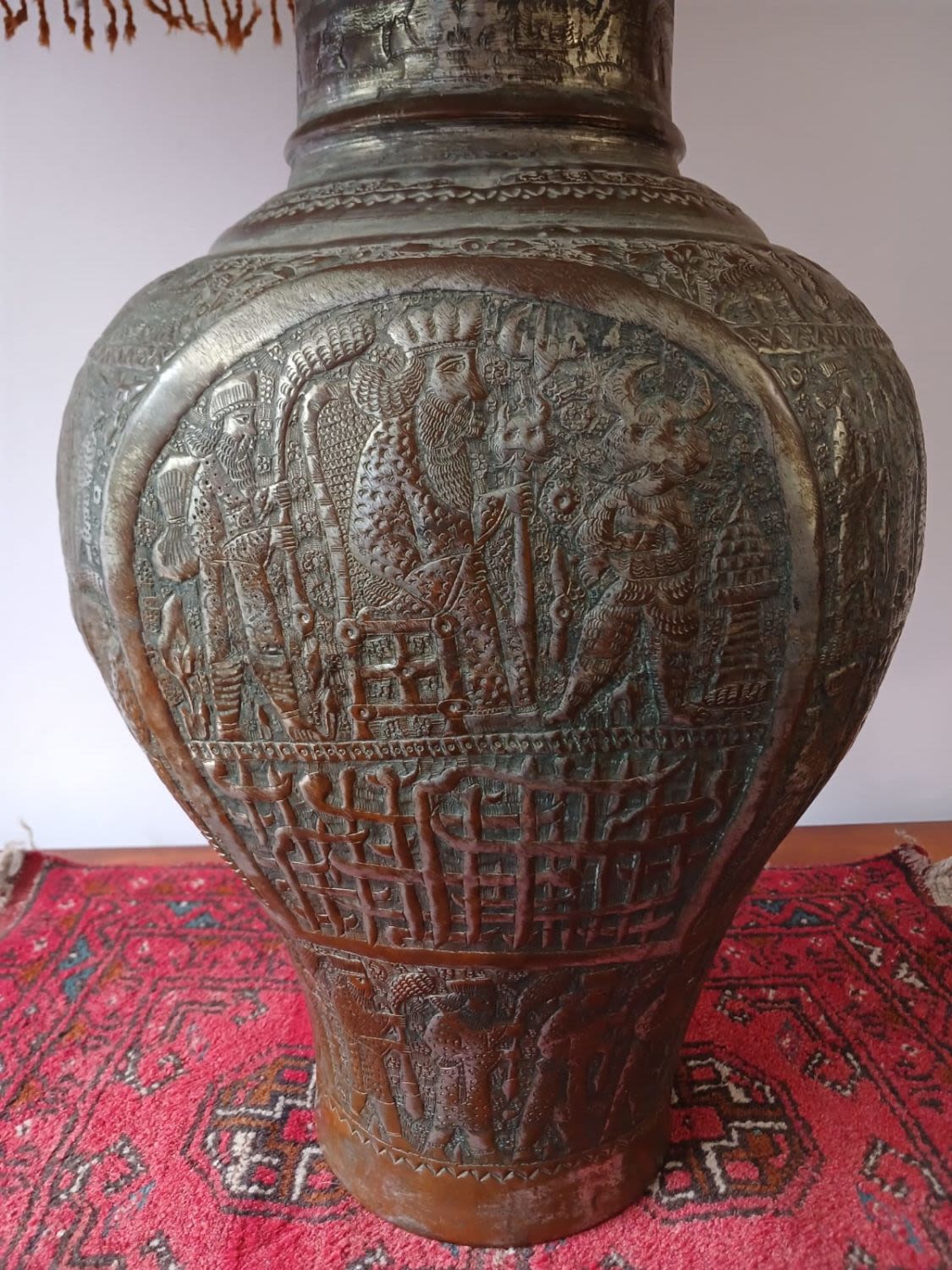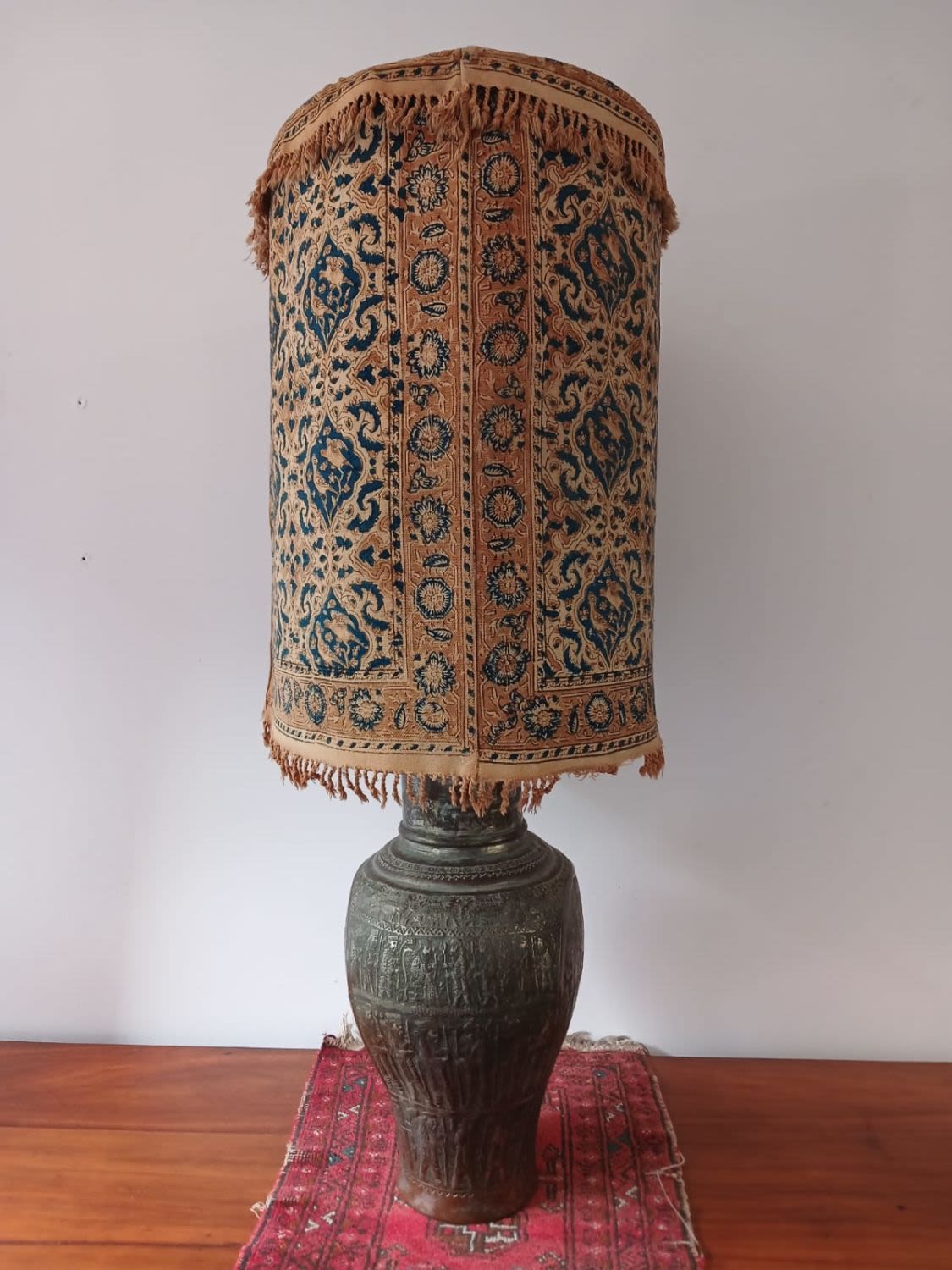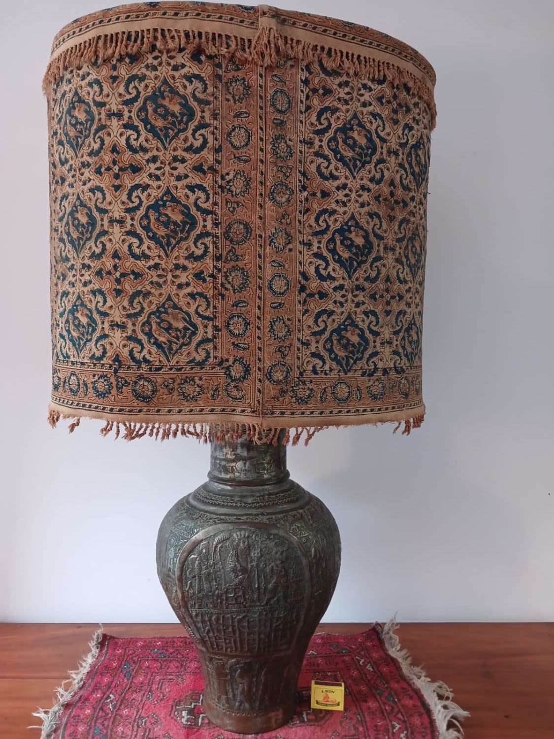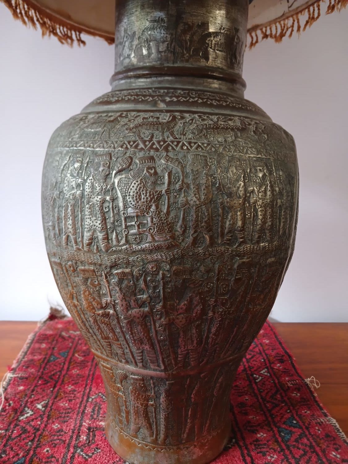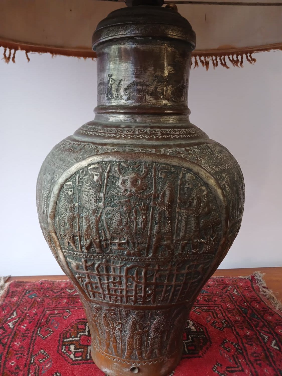 This large antique lamp with a captivating blue shade is sure to catch the eye of any discerning collector. The exquisite repousse urn featuring a king and subjects showcases the timeless beauty of craftsmanship. The old tinned copper vase features intricate carvings that add a touch of romantic history and sophistication to any space. With its rich past and cultural significance, this piece serves as a captivating centerpiece or a unique addition to any collection. This urn as been converted into an electric lamp but the electrical components should be replaced. The antique charm of this lamp, combined with its shade (that appears as a Persian carpet), creates a mesmerizing ambiance that will enhance any room with a touch of sophistication.