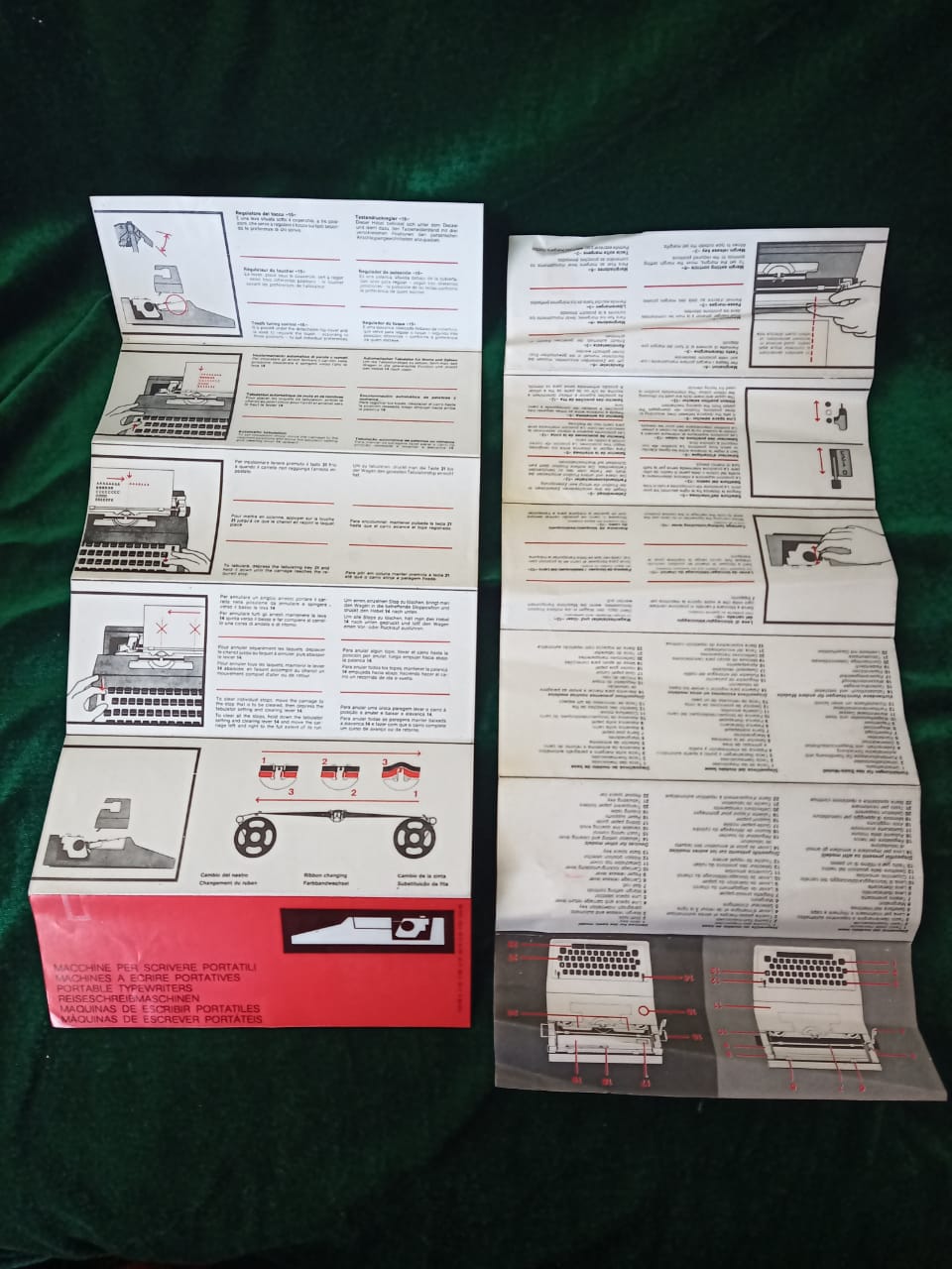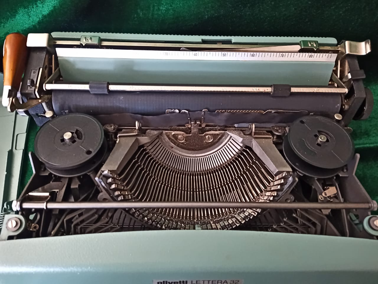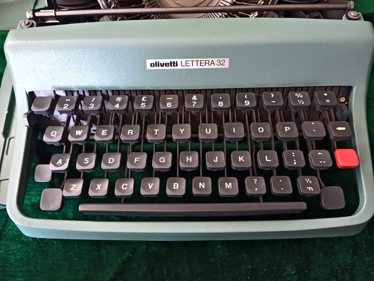 The typewriter’s body is a distinctive blue-green hue, a stylish and somewhat muted color that stands out without being overly flashy. The keyboard layout is standard QWERTY, with rounded , black keys that have white lettering. Each key has a satisfying tactile response, a hallmark of Olivetti’s design along with two user manuals.