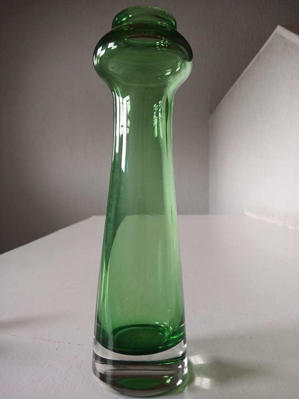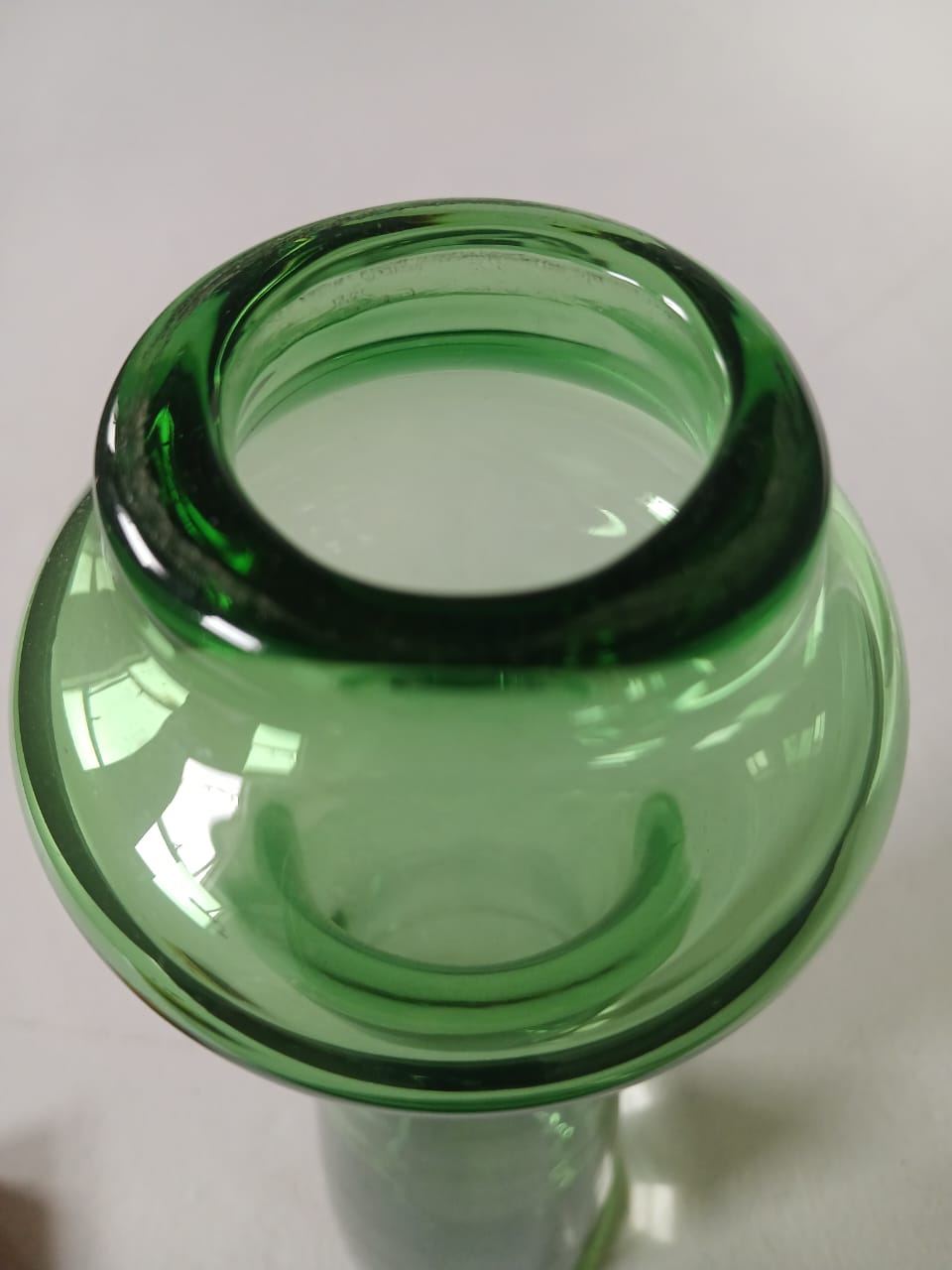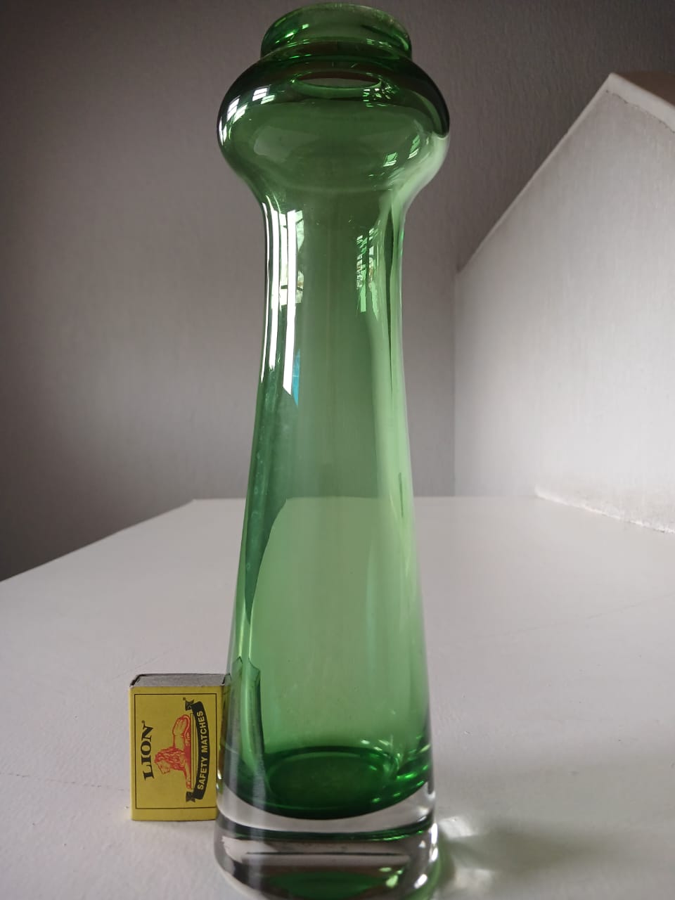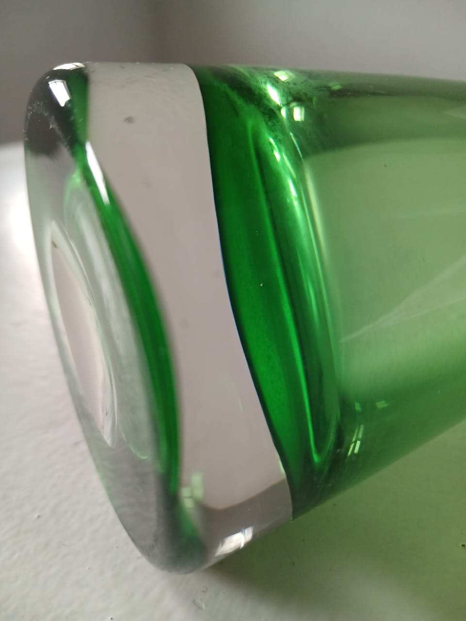 A beautiful cased glass mint green vase, expertly shaped for a hyacinth. The soft mint green glass is encased in clear glass, creating a striking visual effect. The vase stands 28.5cm high with a diameter of 8cm and is in excellent condition, free from chips or scratches. Its elegant design and craftsmanship suggest it may be Murano, adding to its charm and appeal as a unique decorative piece.