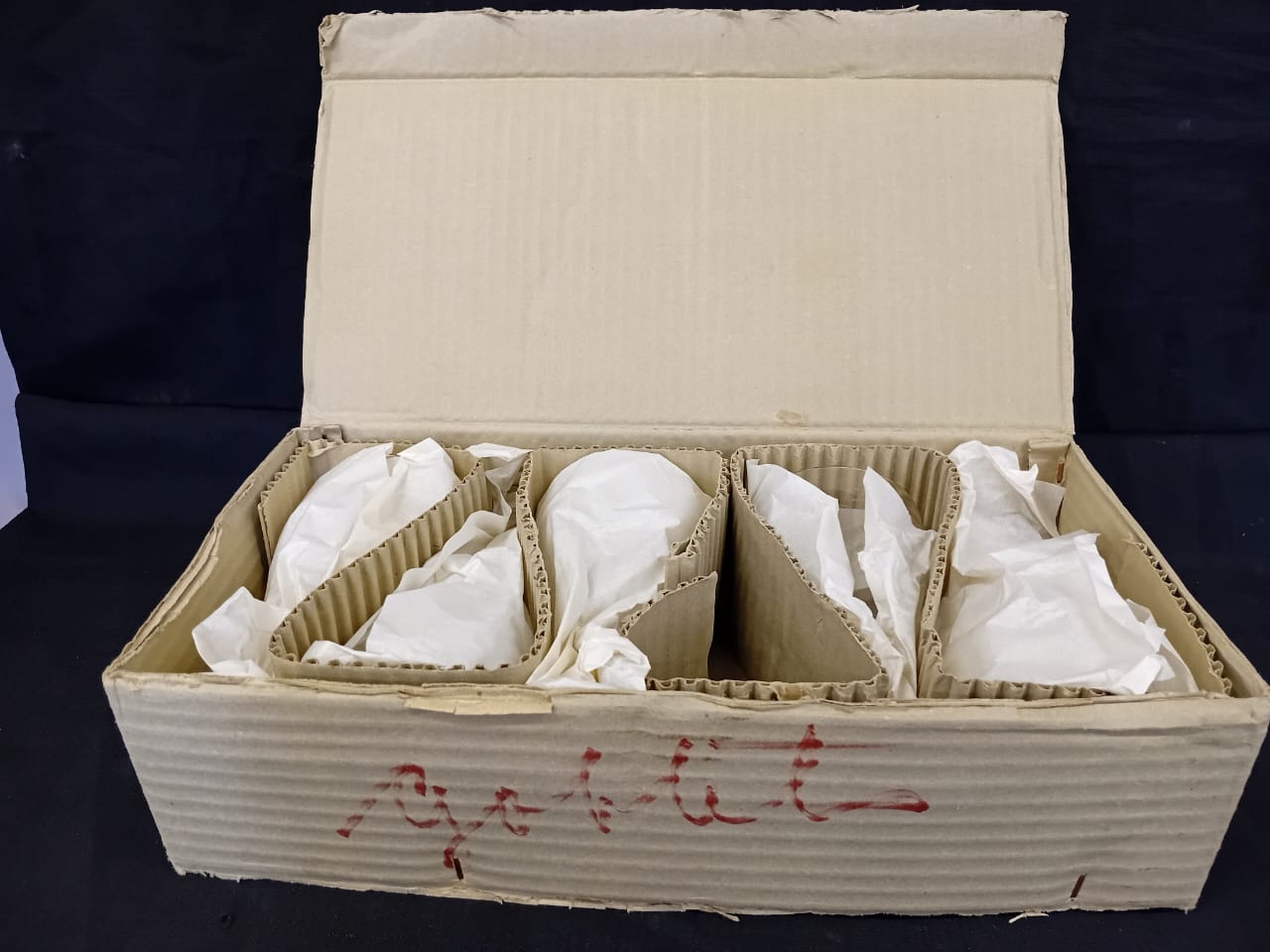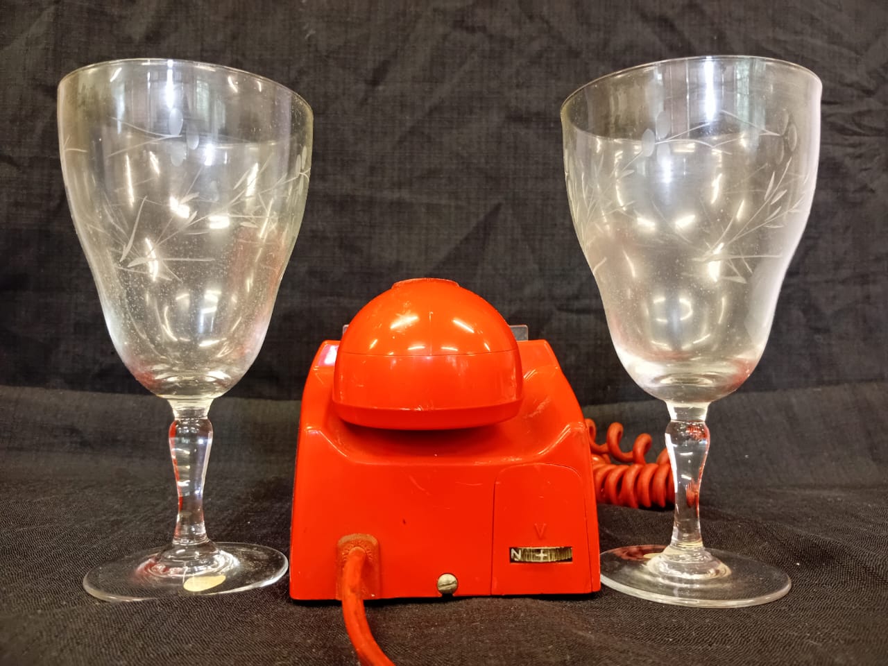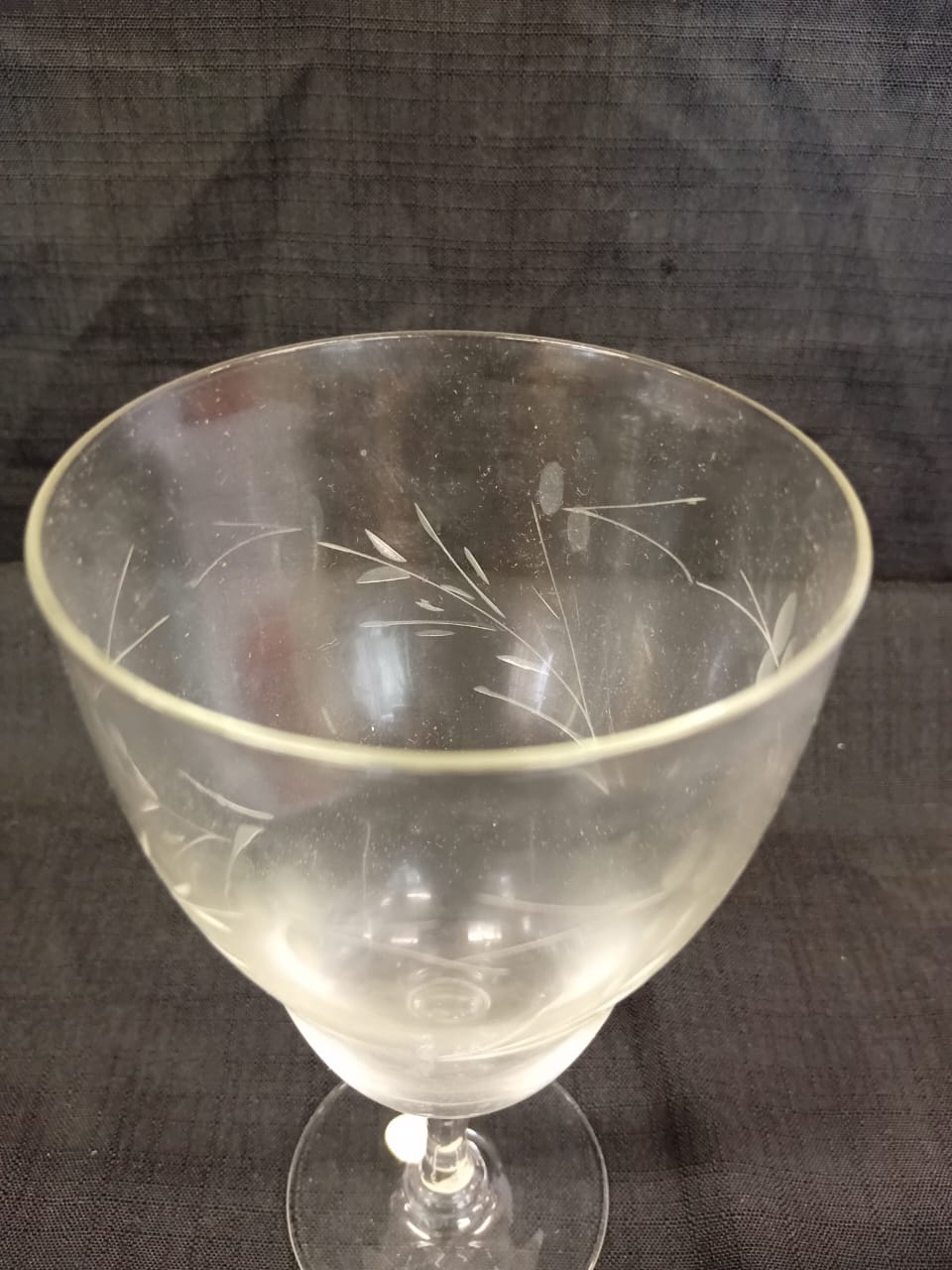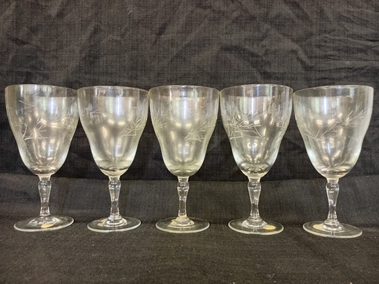 These five etched glass goblets feature intricate, delicate designs that showcase fine craftsmanship. Each goblet has a wheat pattern etched on it, adding a touch of elegance to any table setting, with a slight variation in each glass showing the hand crafted element.